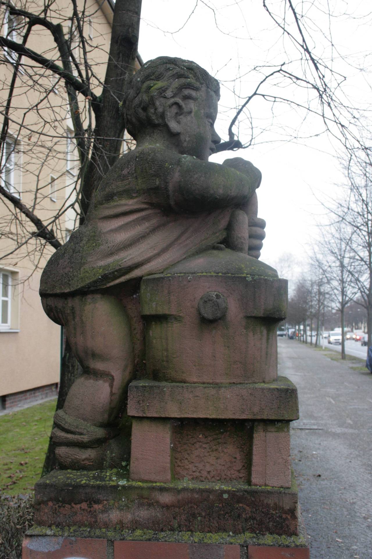 Auf dem aus roten Klinkern aufgemauerten Pfeiler über quadratischem Grundriss steht über quadratischer Plinthe die aus rotem Sandstein gearbeitete Skulptur eines Metzgerjungen (Fleischerjungen), der nur mit einem kurzen Kittel bekleidet ist und dessen Gesäß weitgehend bloßliegt. Er steht hinter einem gewaltigen, auf einem vierbeinigen Unterbau aufgebauten Wursttrog. Aus der dort drin befindlichen Fleischmasse formt der Knabe Würste (Jörg Kuhn).