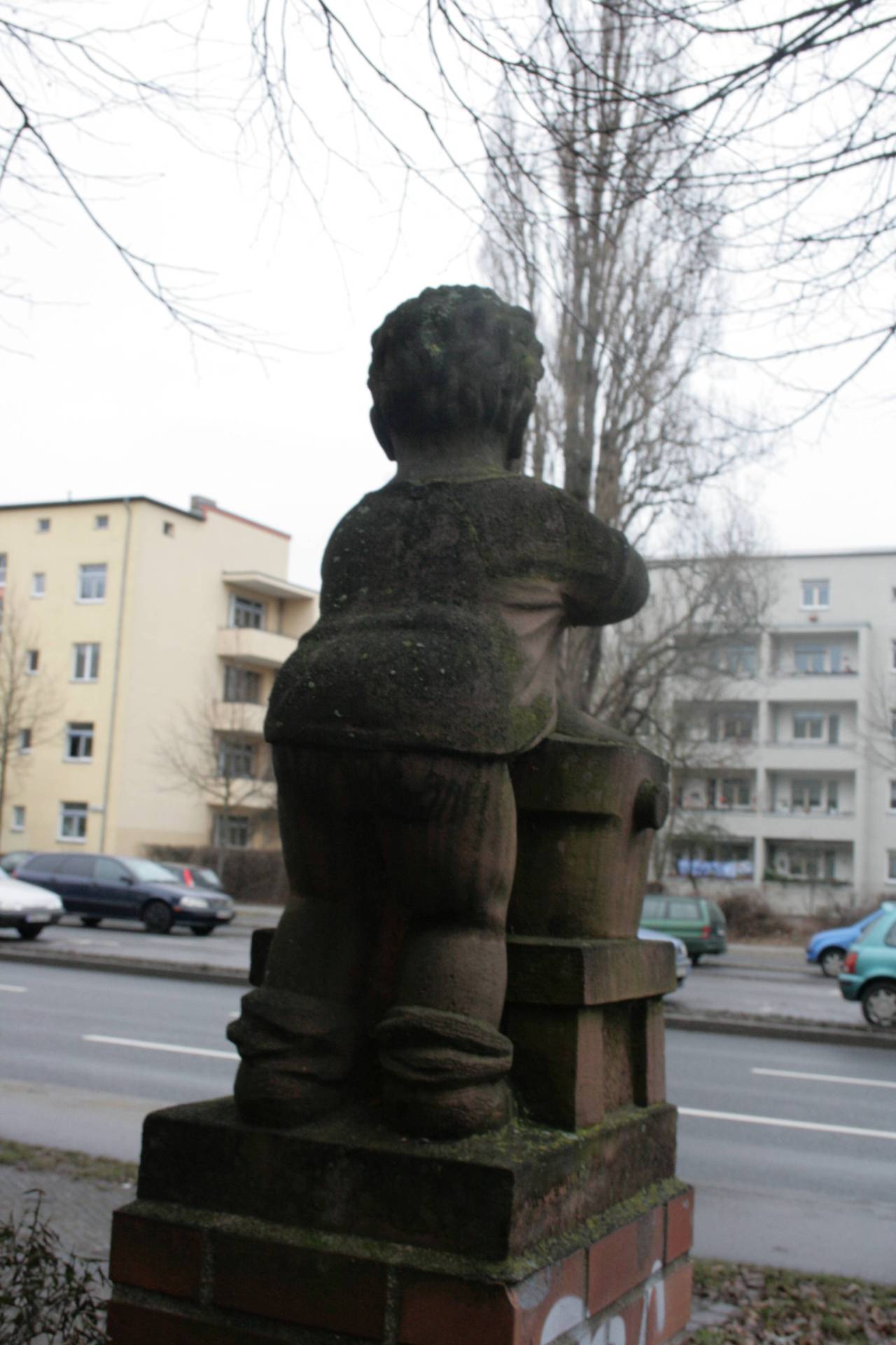 Auf dem aus roten Klinkern aufgemauerten Pfeiler über quadratischem Grundriss steht über quadratischer Plinthe die aus rotem Sandstein gearbeitete Skulptur eines Metzgerjungen (Fleischerjungen), der nur mit einem kurzen Kittel bekleidet ist und dessen Gesäß weitgehend bloßliegt. Er steht hinter einem gewaltigen, auf einem vierbeinigen Unterbau aufgebauten Wursttrog. Aus der dort drin befindlichen Fleischmasse formt der Knabe Würste (Jörg Kuhn).