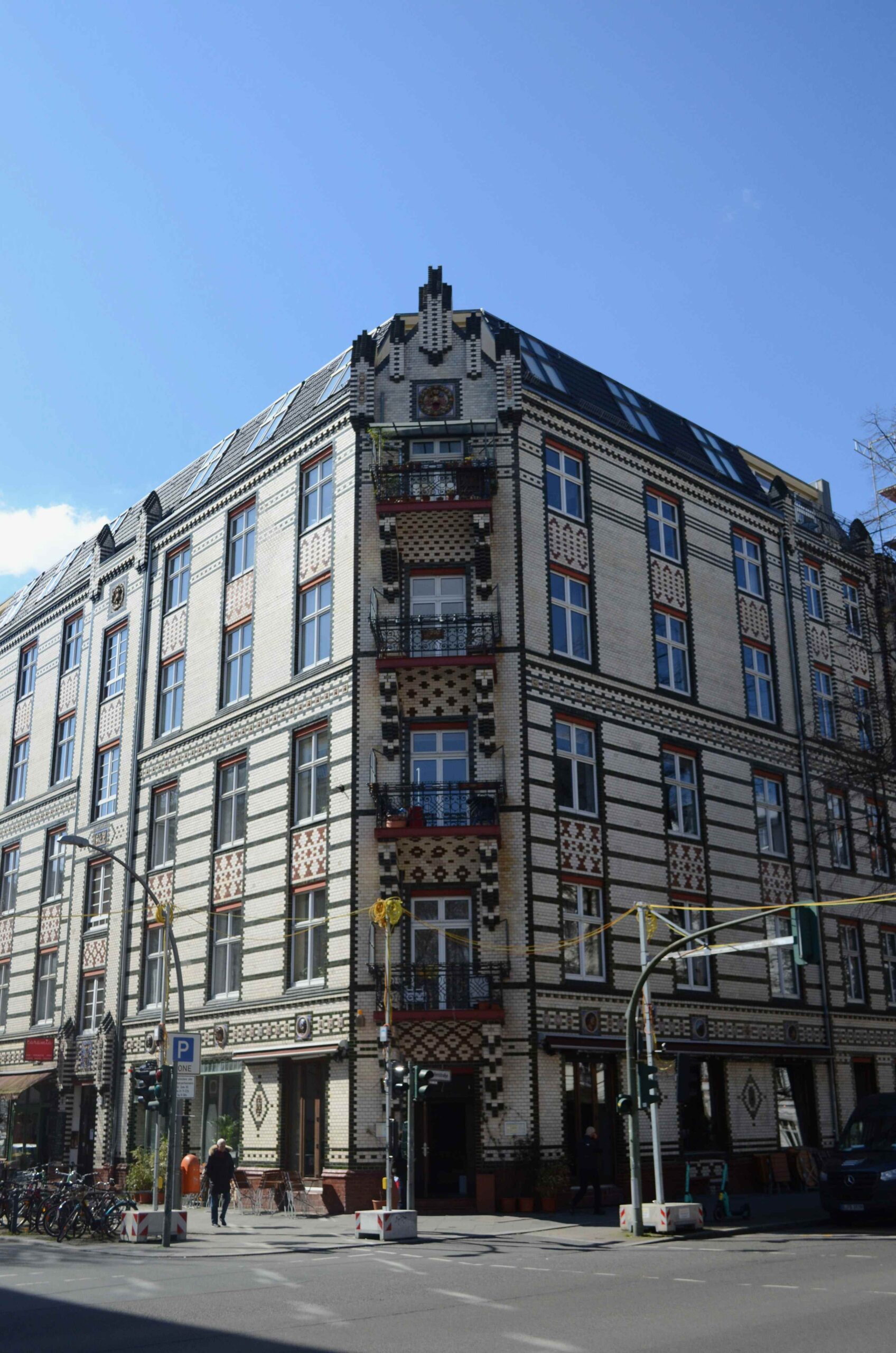 Die Fassade des Mietshauses an der Goltz-, Ecke Hohenstaufenstraße ist vollständig mit glasierten Klinkern verblendet. Das fünfgeschossige Gebäude hat sieben Achsen zur Goltzstraße und fünf Achsen an der Hohenstaufenstraße. Die abgeschrägte Ecke mit Balkonen in jeder Etage endet mit einem gotisierenden Staffelgiebel (Nicola Vösgen).