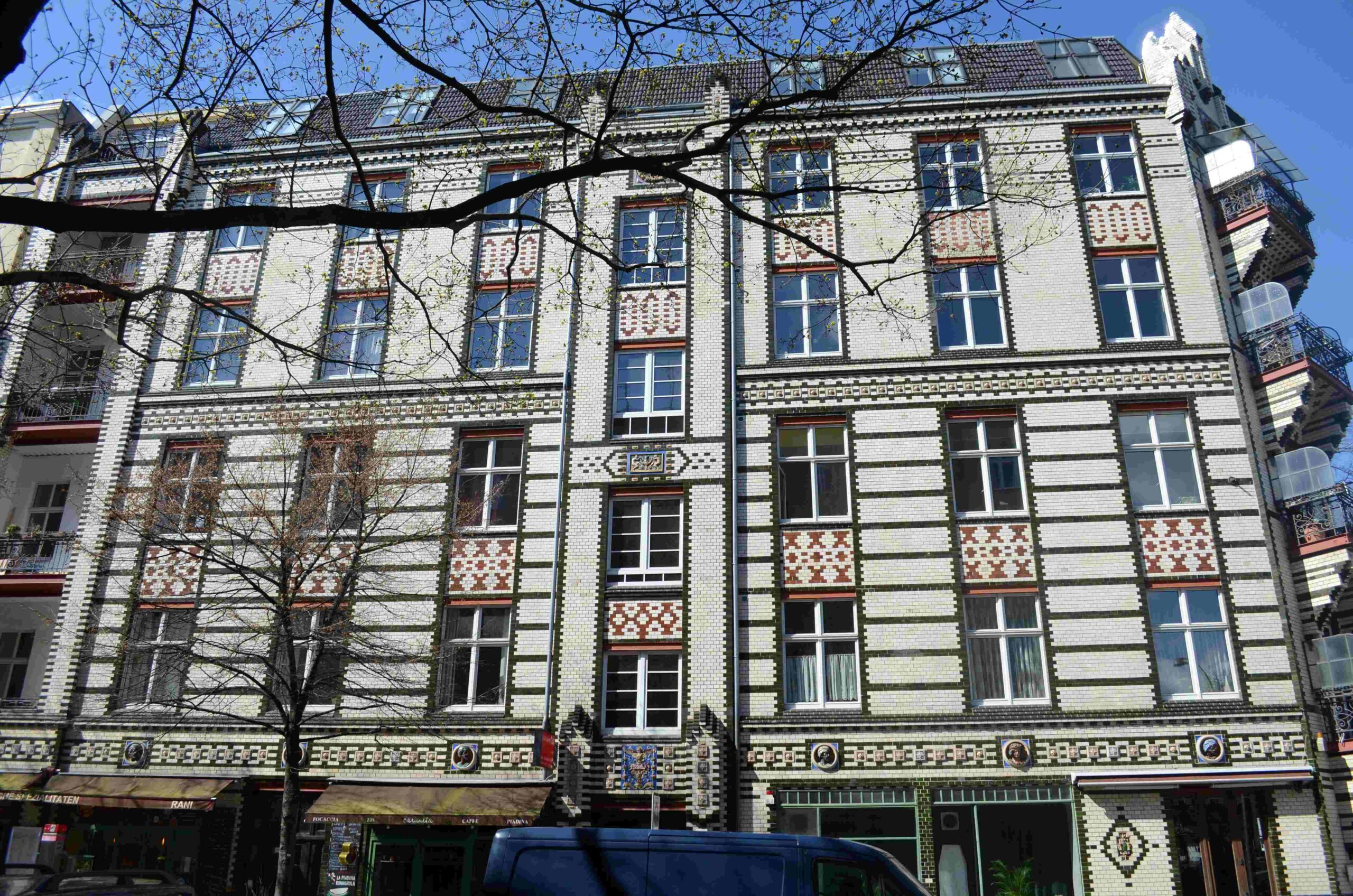 Die Fassade des Mietshauses an der Goltz-, Ecke Hohenstaufenstraße ist vollständig mit glasierten Klinkern verblendet. Das fünfgeschossige Gebäude hat sieben Achsen zur Goltzstraße und fünf Achsen an der Hohenstaufenstraße. Die abgeschrägte Ecke mit Balkonen in jeder Etage endet mit einem gotisierenden Staffelgiebel (Nicola Vösgen).