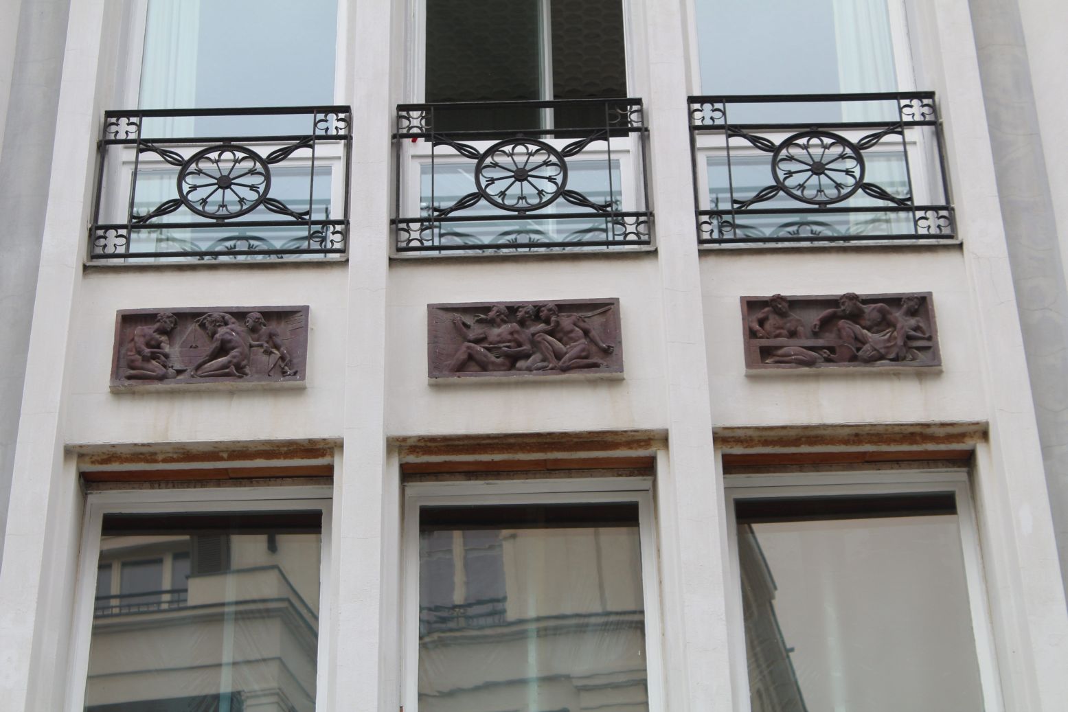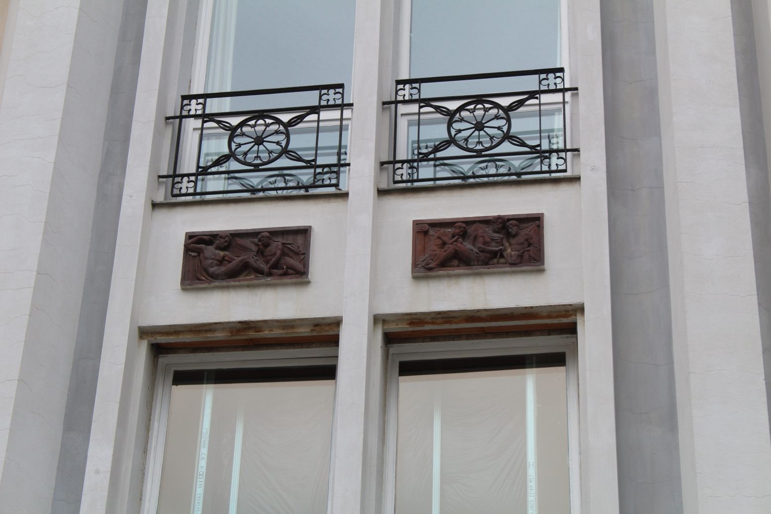 Unterhalb der oberen, in Dreiergruppen angeordneten Fensterreihe des Schinkel Pavillons sind in den Brüstungsfeldern jeweils zwei oder drei rechteckige Terrakottareliefs eingelassen, insgesamt handelt es sich um 19 Relieftafeln. Sie zeigen unbekleidete junge und ältere Männer in antiker Gestaltung mit verschiedenen Werkzeugen und Attributen (Nicola Vösgen).