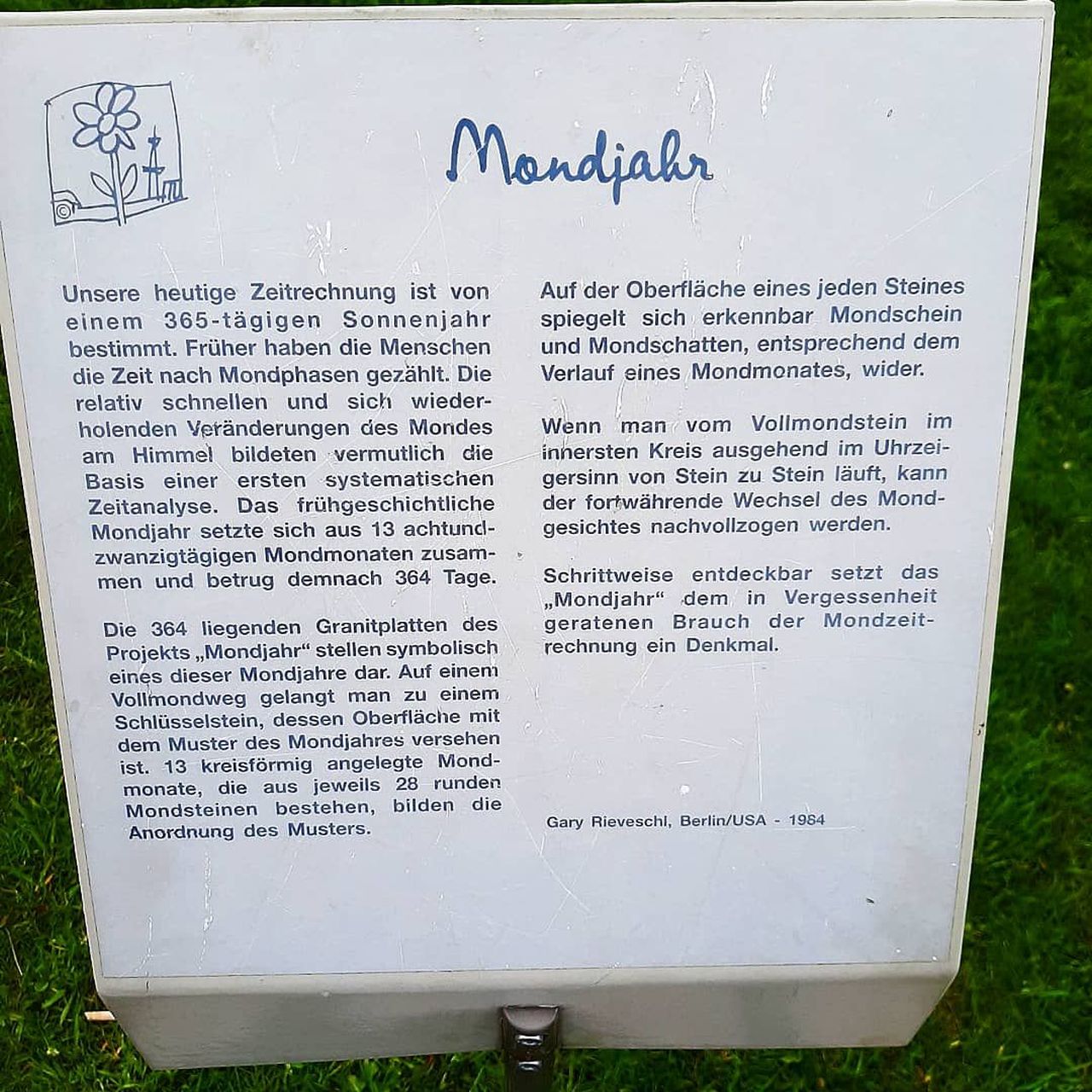 Das Objekt setzt sich aus 364 runden Granitplatten, den Mondsteinen, zusammen, welche den Mondzyklus anzeigen. Alle Granitplatten sind in den Boden installiert und die Oberfläche ist glattpoliert. In der Mitte der Installation befindet sich ein runder Granitsockel, indem der gesamte Mondzyklus punktförmig eingemeißelt wurde. Auf der Oberfläche der einzelnen Mondsteine kann man deutlich den Mondschein und Mondschatten erkennen, die sich entsprechend des Verlaufs des Mondjahres verändern. Außerhalb des Zyklus befindet sich ein Kreis mit umlaufender Schrift, welche die Signatur des Künstlers und den Titel der Installation beinhaltet (Lara Geßener).