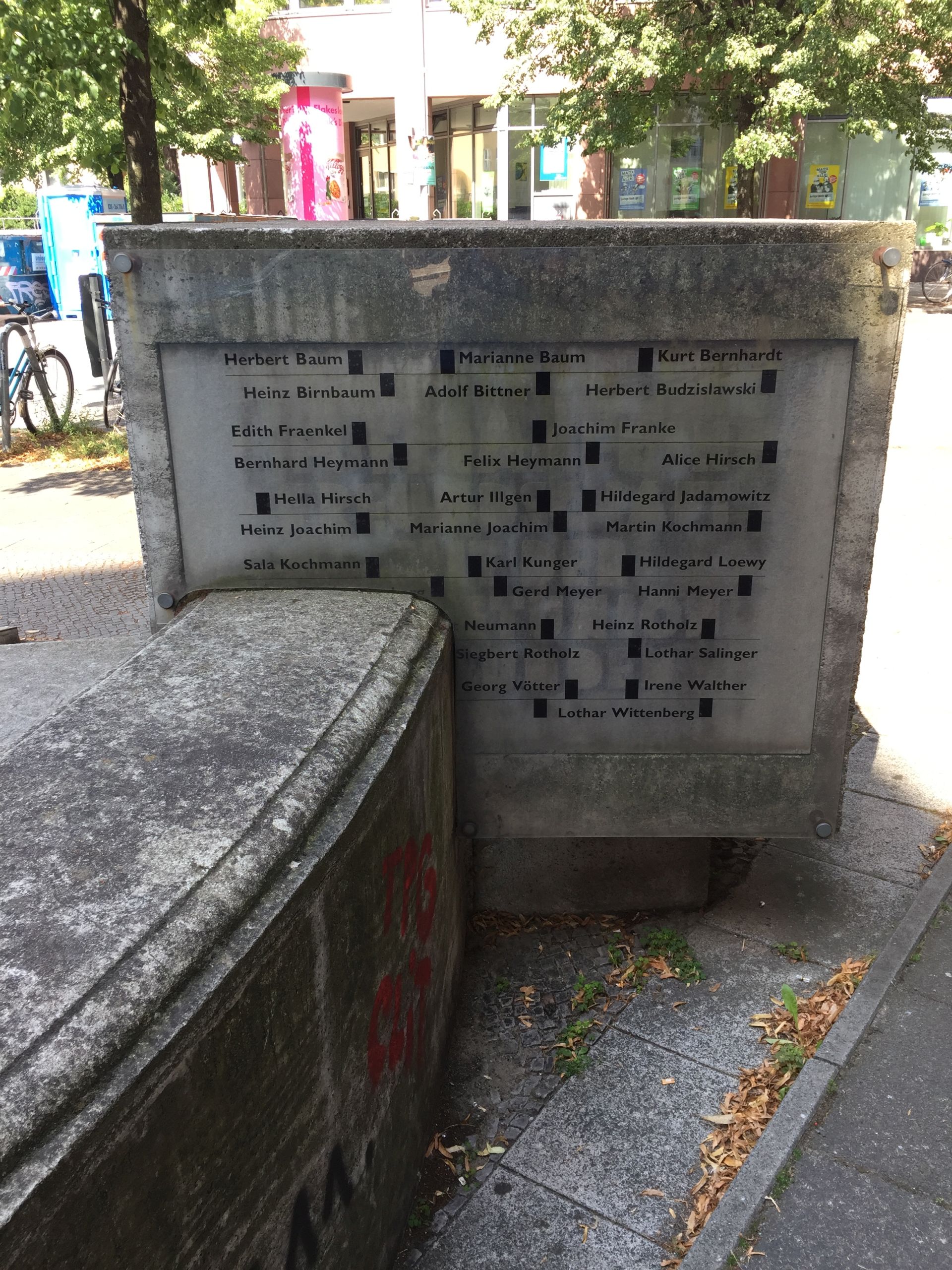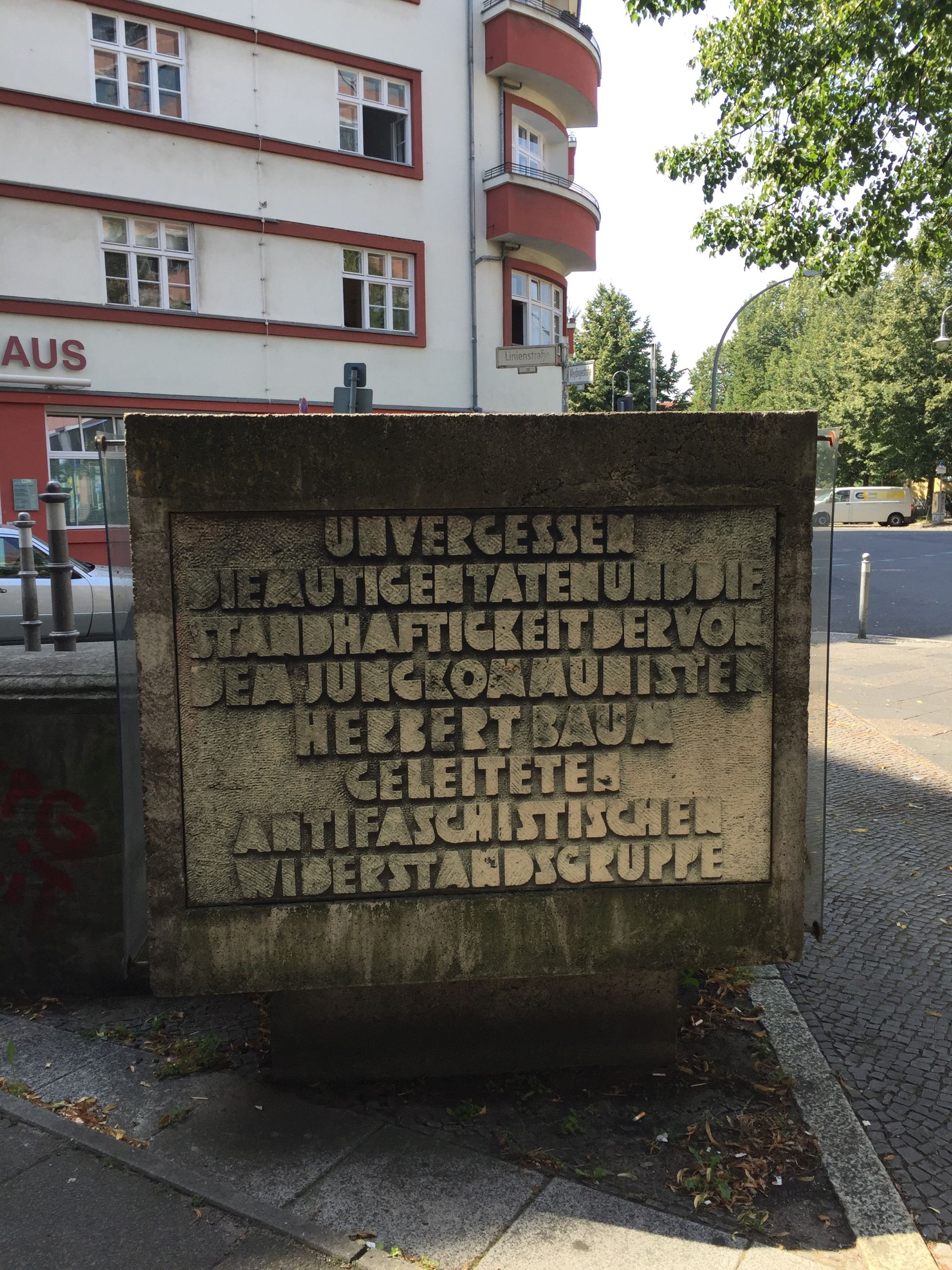 »UNVERGESSEN / DIE MUTIGEN TATEN UND DIE / STANDHAFTIGKEIT DER VON / DEM JUNGKOMMUNISTEN / HERBERT BAUM / GELEITETEN / ANTIFASCHISTISCHEN / WIDERSTANDSGRUPPE«