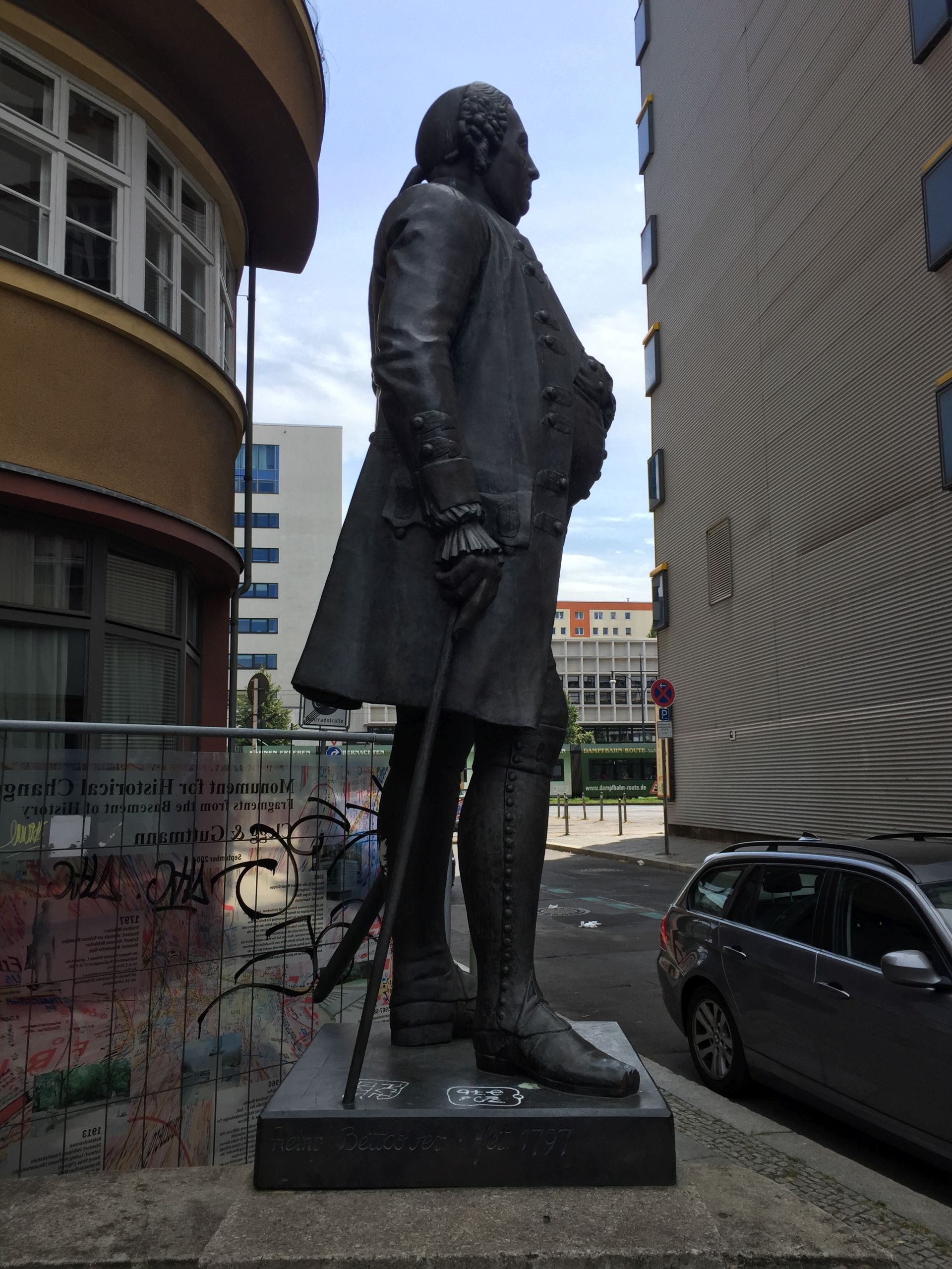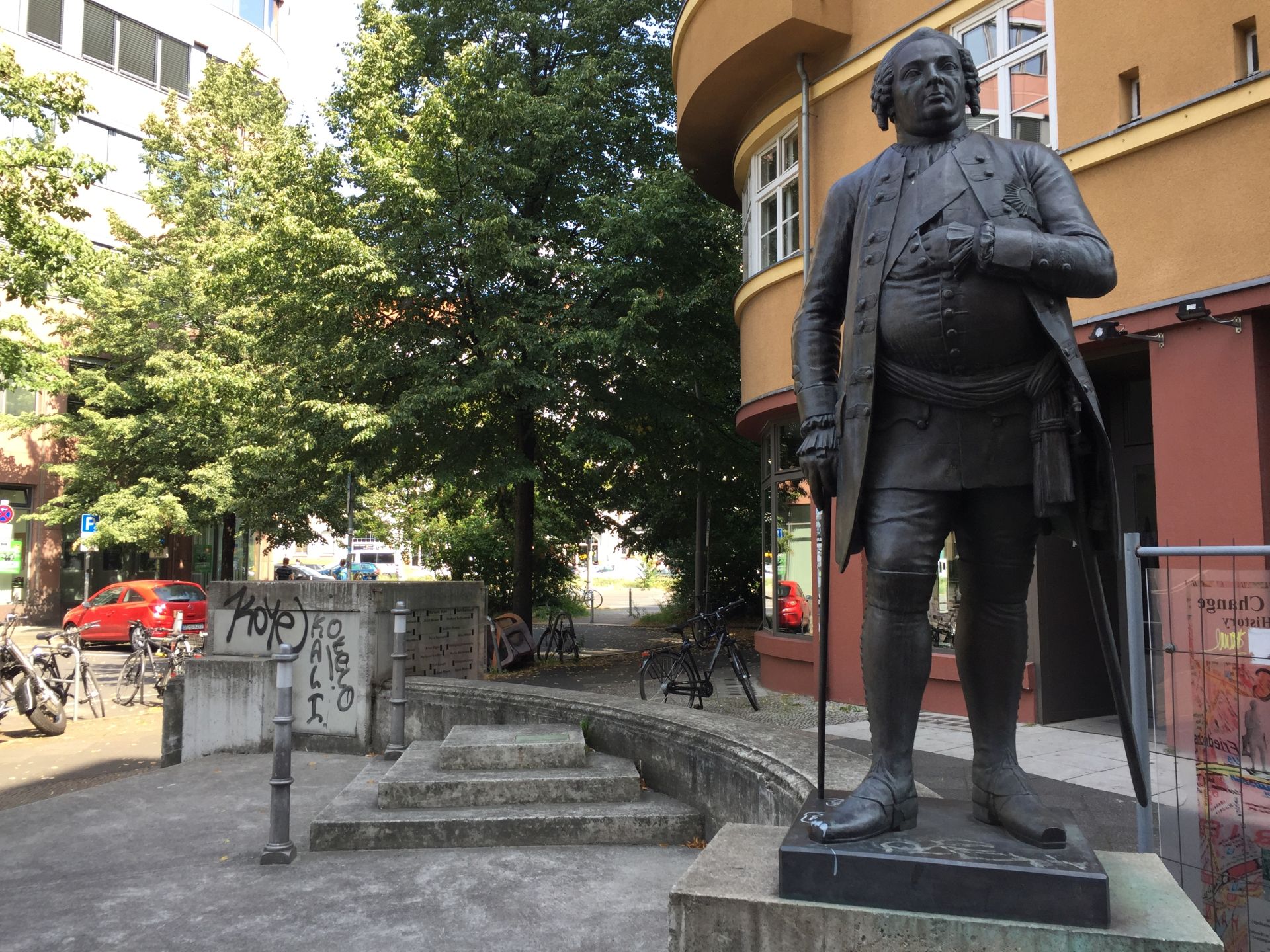 Das Ensemble besteht aus Elementen einzelner historischer Denkmäler. Die Statue des ersten Preußischen Königs Friedrich Wilhelm I. (ehem. Monbijou-Park) nach außen blickend an einem Ende, das würfelförmige Denkmal der Willi-Baum-Gruppe (Lustgarten) am anderen Ende und bilden ein zusammenhängendes Ensemble auf einem dreistufigen Aufbau des „Delphinbrunnen“ (Volkspark Friedrichshain) und einer in die Stufen eingelassenen Gedenktafel des „Spanienkämpferdenkmals“ (Rande des Volksparks Friedrichshain). Die Rückseite des Ensembles ist von einer halbkreisförmigen Mauer umschlossen. Ergänzt wird das Ensemble durch zwei auf dem Podest montierte, zufällig angeordnet scheinende, Verkehrspoller (nach Willi Creutzenberg).