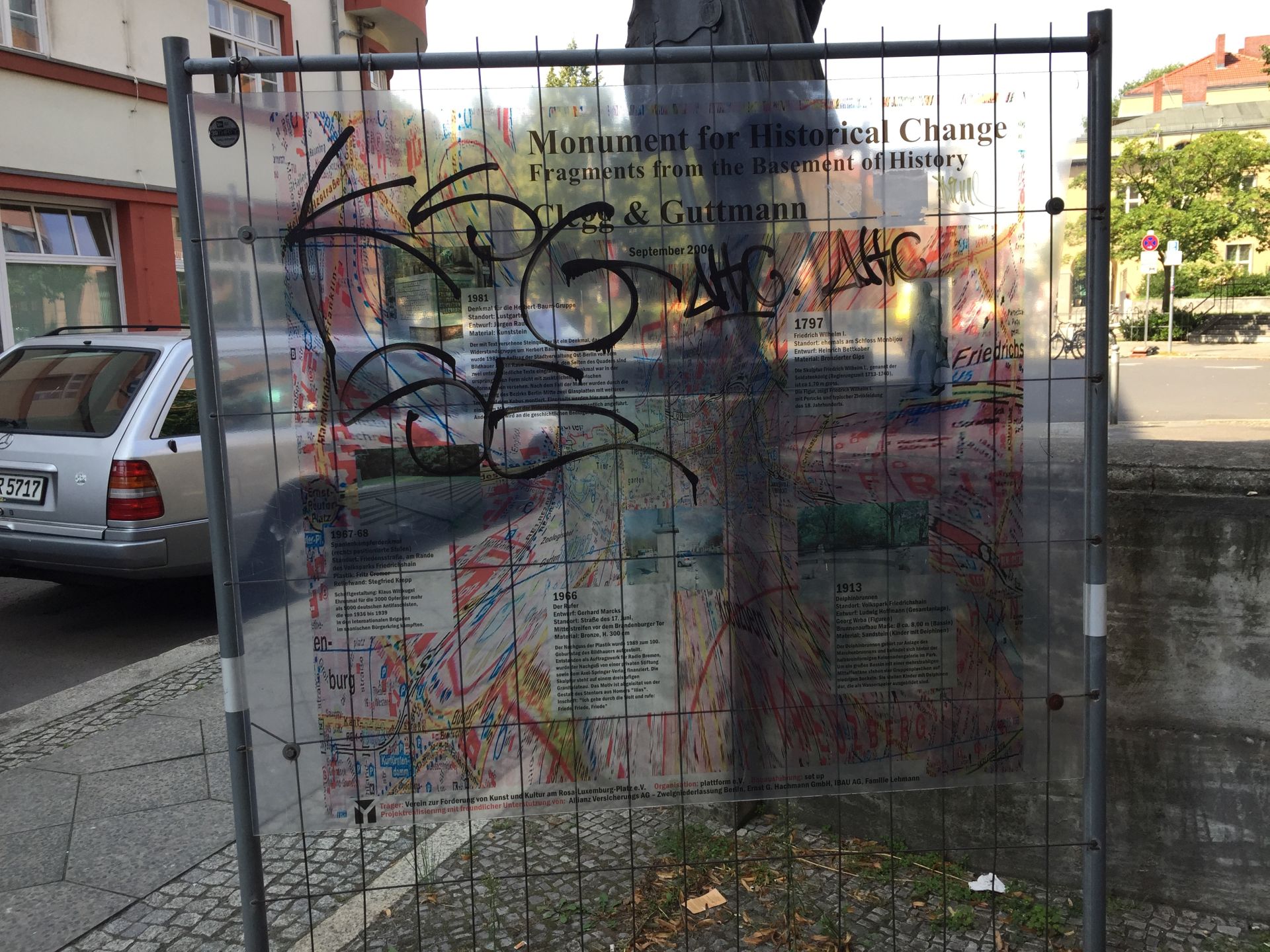 Das Ensemble des Künstlerduos Clegg & Guttmann ist ein 'neues Denkmal', das aus Fragmenten anderer Denkmäler besteht. Es spannt den Bogen zeitlich von Friedrich Wilhelm I. (1. preußischer König, ehemaliger Standort am Monbijou-Park), den 'Delphinbrunnen' im Volkspark Friedrichshain, über den 'Rufer' an der Straße des 17. Juni, das 'Spanienkämpferdenkmal' am Randes Volksparks Friedrichshain bis hin zum Denkmal für die Baum-Gruppe am Lustgarten.Träger des Projekts ist der Verein zur Förderung von Kunst und Kultur am Rosa-Luxemburg-Platz e.V. (Willi Creutzenebrg). Michael Clegg ist Professor für künstlerische Fotografie an der Staatlichen Hochschule für Gestaltung in Karlsruhe. Martin Guttmann lehrt als Professor an der Akademie der Bildenden Künste Wien. Seit 1980 arbeiten sie an gemeinsamen Projekten im öffentlichen Raum u.a. zu Installation und Fotografie.