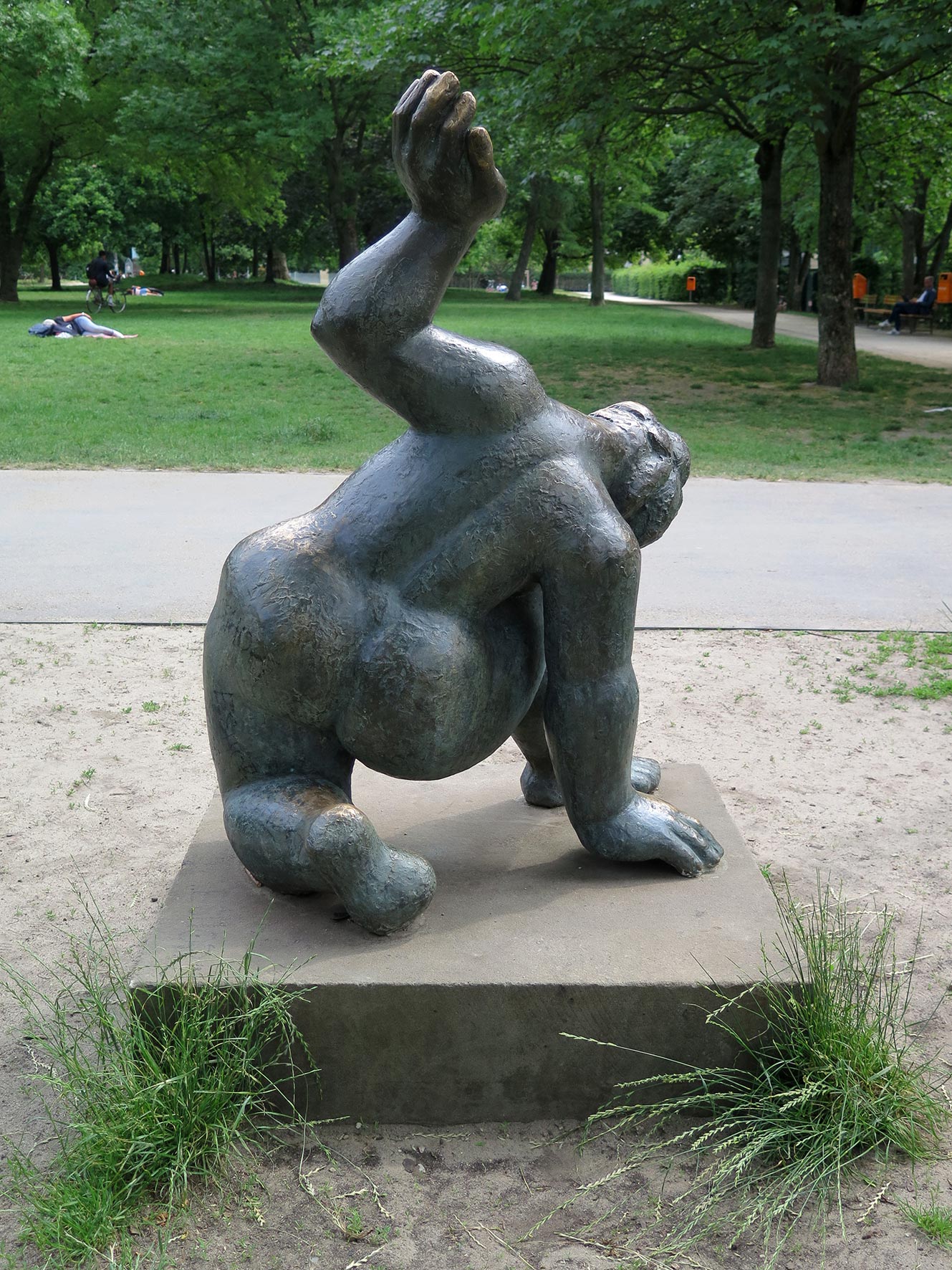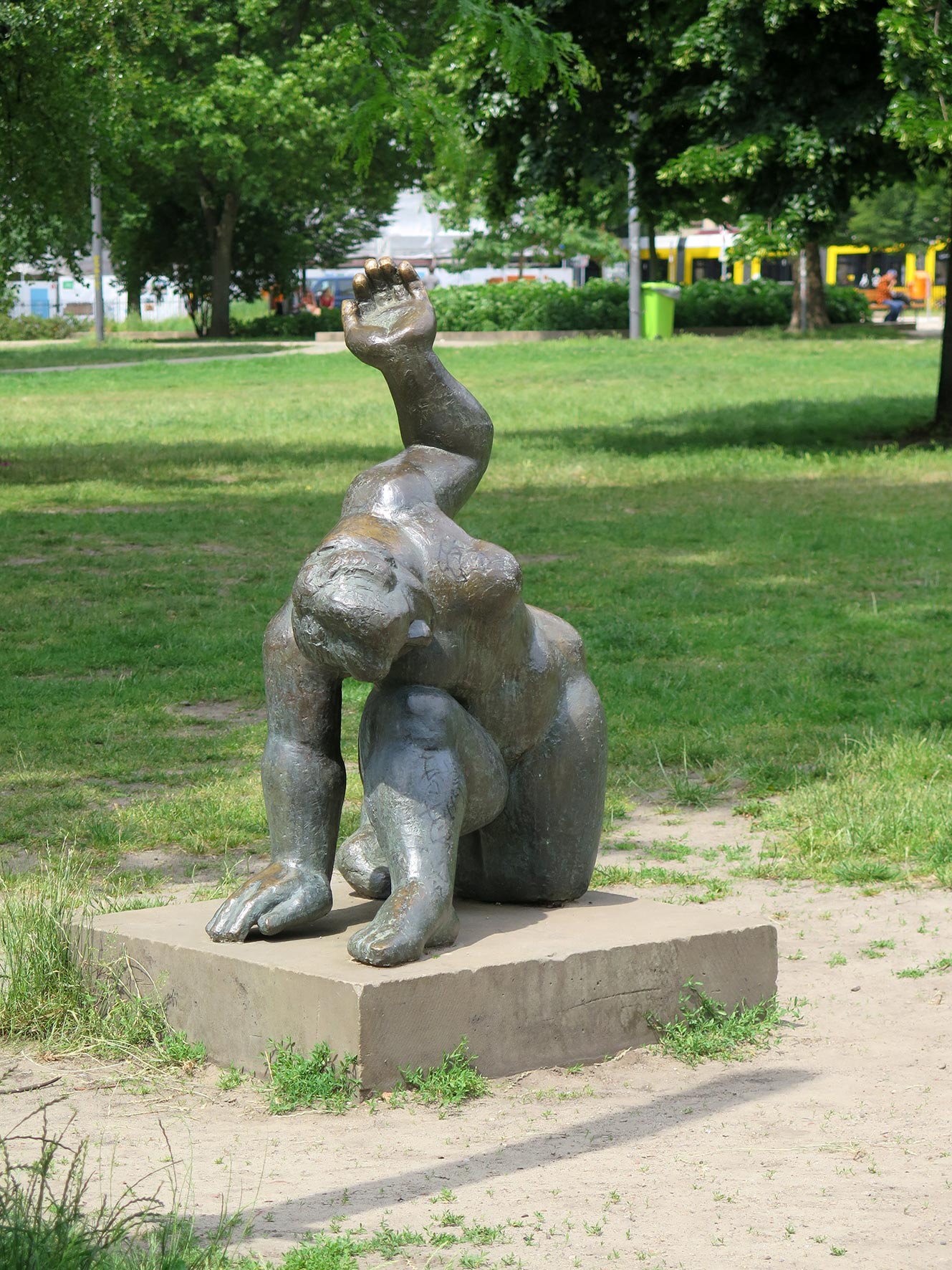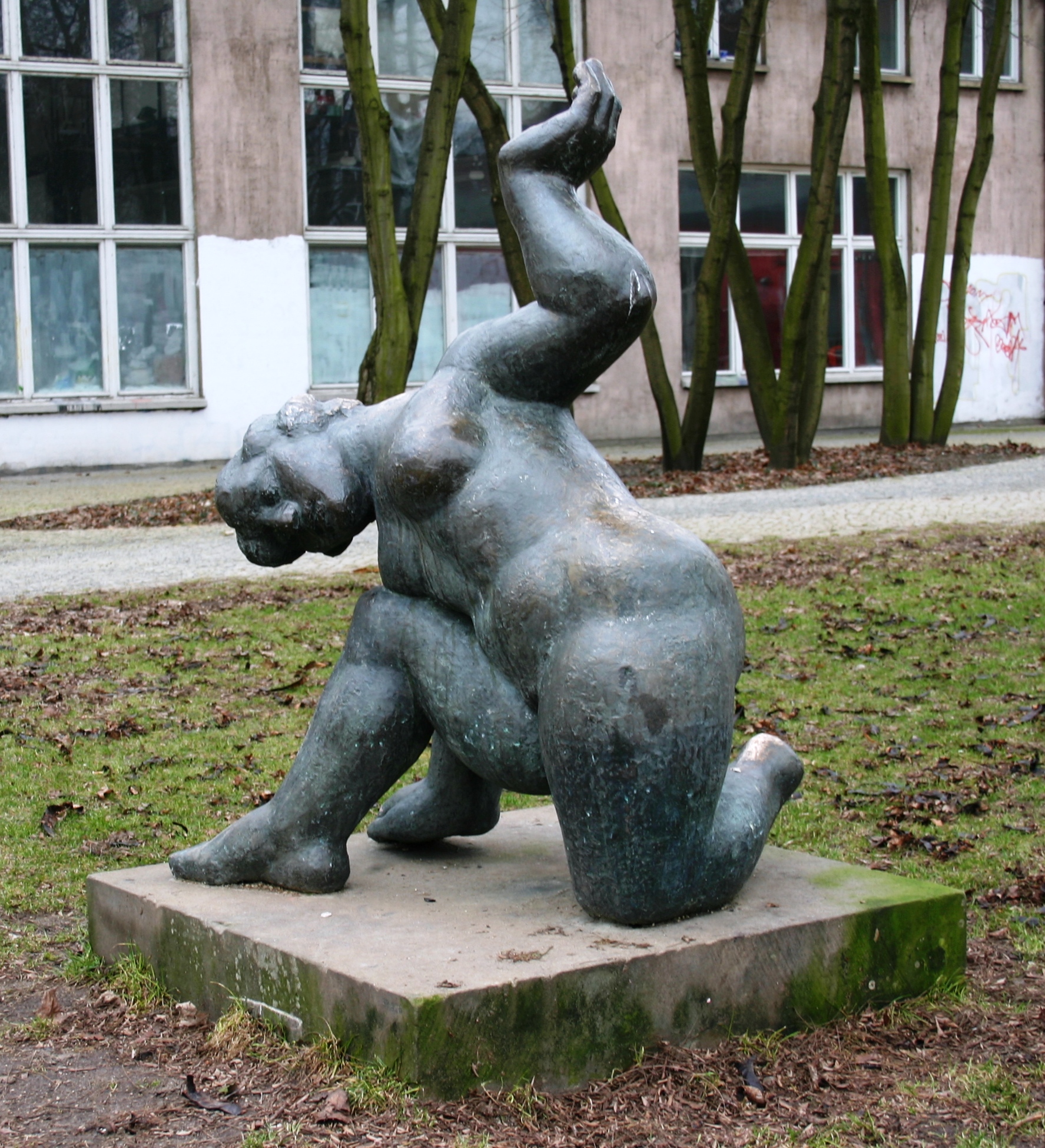 Niedrig aufgestellte gesockelte Bronzeplastik eines abstrakten weiblichen Aktes. Auf rechteckiger Standplatte aus Stein ist die in abstrahierender Form gerundet formulierte Figur einer nackten Frau aufgestellt. Mit dem rechten Bein kniet sie, während das linke Bein aufgestellt ist. Mit der linken Hand stützt sie sich nach unten ab, mit der rechten Hand am angewinkelten Arm scheint sie sich nach oben zu stemmen. Der Titel „Die Erde“ („Mutter Erde“) der sehr weiblich-rund gebildeten Plastik verweist auf eine mythische Figur, etwa die griechische „Muttergöttin“ Gäia (Jörg Kuhn).