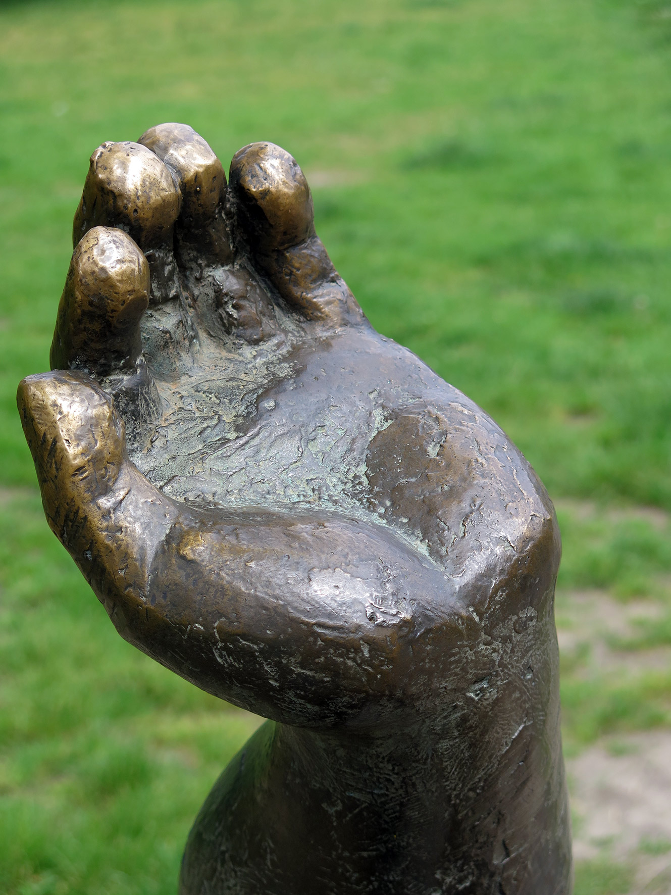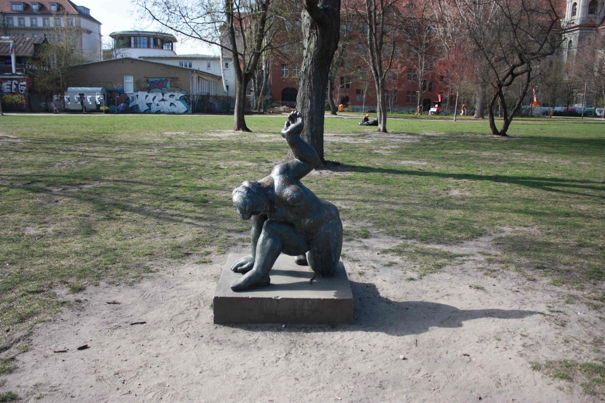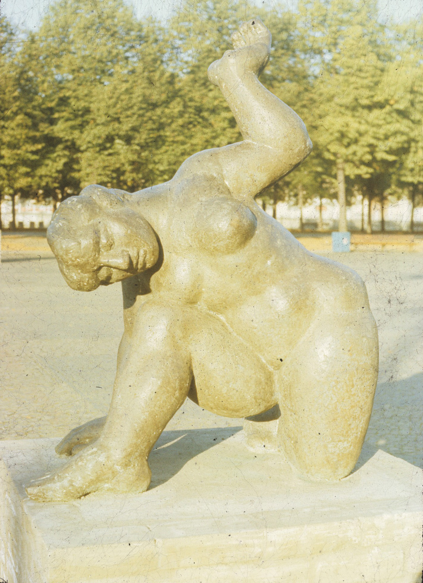 Niedrig aufgestellte gesockelte Bronzeplastik eines abstrakten weiblichen Aktes. Auf rechteckiger Standplatte aus Stein ist die in abstrahierender Form gerundet formulierte Figur einer nackten Frau aufgestellt. Mit dem rechten Bein kniet sie, während das linke Bein aufgestellt ist. Mit der linken Hand stützt sie sich nach unten ab, mit der rechten Hand am angewinkelten Arm scheint sie sich nach oben zu stemmen. Der Titel „Die Erde“ („Mutter Erde“) der sehr weiblich-rund gebildeten Plastik verweist auf eine mythische Figur, etwa die griechische „Muttergöttin“ Gäia (Jörg Kuhn).