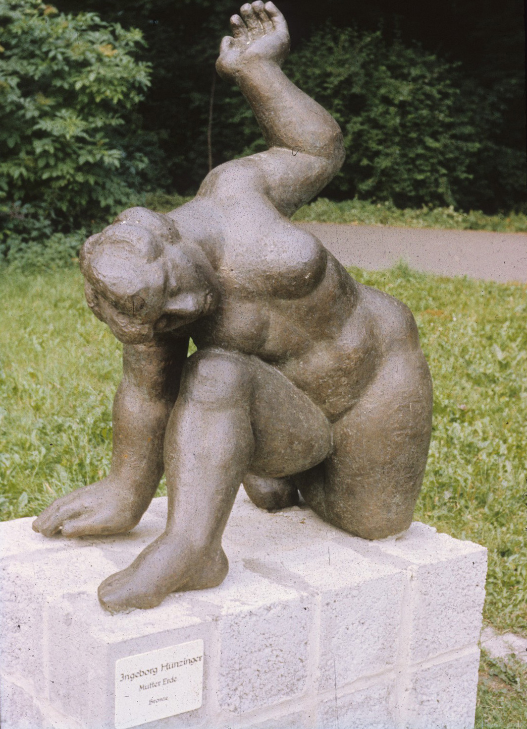 Ingeborg Hunzinger hatte eine Kleinplastik der „Mutter Erde“ bereits 1972 geschaffen, die lebensgroße Plastik der „Mutter Erde“ entstand zwei Jahre später war erstmals 1977 auf der „Kunstausstellung der Hauptstadt der DDR“ zu sehen. 1982 war sie auf der Ausstellung „Plastik und Blumen im Treptower Park ausgestellt (Netzger, Dr. Helmut: Wesentliche Wirkung für Werke der Bildhauerkunst. „Plastik und Blumen - Ausstellung im Treptower Park“, in: Berliner Zeitung, 38. Jg., 06.07.1982, S. 7; im zugehörigen Ausstellungskatalog nicht erwähnt). 1987 wurde die „Erde“ im Rahmen der Ausstellung "Kunst in Berlin 1648-1987" auf dem Marx-Engels-Platz vor dem Alten Museum aufgestellt und verblieb an diesem Standort für einige Jahre. Um 1990 stand die Plastik im Innenhof des Clubs der Kulturschaffenden Johannes R. Becher in der Mauerstraße 22/ Jägerstraße 2/3 und wurde von dort in den Monbijoupark umgesetzt. Ein Nachguss von 1999 befindet sich im Ortskern von Wustrow auf dem Darß in Mecklenburg Vorpommern. Seit 2008 steht das Gipsmodell der „Mutter Erde“, dass die Künstlerin dem Kunstsammler Wolfgang-Michael Handrack geschenkt hatte, im Herzzentrum von Coswig in Anhalt (Nitz, Corinna: „Natürlich arbeite ich noch" / Die Bildhauerin Ingeborg Hunzinger besucht Coswig und zeigt dem Alter die kalte Schulter, in: Mitteldeutsche Zeitung, 01.08.2008) (Nicola Vösgen).
