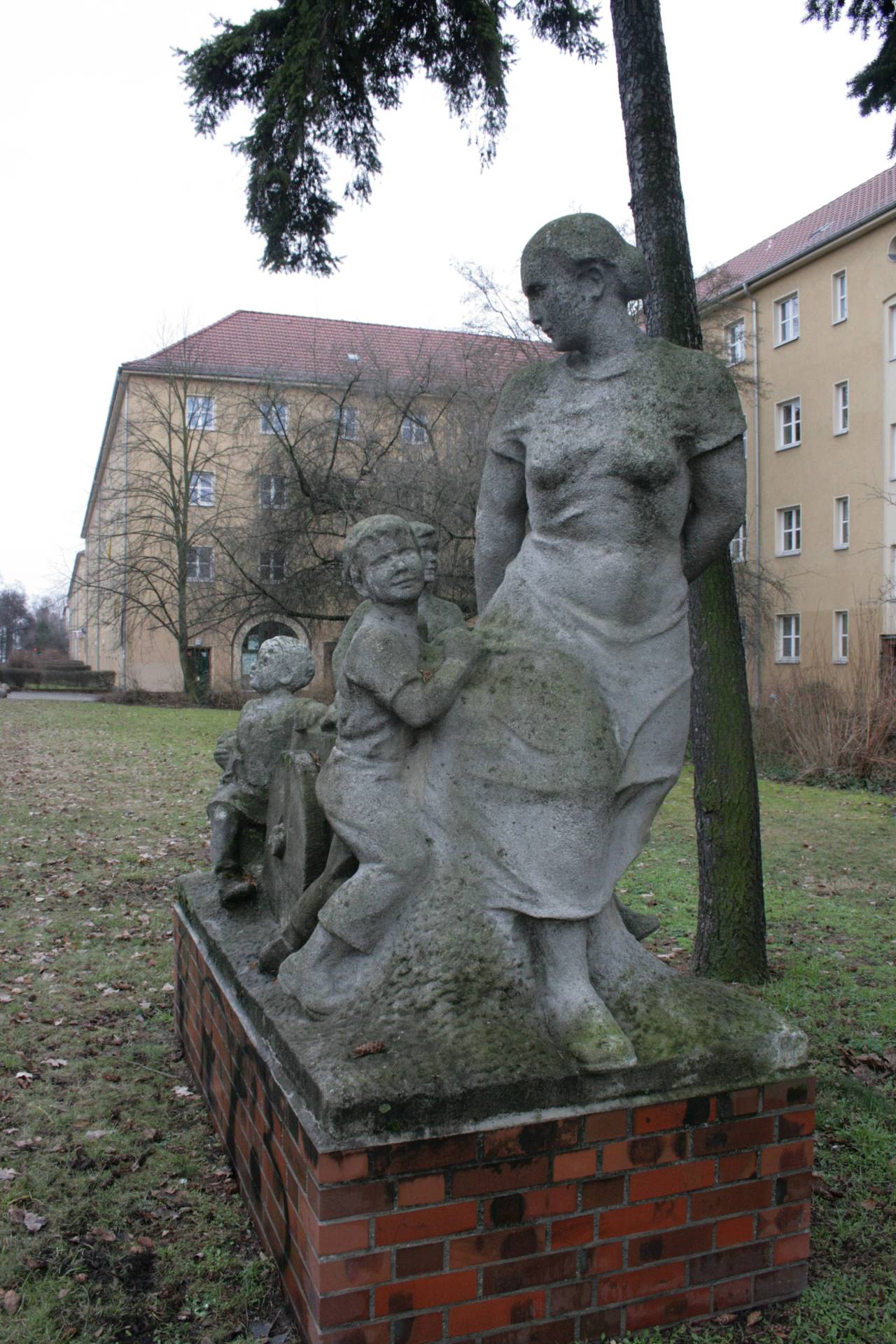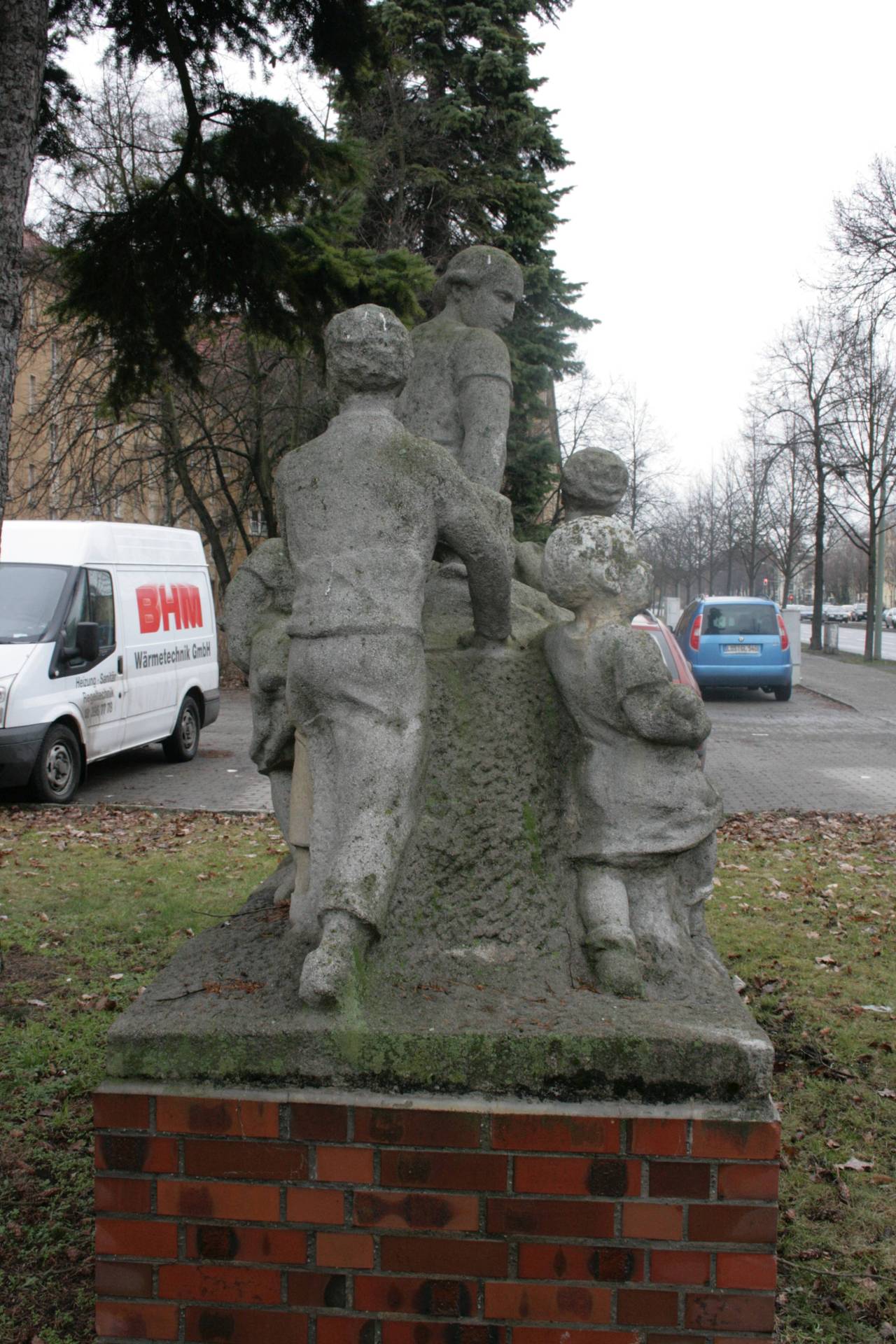 Auf einem längsrechteckigen Klinkersockel steht über einer kräftigen Plinthe eine sechsfigurige Gruppe aus grauem Kunststein. Dargestellt ist eine Mutter, die einen Bollerwagen mit altmodisch anmutenden Rädern hinter sich herzieht. Die Kinder sind in unterschiedlichen Altersstufen wiedergegeben. Alle Figuren sind im Stil der 1930er Jahre bekleidet (Jörg Kuhn).