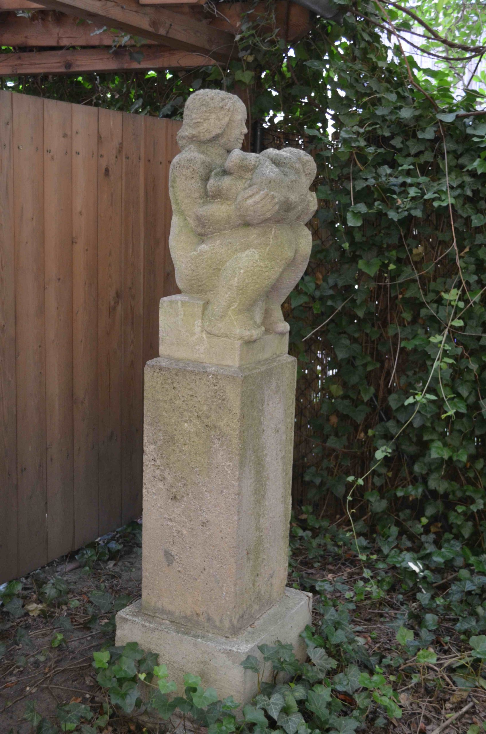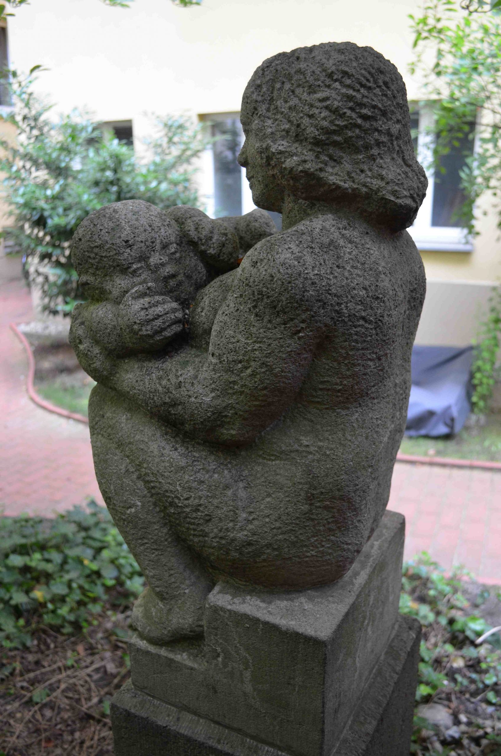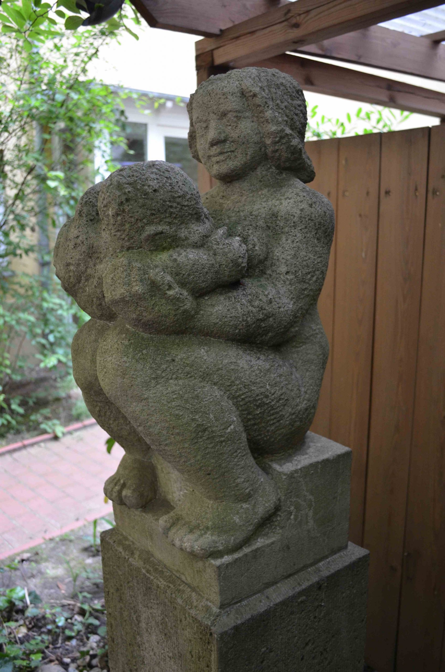 „Die Darstellung einer Mutter mit gedrungenen, kräftigen Körperformen wirkt kompositorisch in sich geschlossen. Den Säugling hält sie in anmutiger Haltung auf den Knien und hat ihm ihr Gesicht liebevoll zugewendet. Inmitten eines gartenarchitektonisch gut gestalteteten Wohnhofes kann diese Plastik ihren intimen Charakter gut zur Wirkung bringen.“ (Köcher, Schlegel, 1993, S. 66)