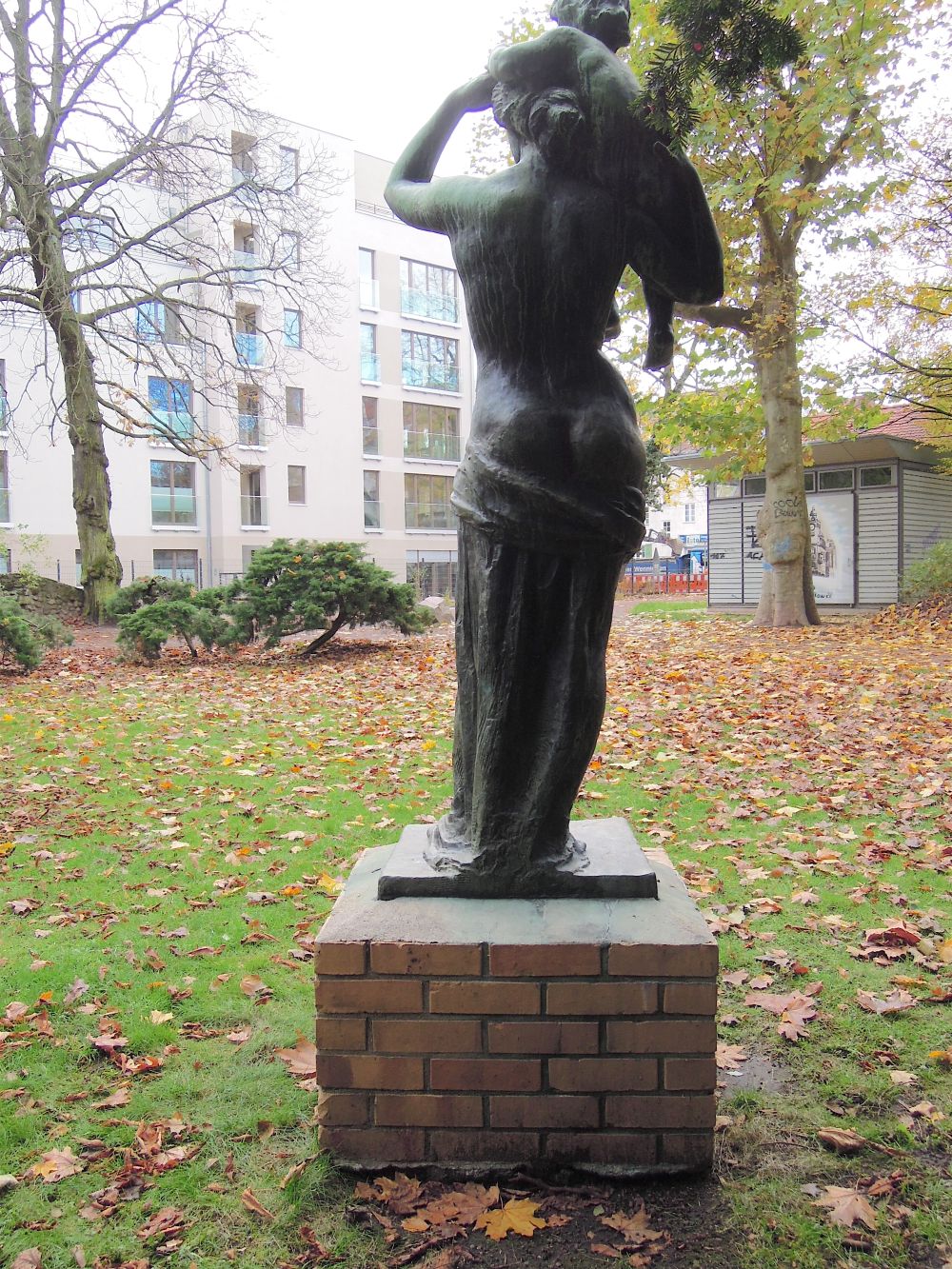 Die Figurengruppe zeigt eine Mutter mit freiem Oberkörper, die, mit beiden Armen haltend, ein scheinbar spielendes Kind auf der rechten Schulter trägt. Die aufrechtstehende Frau ist mit einer Draperie unterhalb der Hüften bekleidet, die nicht ganz die Scham bedeckt. Das Kind, ebenfalls nackt, ist z.T. in ein Tuch gewickelt. Den Kopf hat die Mutter nach links gerichtet, die Beine dagegen im Kontrapost, so dass die Verti-kalachse des Körpers in einer S-Kurve spanungsvollen verläuft. Die Statue fußt auf einer quadratischen Bronzeplinthe, die auf den Seiten den Gießereistempel und die Künstlersignatur trägt. Die Skulptur steht auf einem mit gelben Lochklinkern gemauerten Sockel. Zur Verdeckung der Löcher ist die oberste Ziegelschicht mit Zement verputzt. Dadurch wird ein Teil der Bronzeplinthe unschön vom Putz verdeckt (Jürgen Tomisch).