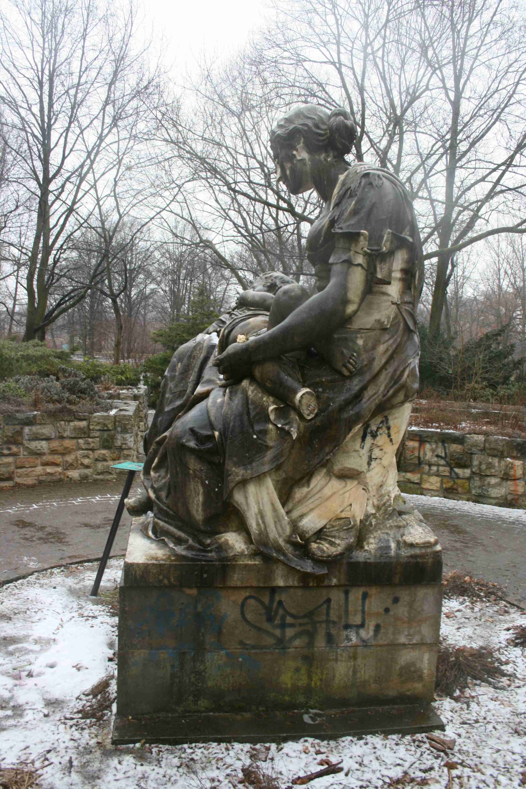 Auf (viel zu) niedrigem Sockel aus Sandstein ruht die quadratische Marmorplinthe, die die genrehaft aufgefasste Marmorgruppe einer sitzenden Mutter mit ihrem Kind in den Armen trägt. Gomansky zeigt sich hier als virtuoser Beherrscher des krassen Naturalismus, dem dominierenden Zeitstil innerhalb der späten konservativen Berliner Bildhauerschule. Die Gruppe ist an der Plinthenkante links hinten vertieft bezeichnet (Jörg Kuhn).