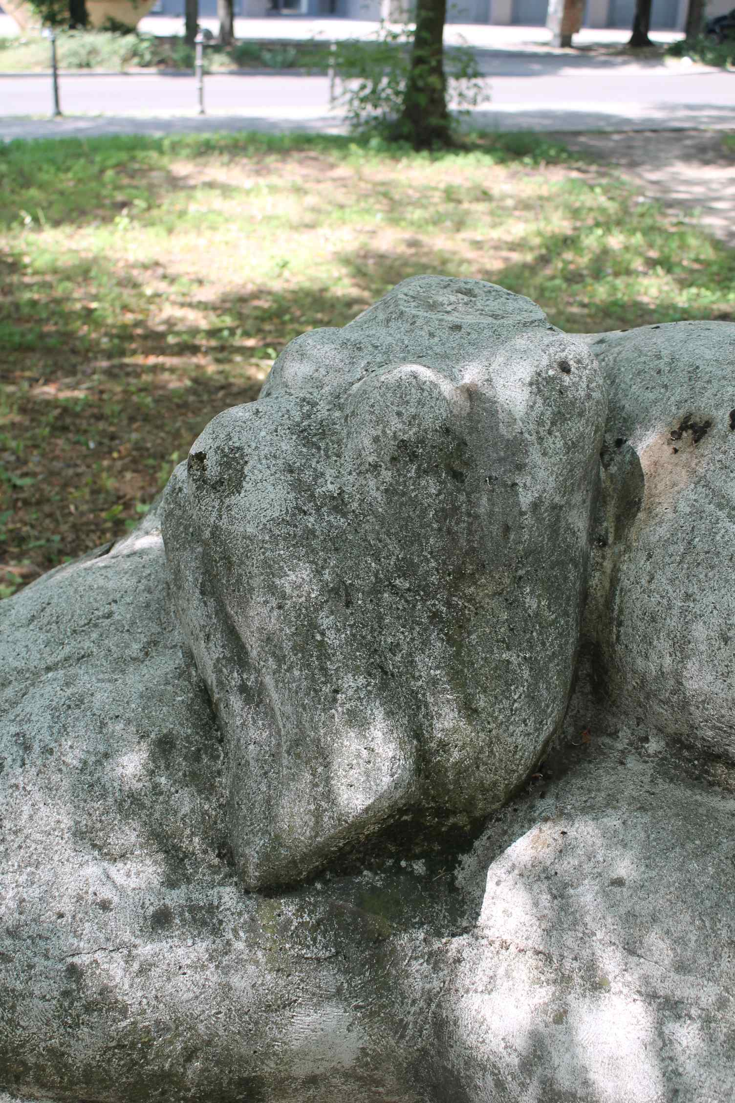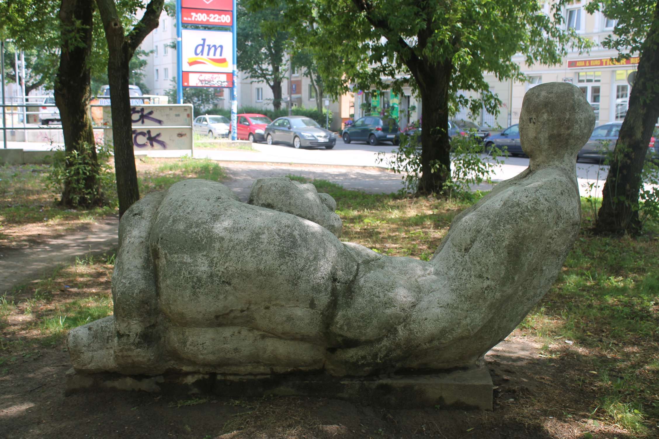 Die überlebensgroße Personengruppe aus Betonwerkstein setzt sich aus zwei Figuren zusammen, Mutter und Kind. Sie befindet sich auf einer kleinen Grasfläche, schräg vor einer Einkaufshalle und scheint etwas versteckt, da nur ein kleiner Pfad an ihr vorbeiführt. Die Mutter ist liegend dargestellt und das Kind sitzt zusammengekauer zwischen den Beinen der Mutter. Der untere Teil ihres Körpers ist auf einer Fundamentplatte angebracht, während ihr Oberkörper etwas nach hinten gelehnt im Freien „schwingt“. Ihr Körper scheint vom Kopf bis zu den Füßen den Schwung des Buchstabens S zu haben, wenn man sie zur Straße hin betrachtet. Durch diese Schwingung wird keine direkte Hauptansichtsseite deutlich. Der Körper des Kindes ist auch in die entgegengesetzte Richtung gedreht, als der Kopf der Mutter. Dies wird deutlich, obwohl der Kopf des Kindes nicht mehr vorhanden ist. Es sieht allerdings eher so aus, als wäre er sorgfältig abmontiert worden und weniger nach einer mutwilligen Zerstörung. Die Gliedmaßen des Kindes sind außerdem nur undeutlich zu erkennen, da sie sehr abstrahiert dargestellt sind. Die Beine sind eng an den Körper gezogen, doch die Arme sind nicht wirklich auszumachen zu sein, sie scheinen von den Schultern in den Körper hinein zu verschwinden. Der Körper des Kindes ist zum Oberkörper der Mutter hin ausgerichtet. Der Körper der Mutter ist ebenfalls abstrahiert dargestellt. Strehlau hat von der Darstellung der charakteristischen Körpermerkmale abgesehen und beschränkt sich auf die Darstellung der Silhouette eines Körpers. So sind weder Auge, Ohren, Nase, Mund noch die Haare aufzufinden, sondern lediglich die ovale Form des Kopfes. Die Schultern wirken leicht zusammengezogen und die Arme eng an den Körper gepresst. Sie führen bis hinunter zur Fundamentplatte, anliegend an ihr, werden am Ende der Arme leicht die Hände angedeutet. Die hintere Hand scheint sich beinahe unter ihrem Körper zu verstecken. Ihr Oberkörper ist ebenso schlicht, wie der Rest der Plastik gestaltet. Ihr Bauch bildet eine beinahe flache Fläche, zwischen Kind und Oberkörper und stellt so eine gewisse Distanz zwischen Kind und Mutter her, obwohl das Kind auf ihr sitzt. Die Beine der Frau sind zum Betrachter hin zu Seite geklappt und leicht an den Körper herangezogen. Mit dem Oberkörper bilden sie eine schützende Nische für das Kind. Die Füße, sind wie auch die Hände, leicht angedeutet dargestellt, wobei sich der Fuß des oberen Beins leicht über den des unteren kreuzt. Die Figur weist mehrere rissartige Linien über den gesamten Körper verteilt auf, an denen sie vermutlich einmal zusammengesetzt wurde (Katharina Reuber).