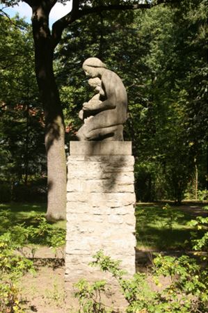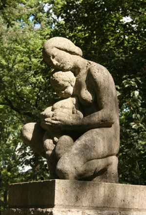 Im Hof der Siedlung. Auf einer erhöhten Rasenterrasse mit alten Eichen und Buchen steht in einem rechteckigen Pflanzbeet auf einem aus Muschelkalkstein gemauerten, rechteckigen Pfeilersockel eine aus Muschelkalkstein gearbeitete Gruppe einer auf einem Stein sitzenden jungen Frau mit einem zwischen ihren Schenkeln in seitlicher Position stehenden kleinen Knaben. Dargestellt sind Mutter und Kind im vertrauten Miteinander. Beide Figuren sind unbekleidet. Die Mutter trägt eine Haartracht in der Mode der Zeit um 1930. Ihr linkes Bein ist abgewinkelt und auf ihrer linken Ferse sitzt die junge Frau auf. Vorne hält die Mutter ihre Hände vor dem Kind ineinandergelegt und das Kind hält die seinen darauf aufruhend. Die Gruppe hat eine zugehörige rechteckige Plinthe (Susanne Kähler).