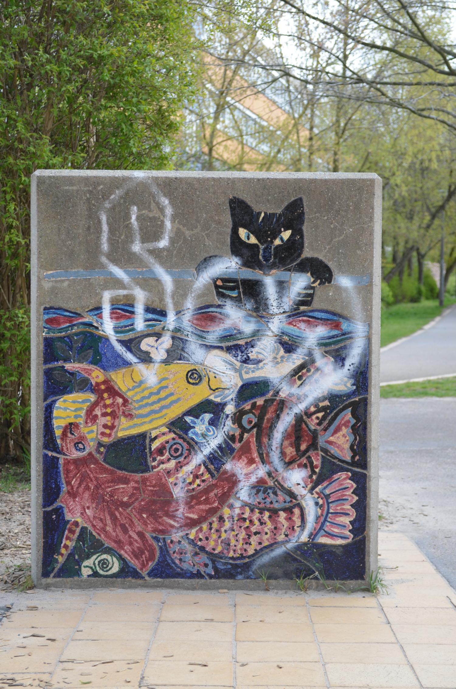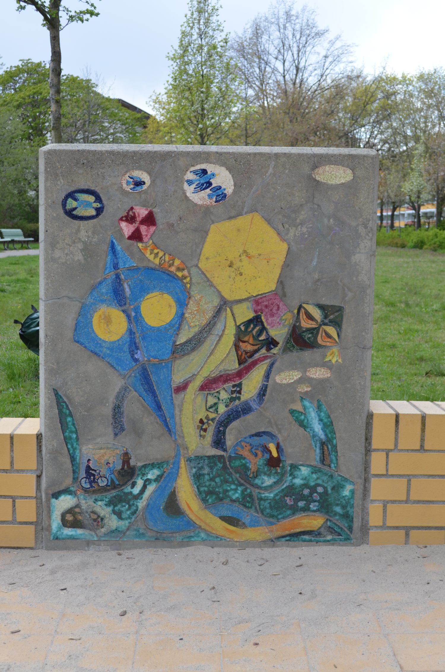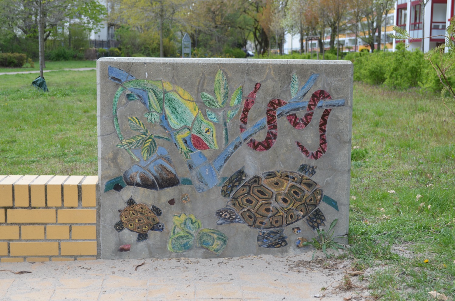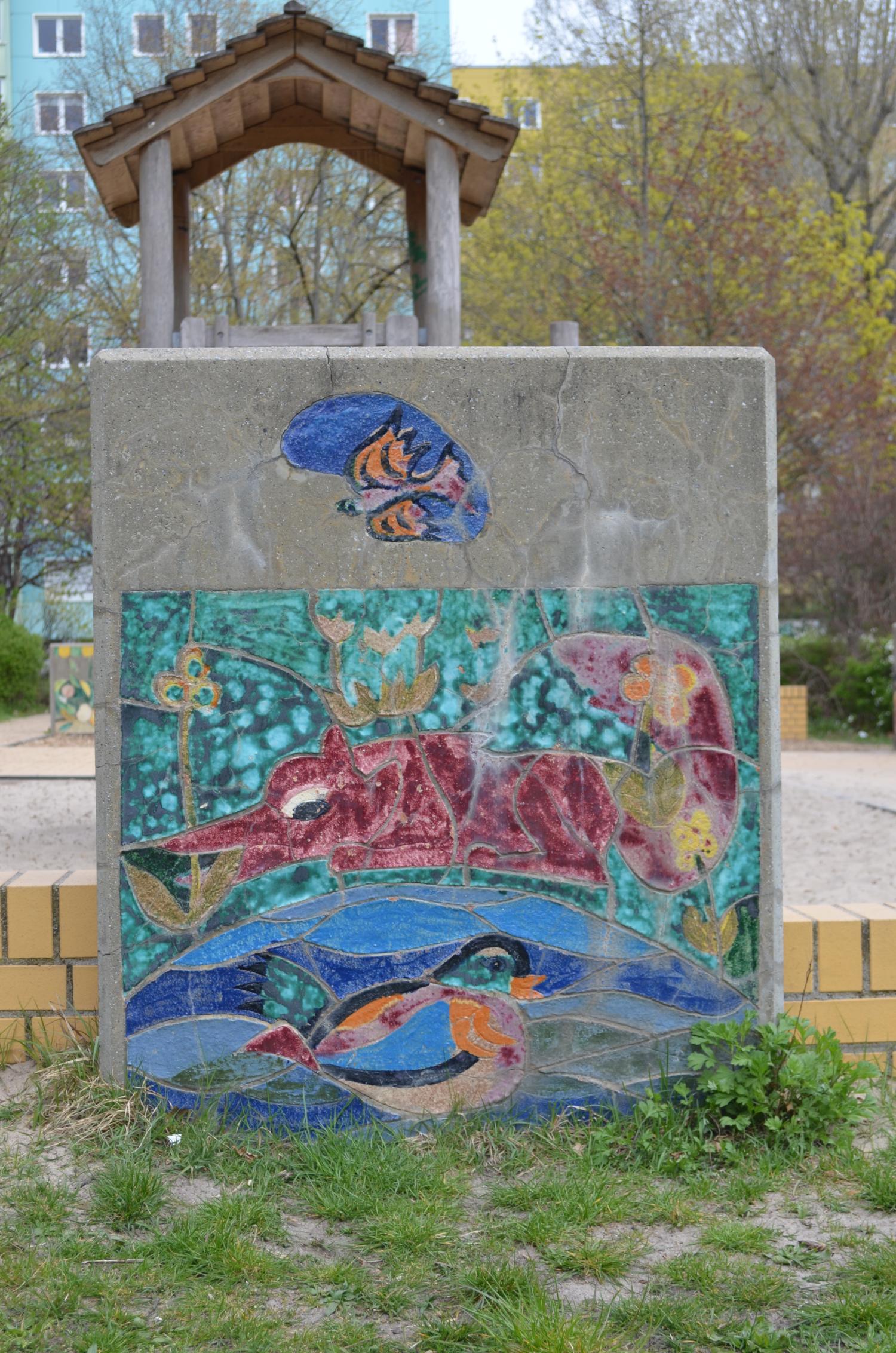 Sieben Betonblöcke in zwei verschiedenen Maßen mit insgesamt 13 Darstellungen von Tier- und Naturbildern. Die Blöcke sind (mit Ausnahme von einem Block) beidseitig gestaltet.
