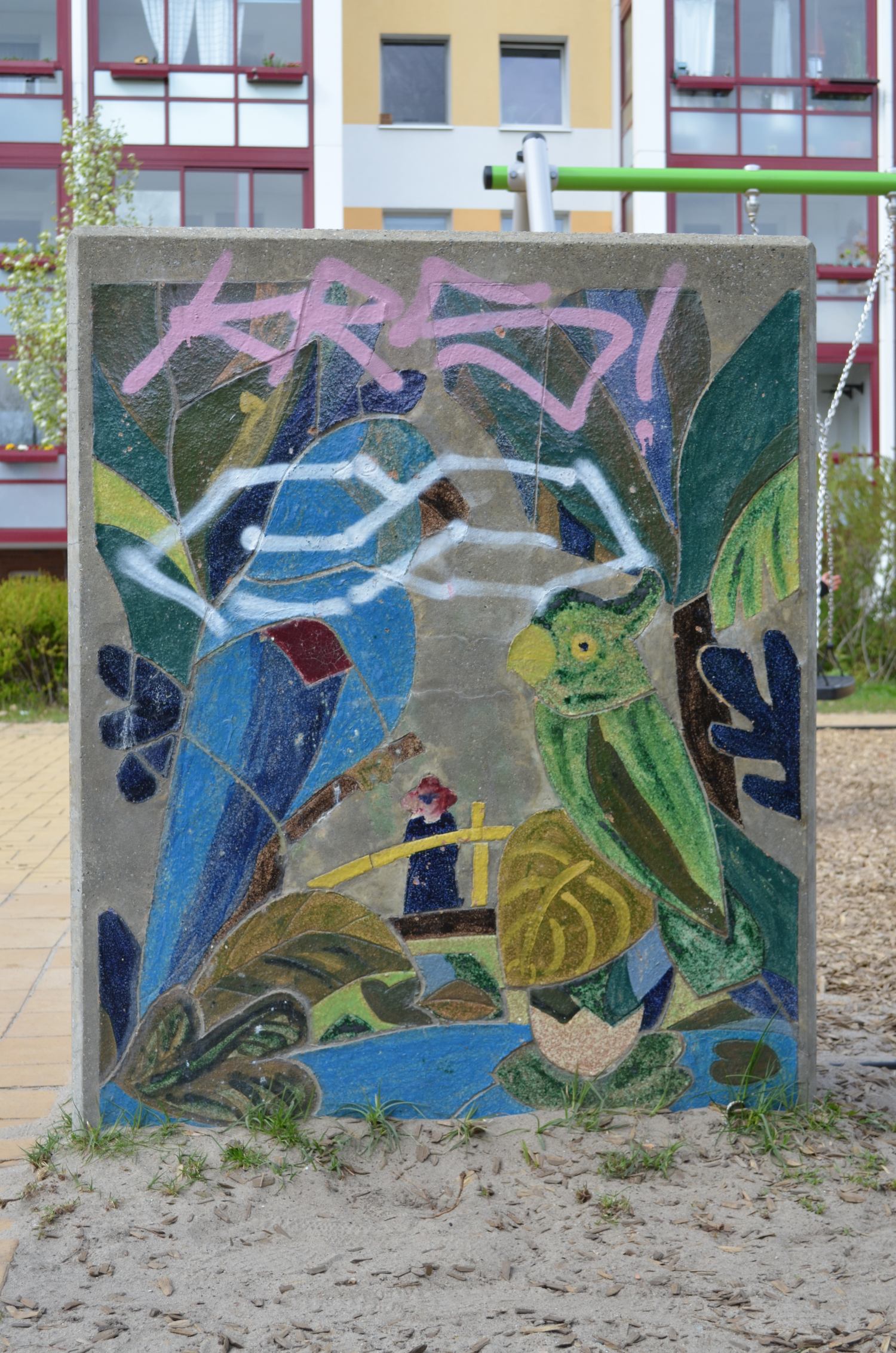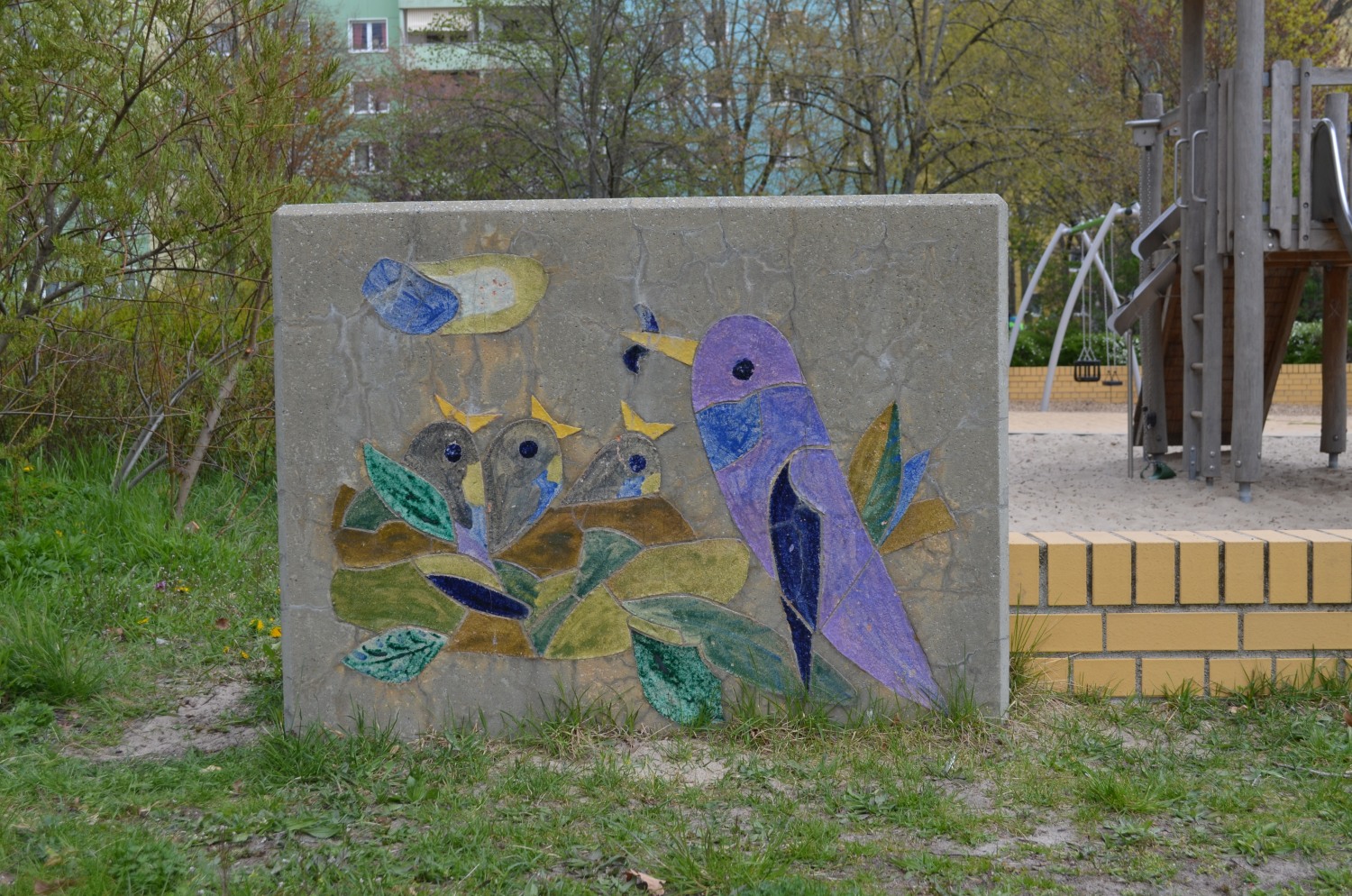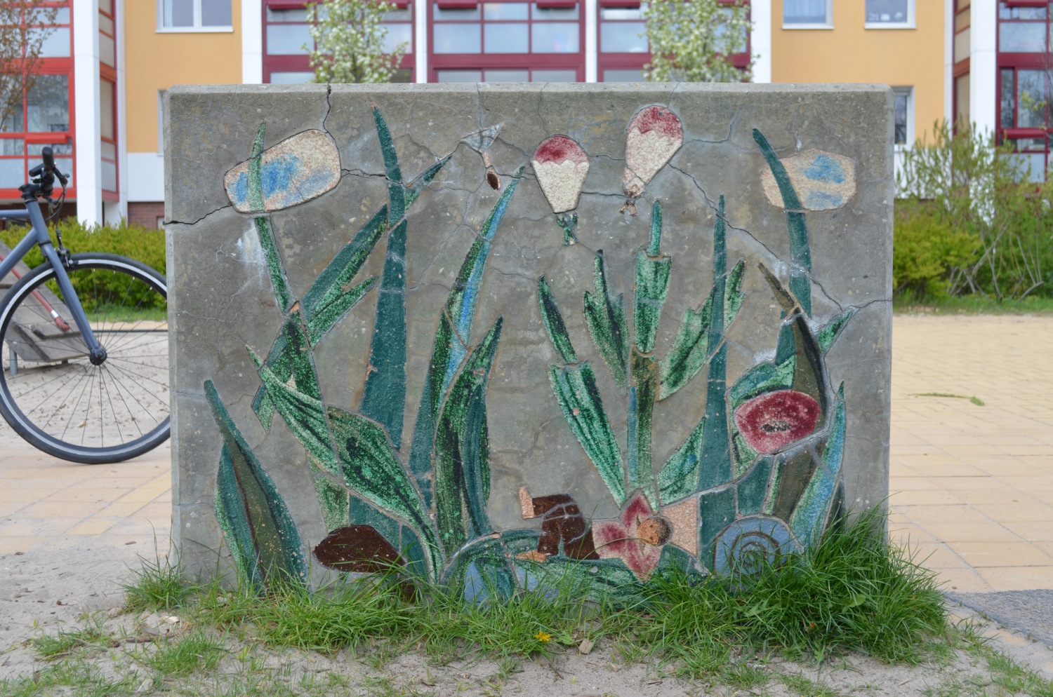 Sieben Betonblöcke in zwei verschiedenen Maßen mit insgesamt 13 Darstellungen von Tier- und Naturbildern. Die Blöcke sind (mit Ausnahme von einem Block) beidseitig gestaltet.