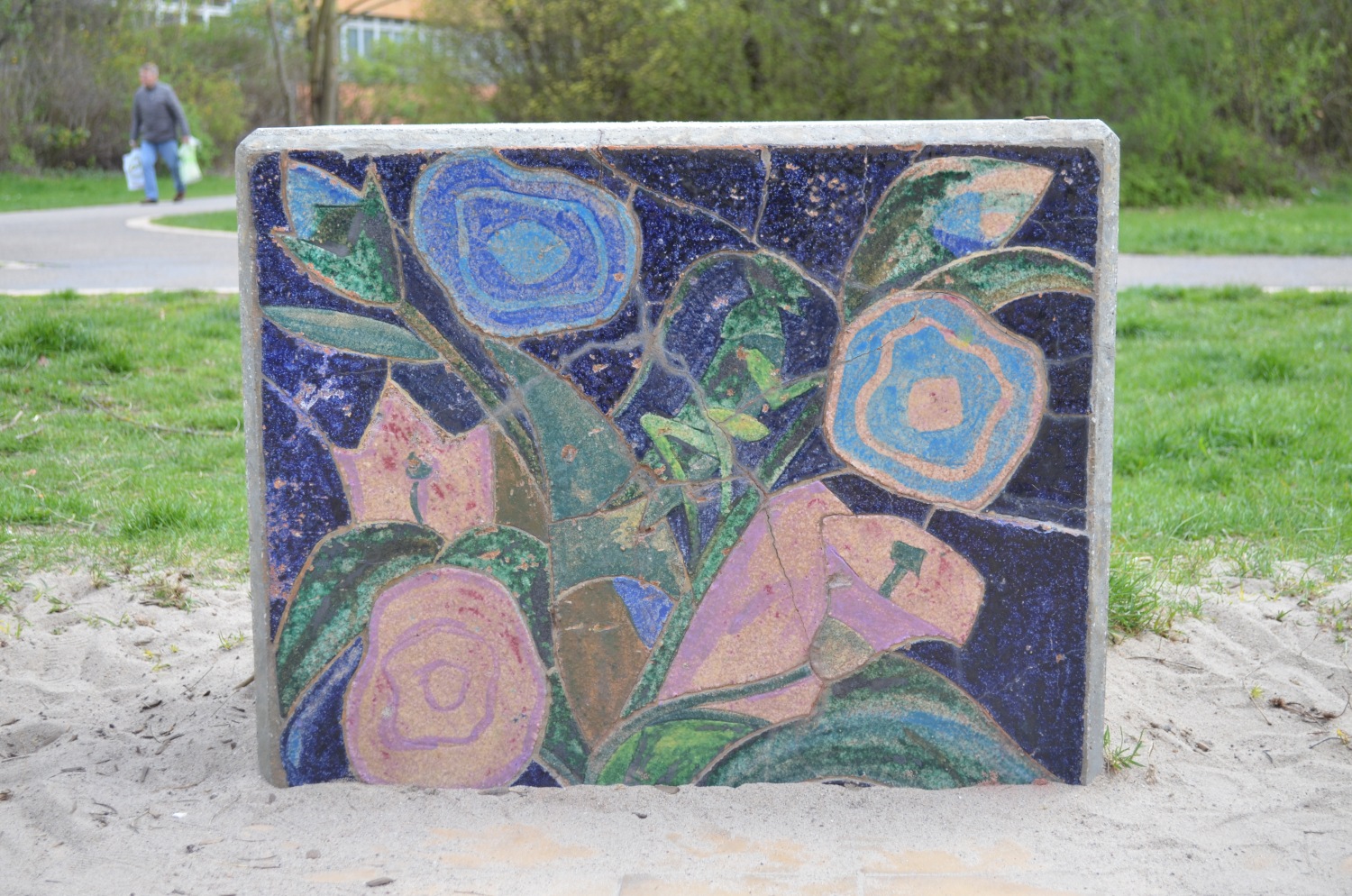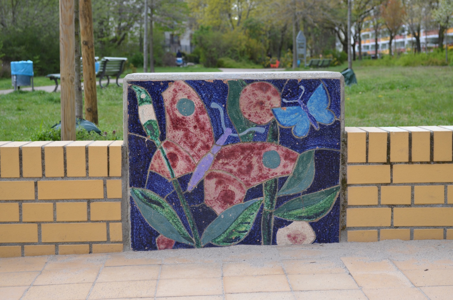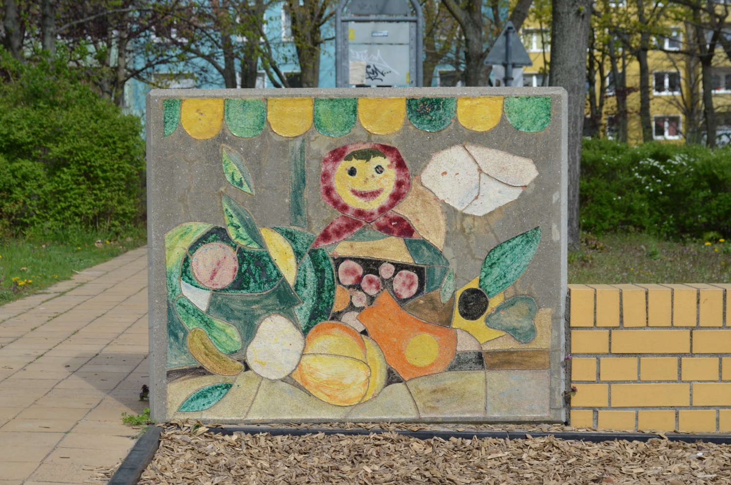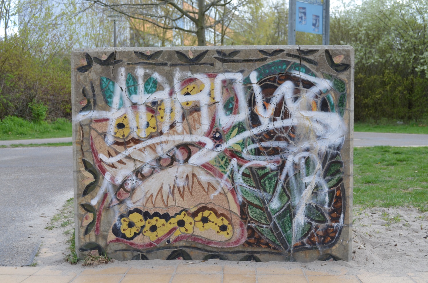 Sieben Betonblöcke in zwei verschiedenen Maßen mit insgesamt 13 Darstellungen von Tier- und Naturbildern. Die Blöcke sind (mit Ausnahme von einem Block) beidseitig gestaltet.