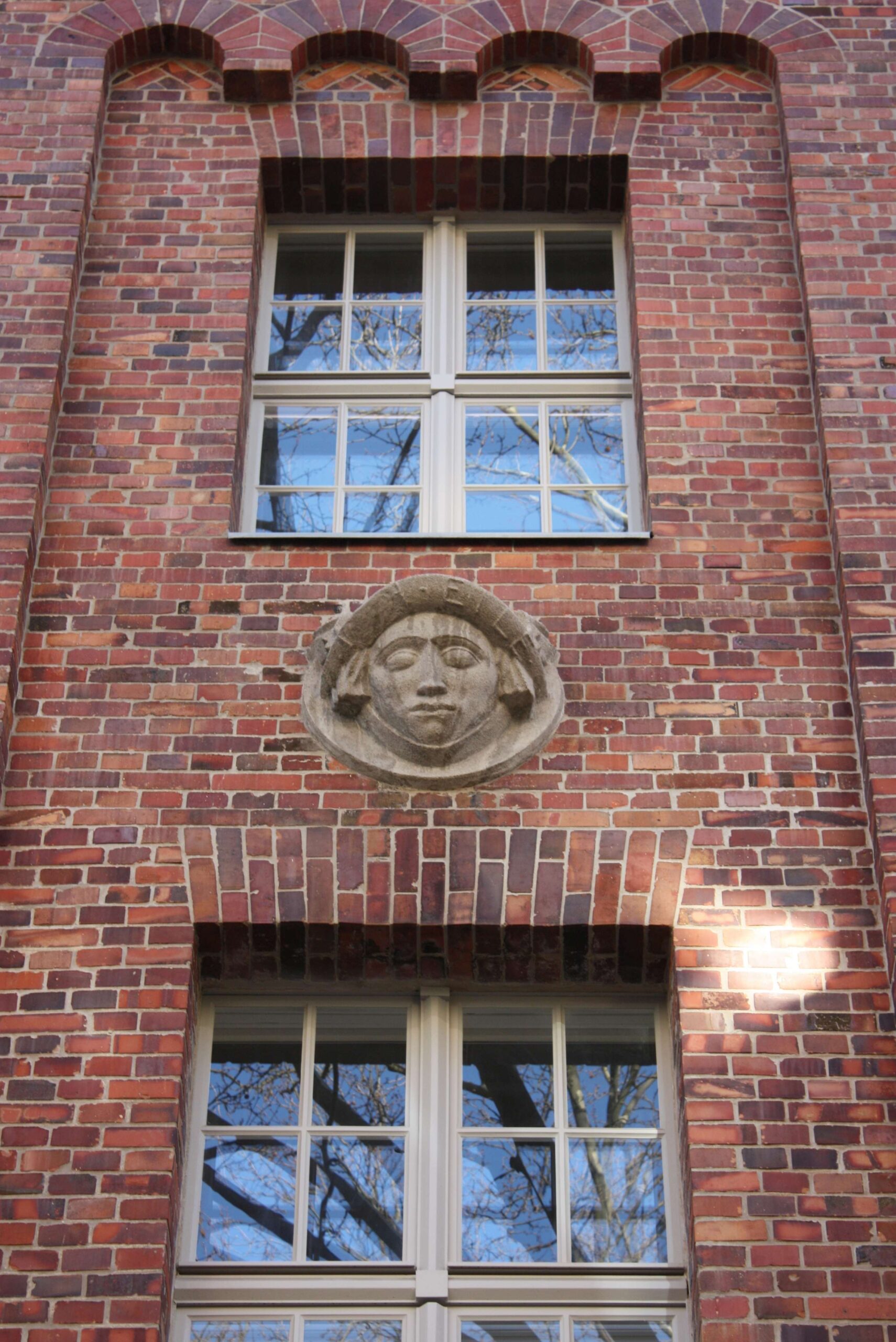 Das Nebenportal an der Westfassade des Postamtes W30 in der Welserstraße wird von versetzten Backsteinen (stilistisch orientiert an der märkischen Backsteingotik) gerahmt. Der Türbogen trägt den erhabenen Schriftzug “POSTAMT”. Dazwischen befindet sich ein Schlussstein in Form eines Pferdekopfes, links und rechts darunter zwei stilisierte (Brief-)Tauben mit Briefen im Schnabel. Über dem Nebenportal, zwischen dem ersten und zweiten Geschoss, befindet sich ein Rundrelief. Dieses stellt einen Kopf mit halblangem Haar und nach unten gerichteten, geschlossen wirkenden Augen dar. Auf dem Rand der Kopfbedeckung ist in erhabenen Buchstaben die Inschrift “KEINE EILE” zu erkennen. Der Kopf scheint aus der Wand zu wachsen (Layla Fetzer).