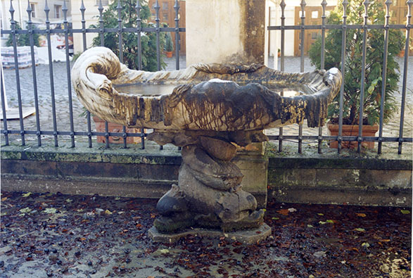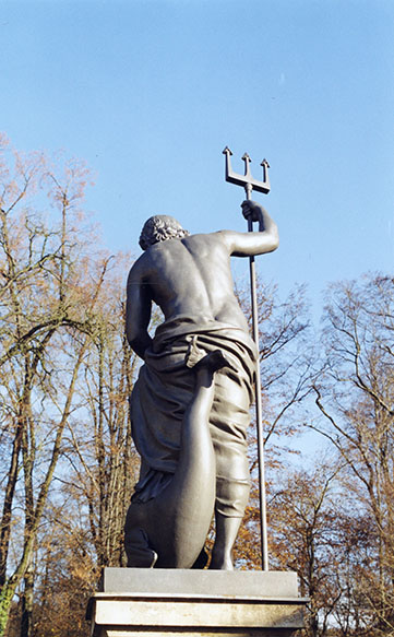 Der den Remisenhof gegen Osten abschließende eiserne Lanzettzaun birgt mittig den aufgemauerten, rechteckigen Sockel für eine mächtige, etwa lebensgroße Eisenfigur, die den Meeresgott Neptun in der typischen attributiven Ausstattung mit Dreizack und Delphin vorstellt. Außen vor den verputzten Pfeilersockel gestellt ist eine wild bewegte marmorne Brunnenschale in Form einer von verschlungenen Phantasiedelphinen getragenen Muschelschale (Jörg Kuhn).