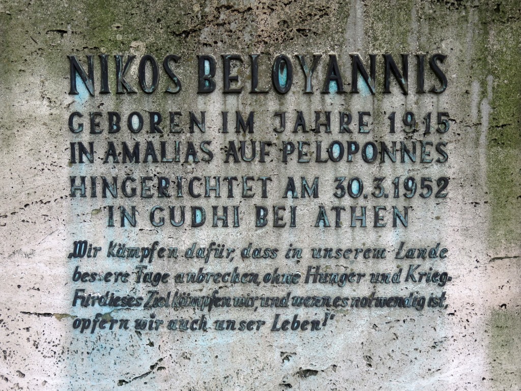 »NIKOS BELOYANNIS / GEBOREN IM JAHR 1915 / IN AMALIAS AUF PELEPONNES / HINGERICHTET AM 30.3.1952 / IN GODHI BEI ATHEN / "Wir kämpfen dafür, dass in unserem Lande / bessere Tage anbrechen ohne Hunger und Krieg. / Für dieses Ziel kämpfen wir, und wenn es notwendig ist, / opfern wir auch unser Leben!"«