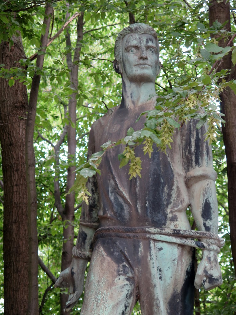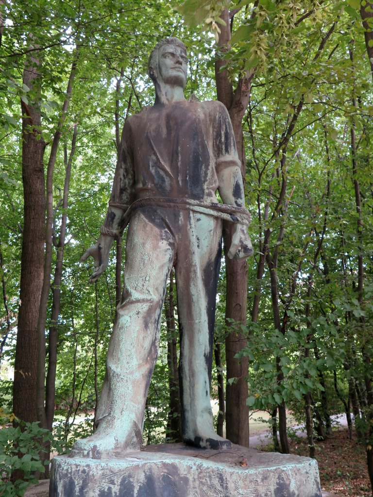 Standfigur eines gefesselten Mannes auf einem rechteckigen Steinsockel. Dargestellt ist der 1952 in Athen-Goudi hingerichtete griechische, kommunistische Politiker Nikos Beloyannis (Belogiannis).