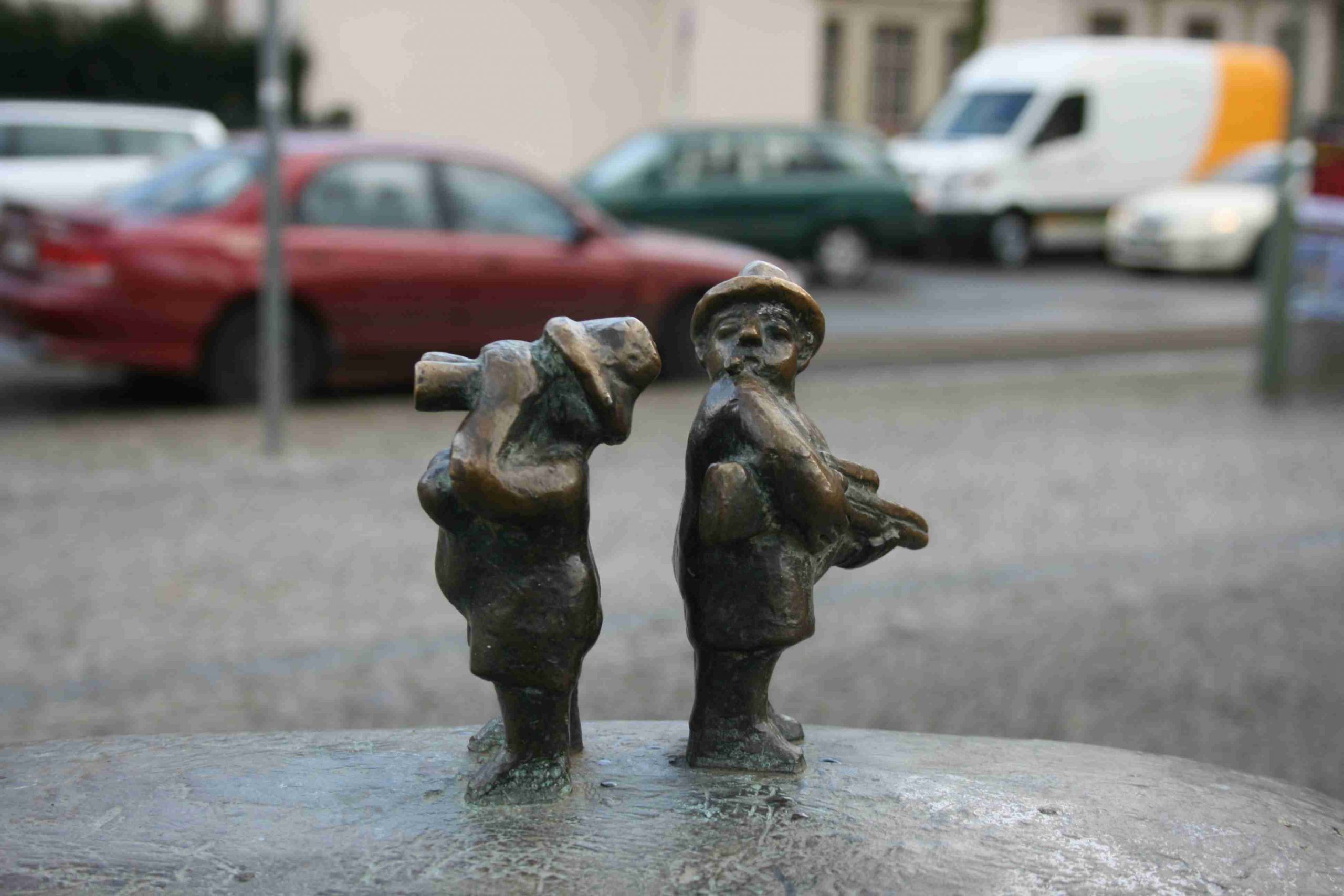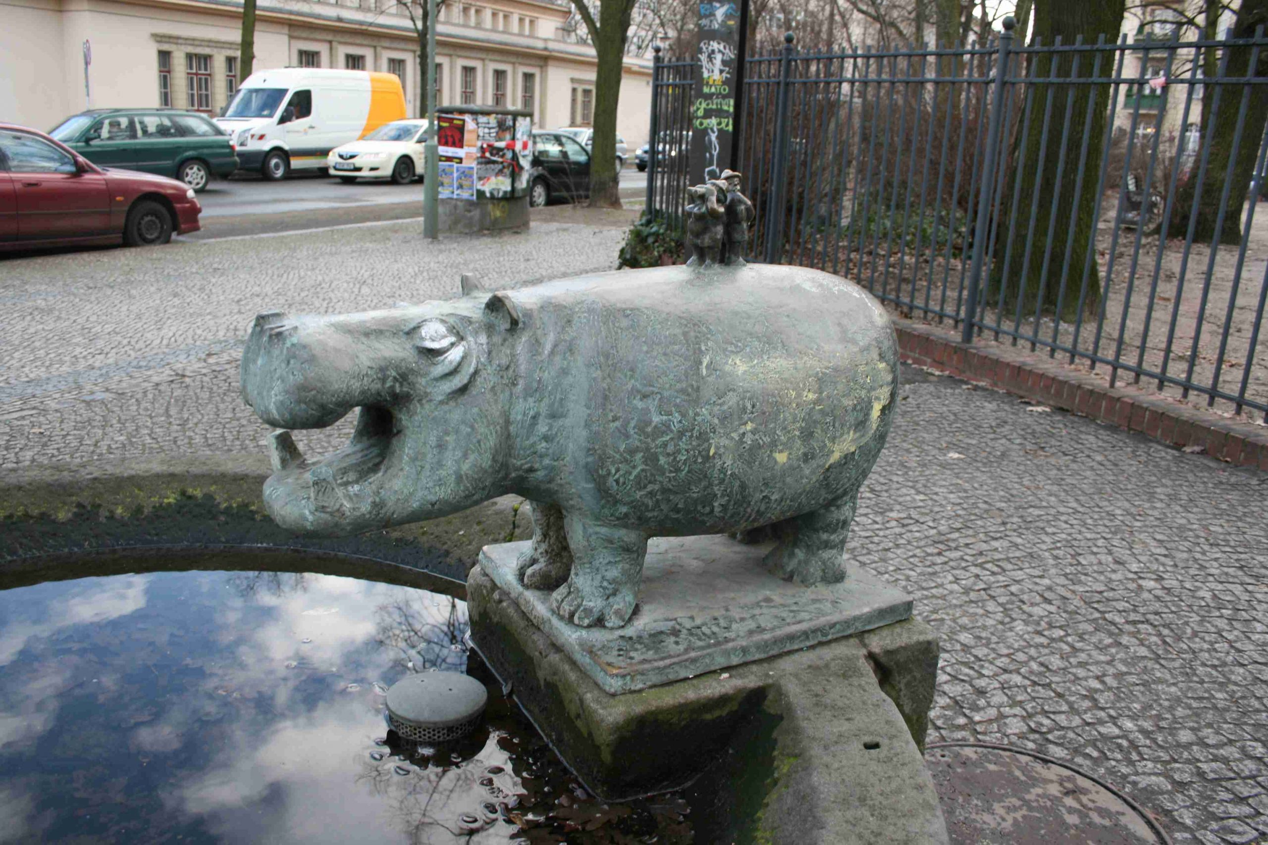 Auf einem gepflasterten spitzen Dreieck vor dem Parkeingang zum Wühlischplatz an der Ecke Holteistraße steht auf drei steinernen Stützen über einem runden Standsockel eine runde flache Brunnenschale aus Sandstein. An der zum Park hinweisenden Seite ist die Stütze zu einem Sockel ausgearbeitet, der in die Schale hineinragt und die Standfläche für eine Bronzeplastik bildet. Es handelt sich um die Figur eines leicht stilisierten Nilpferdes, auf dessen Rücken die Miniaturen zweier Menschen stehen: Ein Jäger mit Gewehr und eine Frau (die Jägerin) mit Fernglas, die offensichtlich auf Nilpferdjagd sind und sich nicht über die Dimensionen ihrer Beute, auf der sie zudem noch unwissentlich stehen, nicht im Klaren sind. Das Nilpferd hat die Funktion eines Wasserspeiers, das Wasser tritt bei Brunnenfunktion aus den Nasenlöchern aus (Jörg Kuhn, Susanne Kähler).