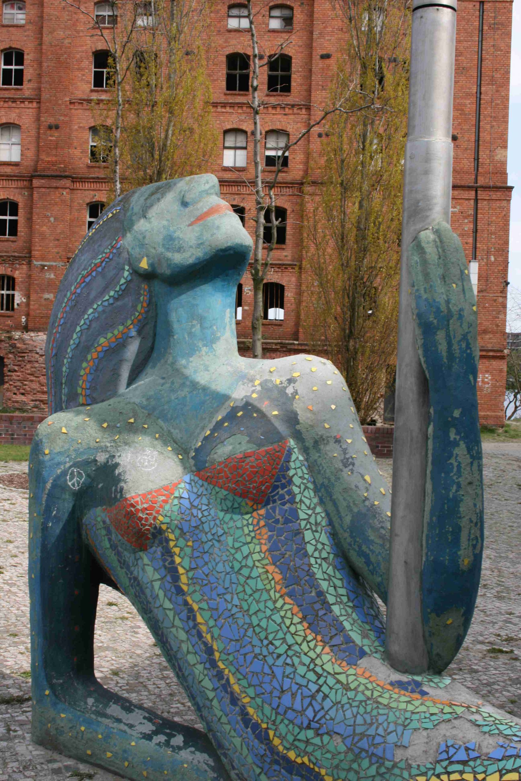 Auf einem gepflasterten und teilweise begrünten Platz steht die deutlich überlebensgroße Skulptur einer liegenden Nixe. Das Mischwesen mit weiblichem Oberkörper und Fischleib hat sich auf den rechten Arm gestützt und den Kopf dergestalt in den Nacken gelegt, dass der mächtige Haarschopf malerisch herabfällt. Mit der linken Hand umfasst die Nixe einen hohen schlanken Stahlmast, der aus verschiedenen Stahlelementen zusammenmontiert ist (vermutlich beweglich gedacht). Seine Bekrönung ist ein Schiff. Am Stangenmast sind mit Halterungen zwei kleinere Nixen angebracht, die spielerisch im Wasser zu schwimmen scheinen. Die Figuren sind aus Beton geformt und bunt bemalt. Die große Nixe ist aufwändig mit Mosaikkeramik verziert (Susanne Kähler, Jörg Kuhn).