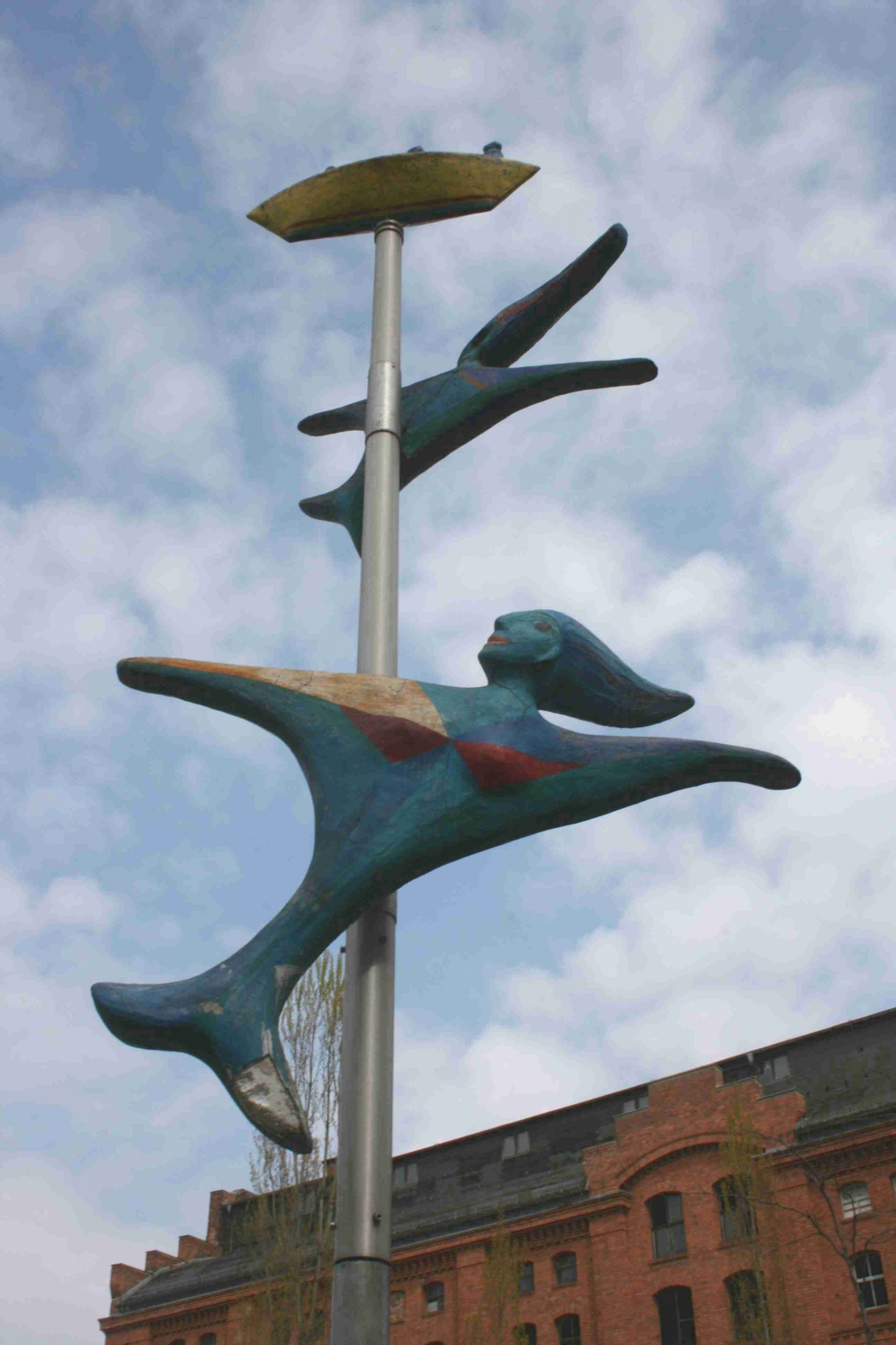 Auf einem gepflasterten und teilweise begrünten Platz steht die deutlich überlebensgroße Skulptur einer liegenden Nixe. Das Mischwesen mit weiblichem Oberkörper und Fischleib hat sich auf den rechten Arm gestützt und den Kopf dergestalt in den Nacken gelegt, dass der mächtige Haarschopf malerisch herabfällt. Mit der linken Hand umfasst die Nixe einen hohen schlanken Stahlmast, der aus verschiedenen Stahlelementen zusammenmontiert ist (vermutlich beweglich gedacht). Seine Bekrönung ist ein Schiff. Am Stangenmast sind mit Halterungen zwei kleinere Nixen angebracht, die spielerisch im Wasser zu schwimmen scheinen. Die Figuren sind aus Beton geformt und bunt bemalt. Die große Nixe ist aufwändig mit Mosaikkeramik verziert (Susanne Kähler, Jörg Kuhn).