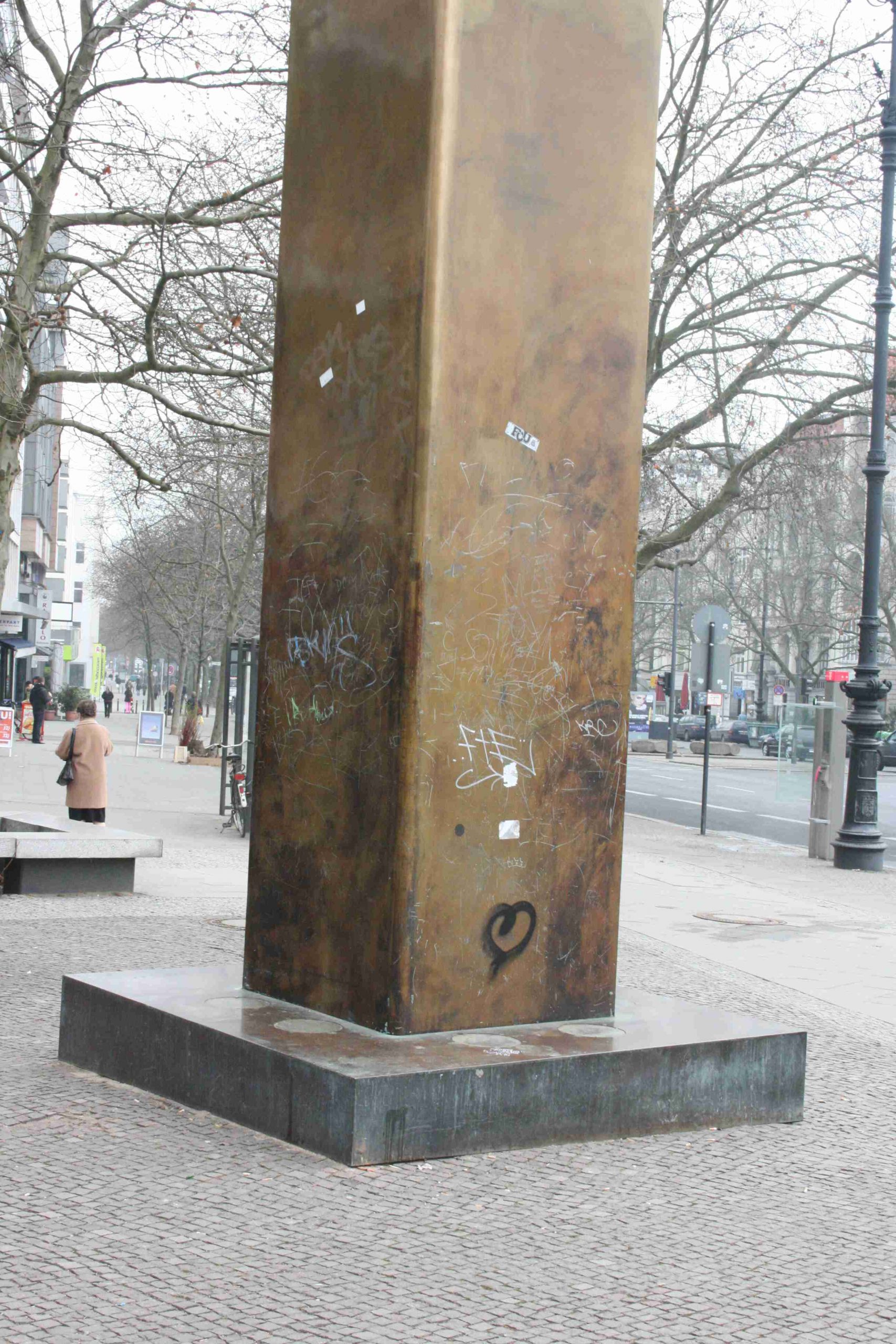 Auf leicht abfallendem Gelände steht, den Niveauunterschied ausgleichend, umgeben von kleinteiligem Pflaster, der quadratische Sockel eines mächtigen „Obelisken“. Der Sockel ist aus mehreren gegossenen Bronzeelementen geschweißt und innen hohl. Je Seite sind in die Oberseite zwei runde Glasschreiben in die Bronze eingetieft und verschraubt. Darunter verbirgt sich die Lichttechnik. Am Sockel, an der Südostecke, ist vertieft die Bezeichnung (in Schreibschrift) zu lesen. Der Pfeiler (Obelisk), erhebt sich, eingezogen, auf dem Sockel über quadratischem Grundriss. Die Kanten sind abgerundet. Der Obelisk ist aus verschiedenen Teilen in Bronze gegossen und verschweißt. Auf der Ostseite befindet sich eine rechteckige Zugangsöffnung, verschlossen mit einer verschraubten Bronzeplatte. Oben endet der Obelisk von Westen nach Osten pultartig ansteigend. Das ganze Kunstwerk ist goldbraun patiniert. Der Obelisk hat ein Innengerüst aus verzinktem Stahl (Jörg Kuhn, Susanne Kähler).
