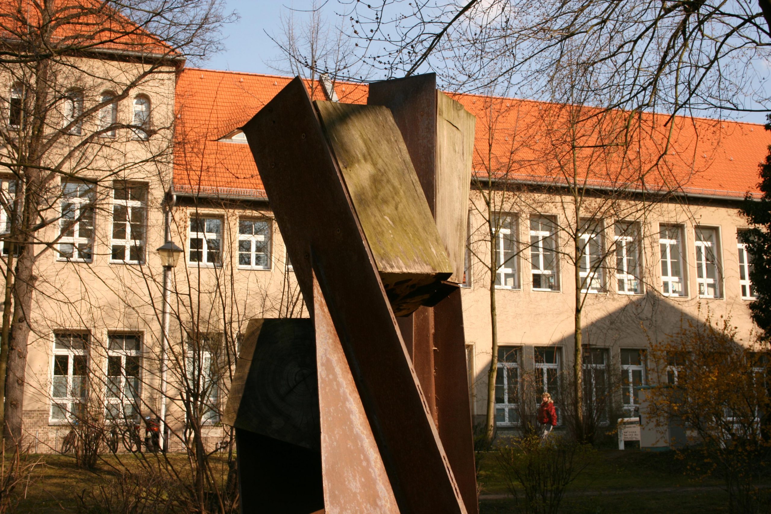 Auf einem niedrigen Betonsockel steht die Skulptur, die aus miteinander verschweißten künstlich korrodierten Stahlplatten und Holzblöcken besteht. Die Verbindung von Flächen, rechten Winkeln und schrägen Kanten erinnert entfernt an die Kunst des Bauhauses. Mit der Verbindung zwischen Stahl und Holz könnte der Gegensatz zwischen Technik und Natur thematisiert sein (Jörg Kuhn, Susanne Kähler).
