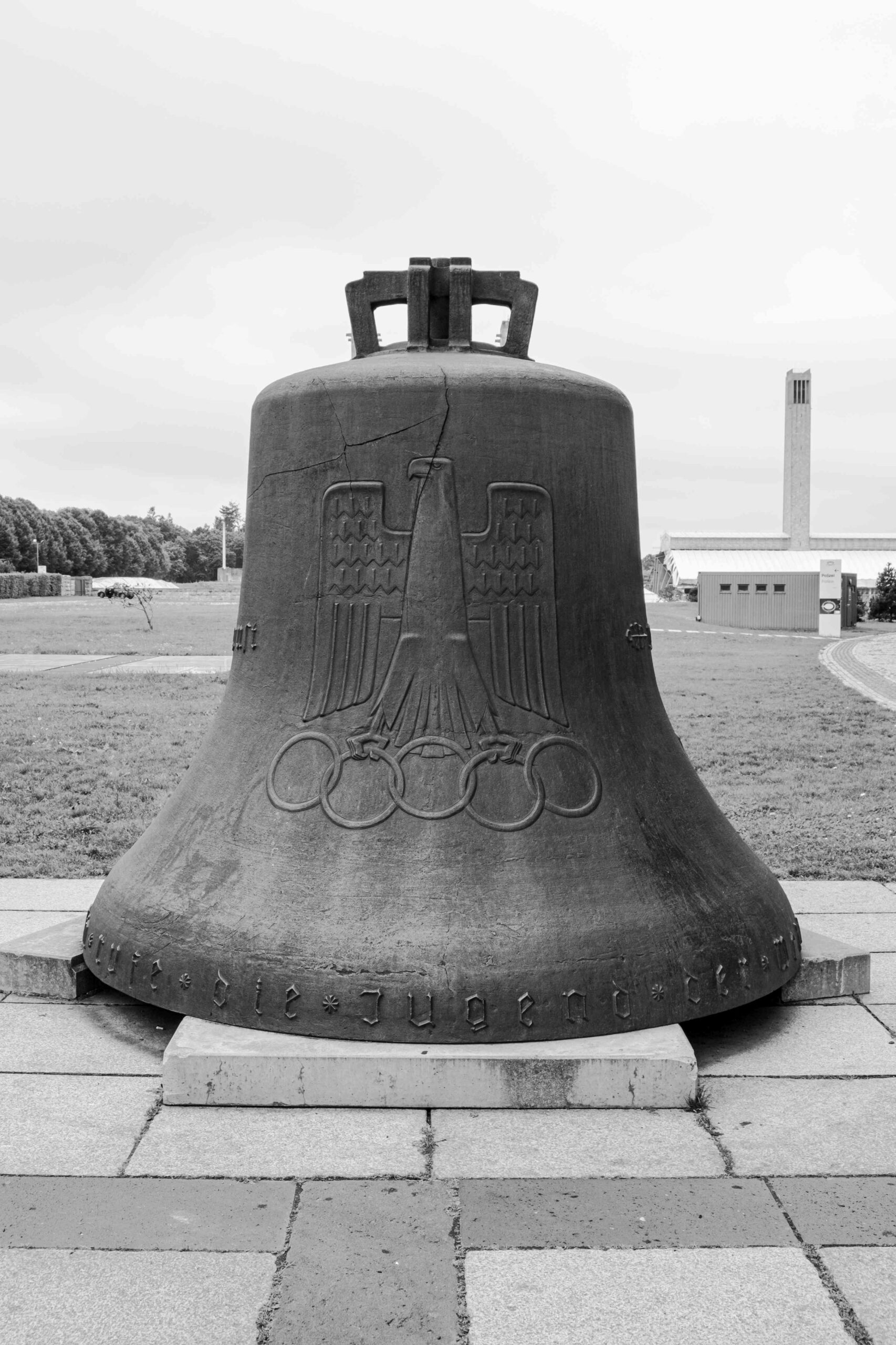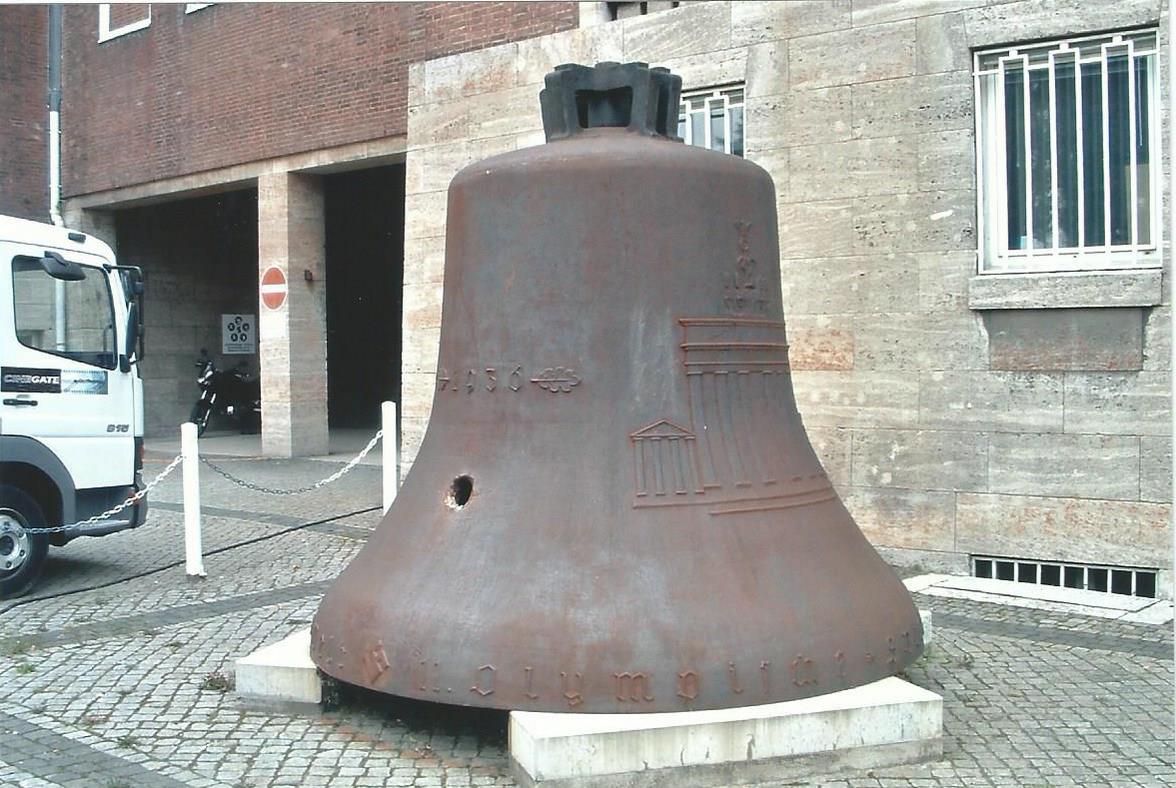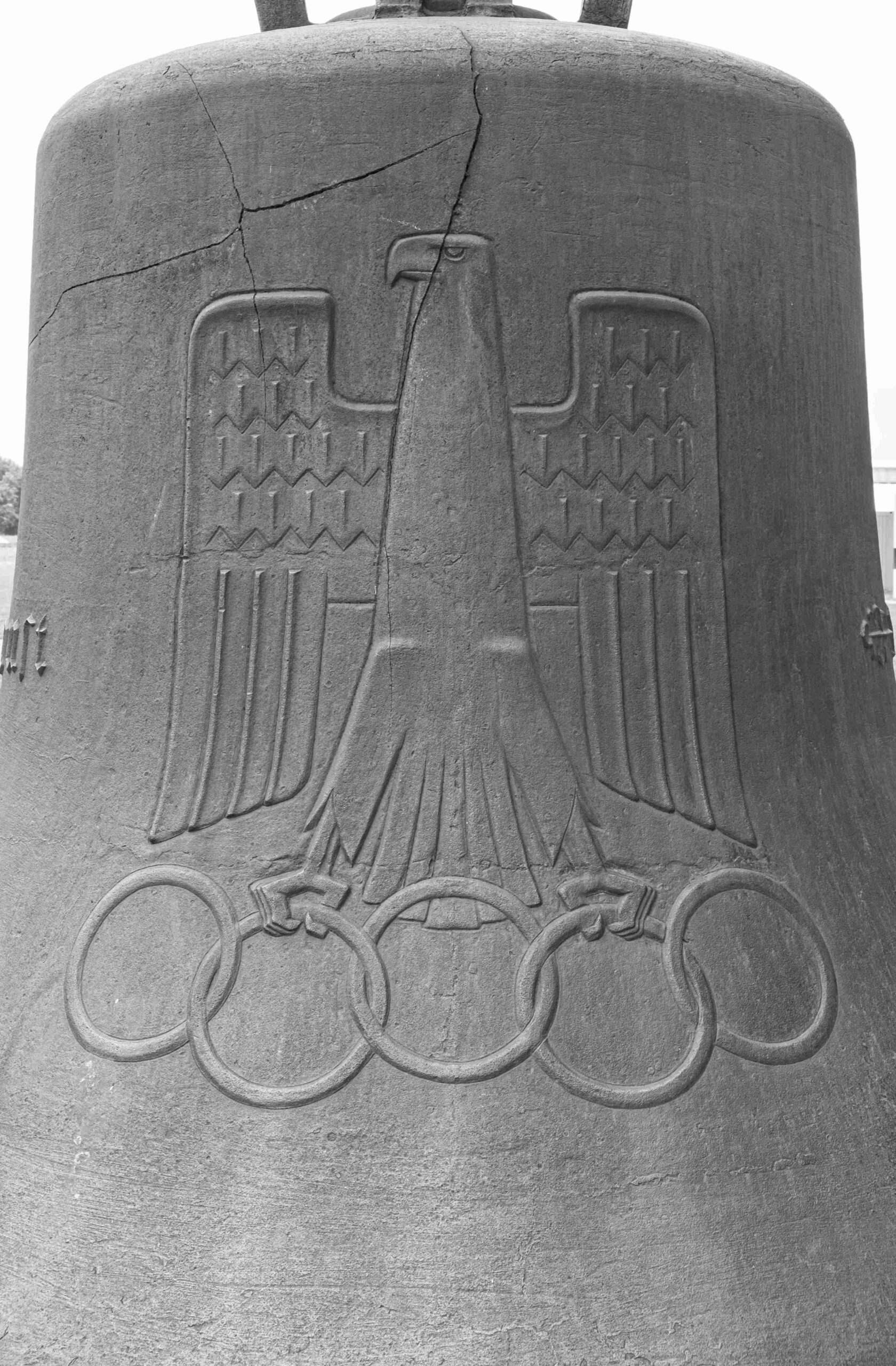 Die Idee zu dieser Glocke ging von Theodor Lewald aus, eine Skizze fertigte der in Berlin tätige Graphiker Johannes Böhland an. Die Glocke wurde am 18. Juli 1933 daraufhin zum offiziellen Symbol der Olympischen Spiele erklärt. An der Skizze von Böhland orientierte sich der Bildhauer Walter E. Lemcke mit seinem Entwurf und Modell. Lemcke, Schüler der Berliner Kunstgewerbeschule, ist während der Zeit des Nationalsozialismus in erster Linie mit der Gestaltung Wappen und Friesen, das heißt bauplastischen Arbeiten, betraut worden. Die Olympiaglocke, eine Stiftung der "Bochumer Verein für Gussstahlfabrikation AG", wurde 1936 im Glockenturm am Maifeld aufgehängt. Am 15. Februar 1947 fiel die Glocke bei der von den britischen Alliierten angeordneten Sprengung des (später wieder errichteten) Turms und wurde im Anschluss zum Schutz vor Metalldiebstahl in einem Bombentrichter vergraben. Am 18. Dezember 1956 wurde sie geborgen. 1957 am Südtor aufgesockelt. 1982 weihte der NOK-Präsident Willi Daume die mit einer Inschriftenplatte versehene Glocke als Antikriegsdenkmal ein. Die Stahlglocke stand 2005 in provisorischer Aufstellung südlich vor dem Haus des Deutschen Sports auf drei rechteckigen Betonplatten (Susanne Kähler).