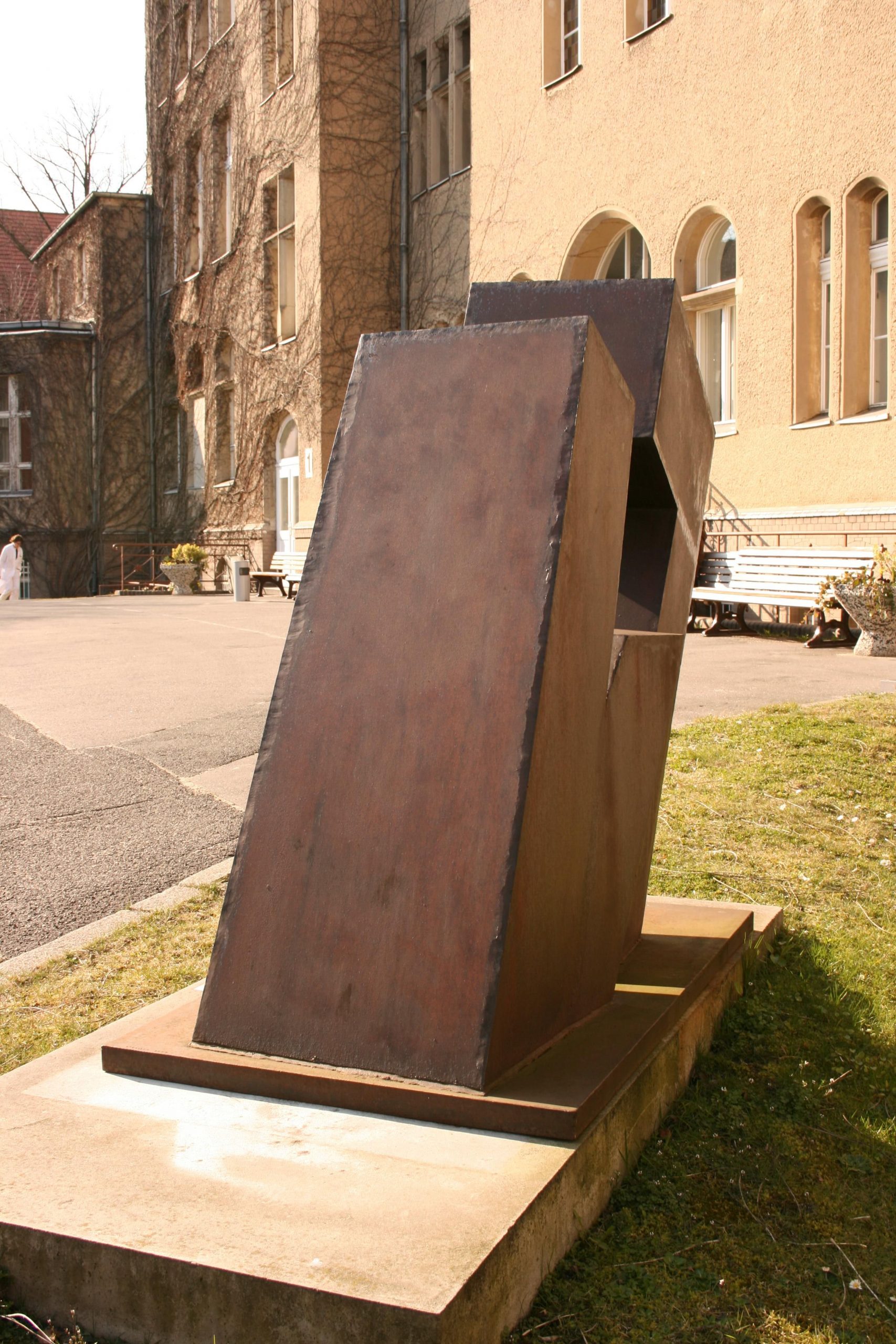 Hinter dem Altbau (Haus 1) des Auguste-Viktoria-Krankenhauses, auf der dort angelegten Grünfläche in unmittelbarer Nähe zum Haus, steht auch die dritte Skulptur Rüdiger Preislers aus Stahl mit dem Titel „Paar“. In diesem Fall hat Preisler eine rechteckige Grundfläche gewählt, die auf der rechteckigen Betonsockelplatte montiert ist. Breite Elemente aus Stahl mit künstlich korrodierter rostroter Oberfläche neigen sich zu einer Seite (Jörg Kuhn, Susanne Kähler).