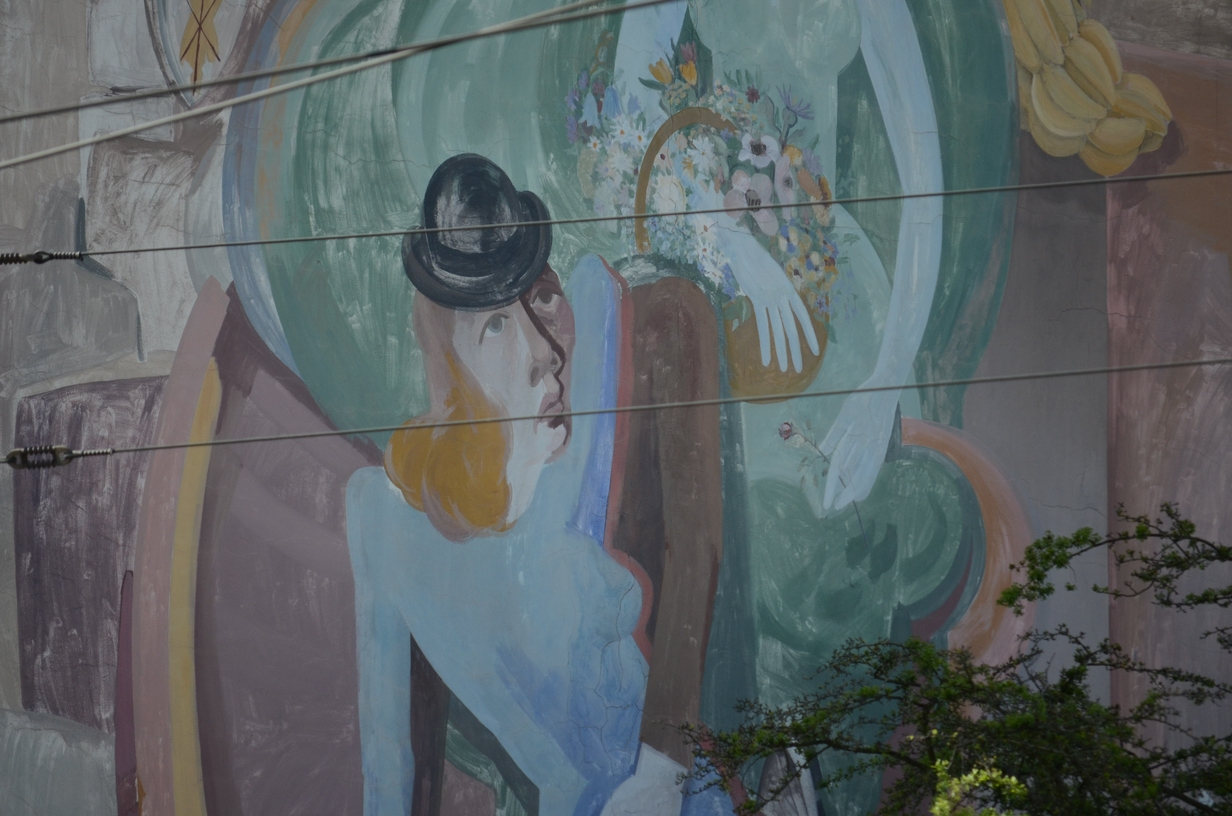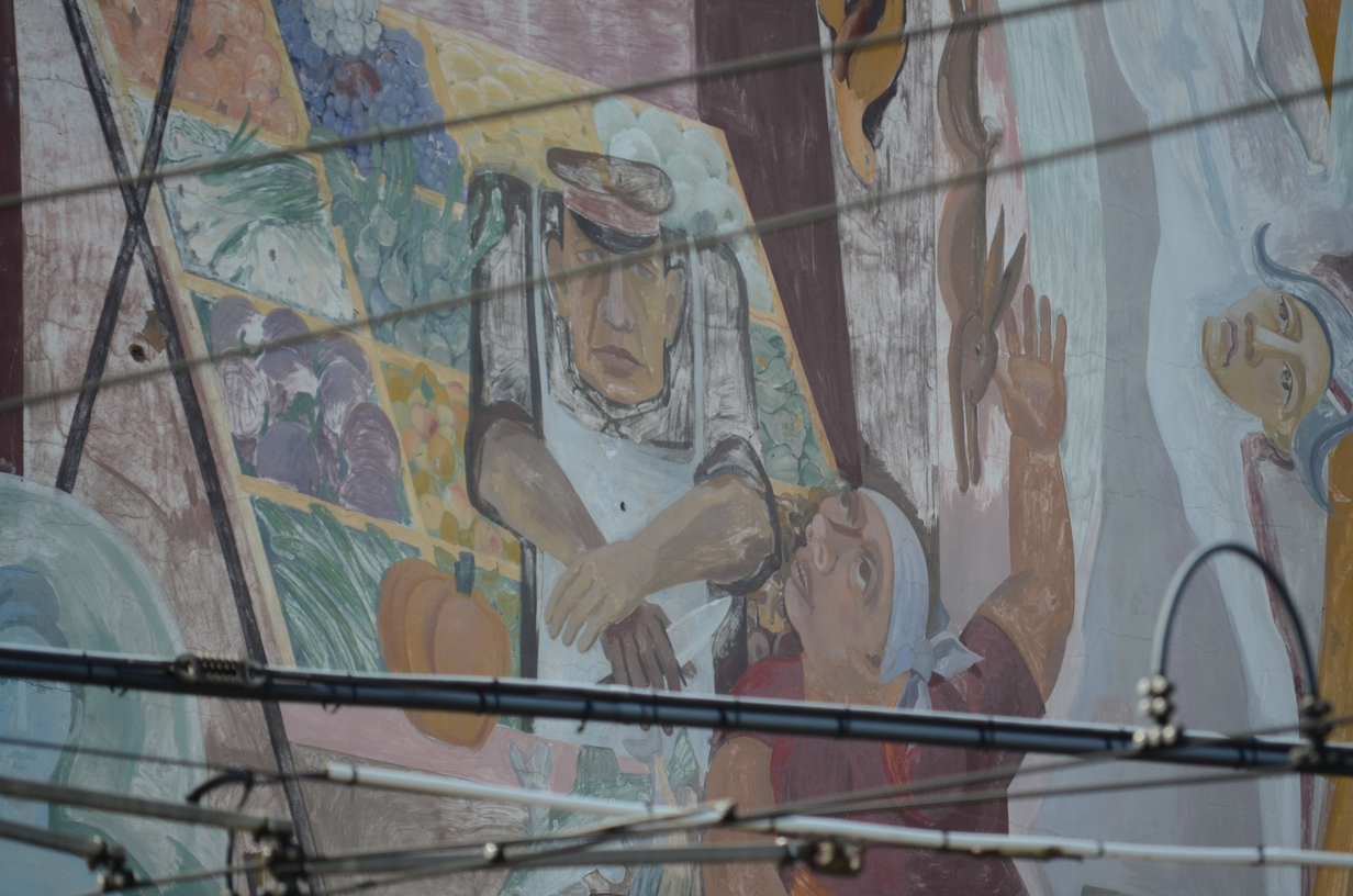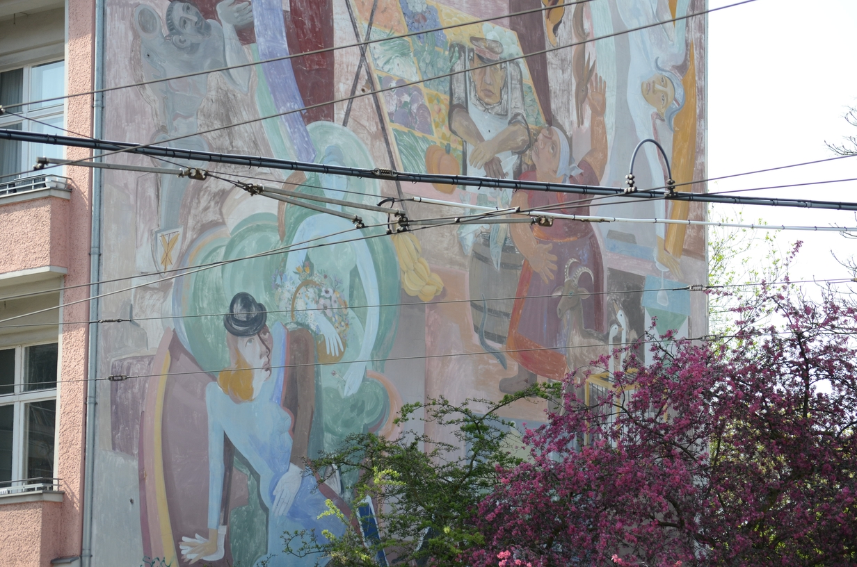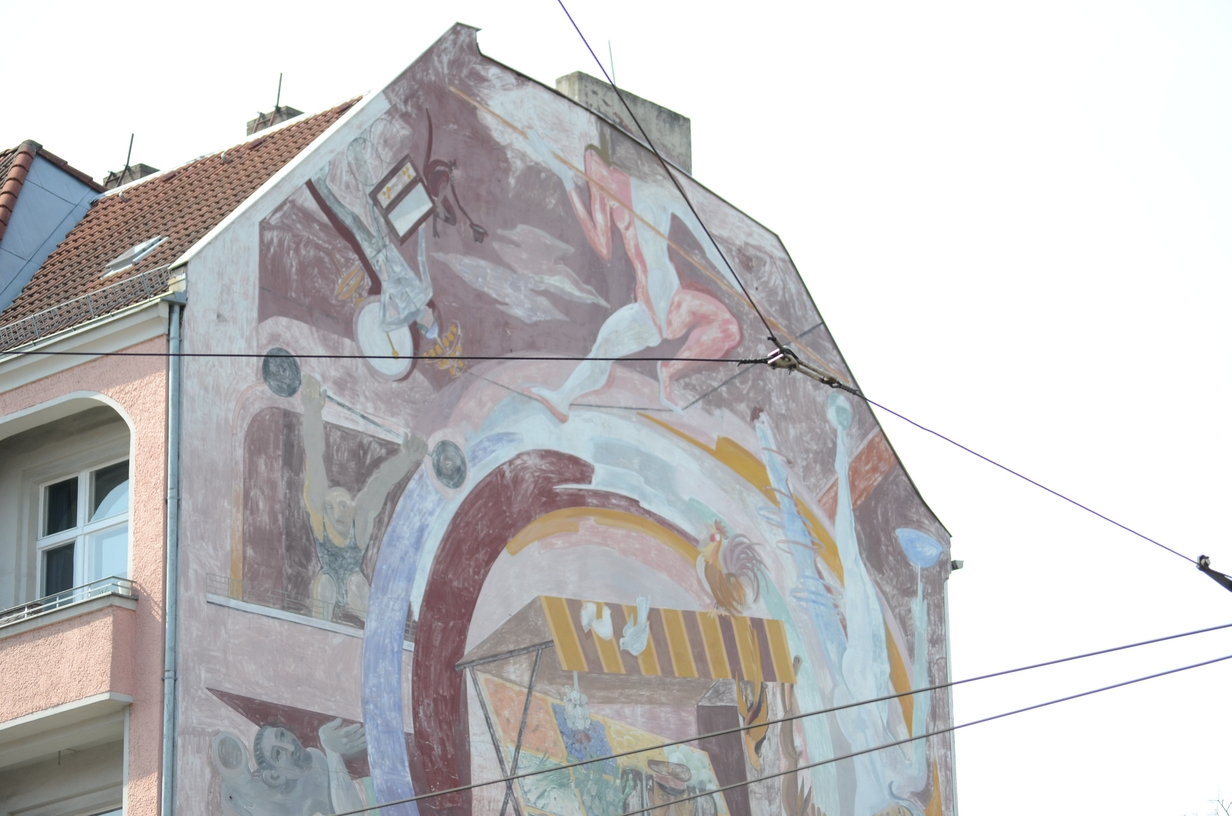 Die Giebelmalerei an einer Brandmauer eines Wohnhauses an der Berliner Straße 1 in Pankow stellt in einer Vielzahl von Formen, Farben und Motiven die Lebhaftigkeit des Pankower Wochenmarkts dar.