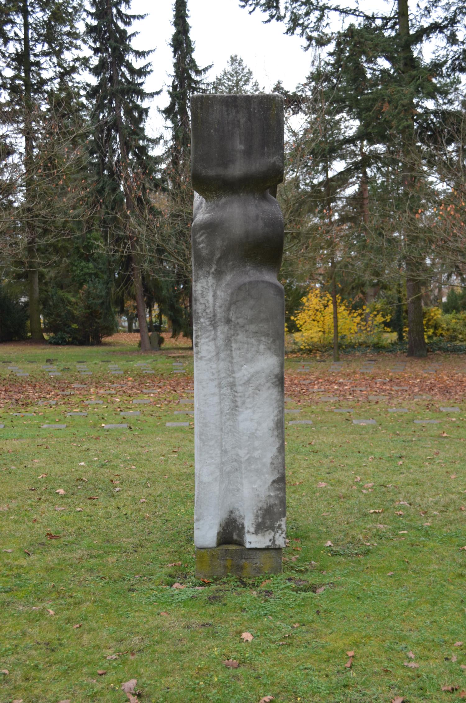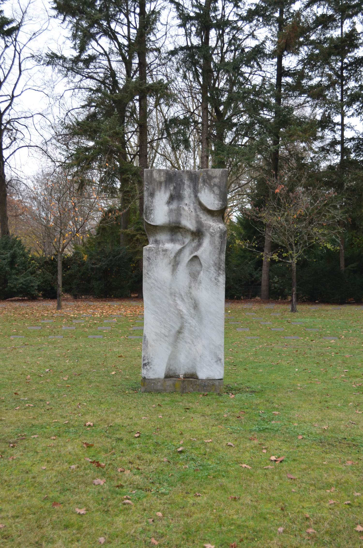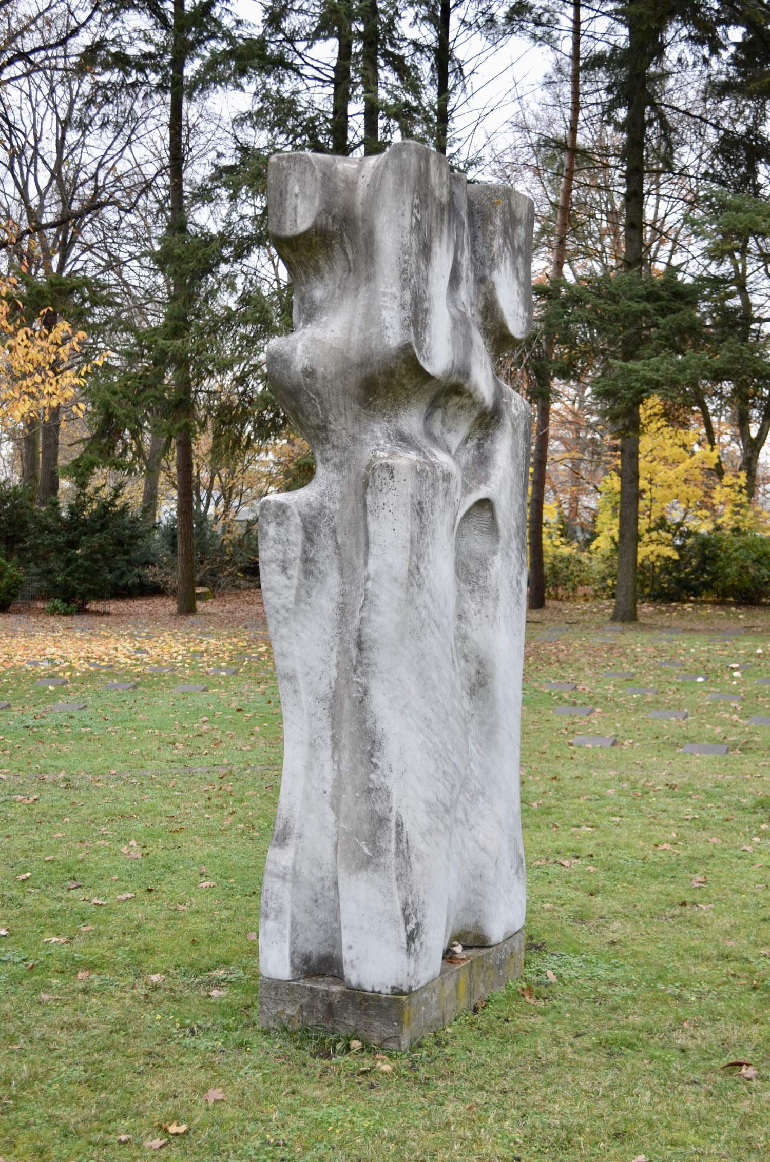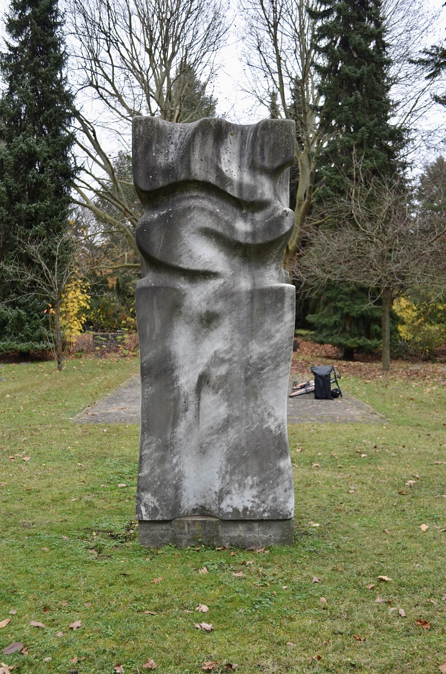 Die Skulptur steht auf einem kleinen Betonsockel, welcher frei auf einer Rasenfläche platziert ist.