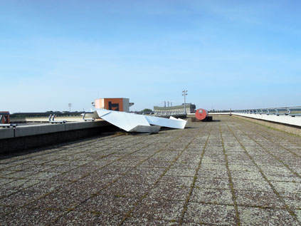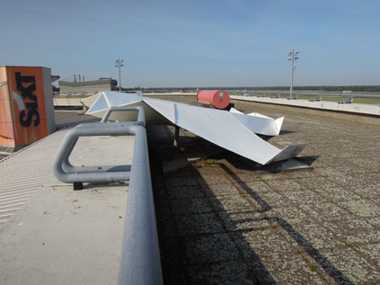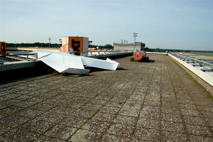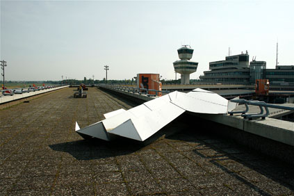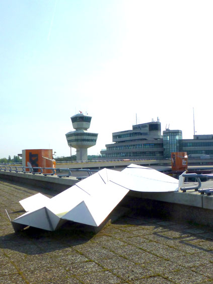 Die Freiplastik mit dem Titel „Papierflieger“ ist auf der Besucherterrasse des Flughafen Tegel montiert. Das Aluminium-Objekt in Form eines gefalteten Papierfliegers erhält sowohl durch den Titel als auch die Materialoberfläche eine gewisse Leichtigkeit. Die Assoziation mit dem Material Papier wird durch sichtbare „Knickkanten“ verstärkt. Die Aluminiumblech-Platten werden durch Nieten zusammengehalten. Das Kunstwerk ist zudem mit einem weißen Farbanstrich versehen. Die Plastik ist an zwei Stahlrohrstützen befestigt und liegt mit dem vorderen Teil auf der Brüstung der Terrasse auf und scheint jeden Augenblick von dieser abzuheben. Der linke Flügel gründet auf drei übereinander gelegten Stahlplatten, die auf ein Gummimatte aufgelegt sind. An seinem Tiefpunkt hat der „Flieger“ ein Loch als Wasserablauf (Layla Fetzer).