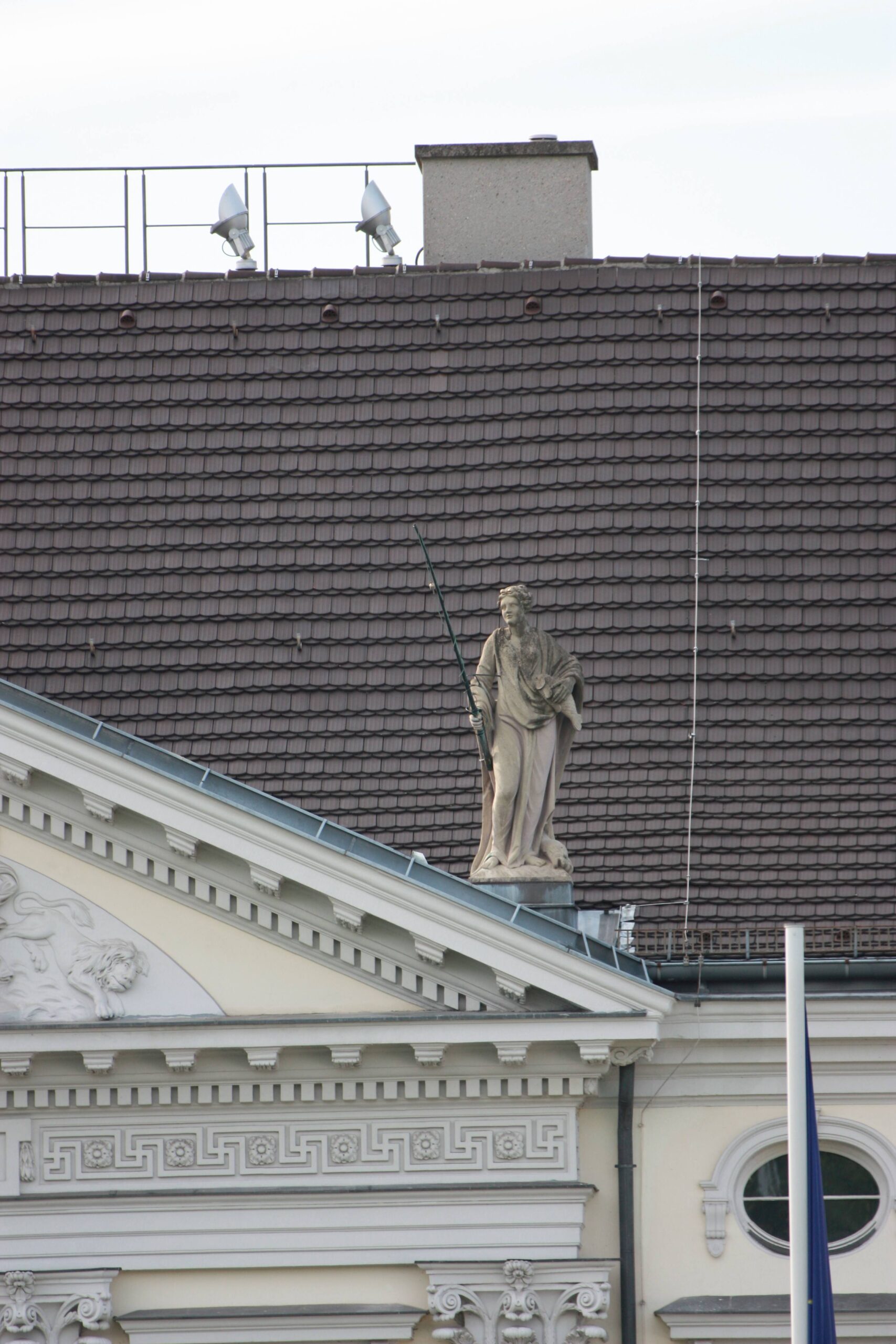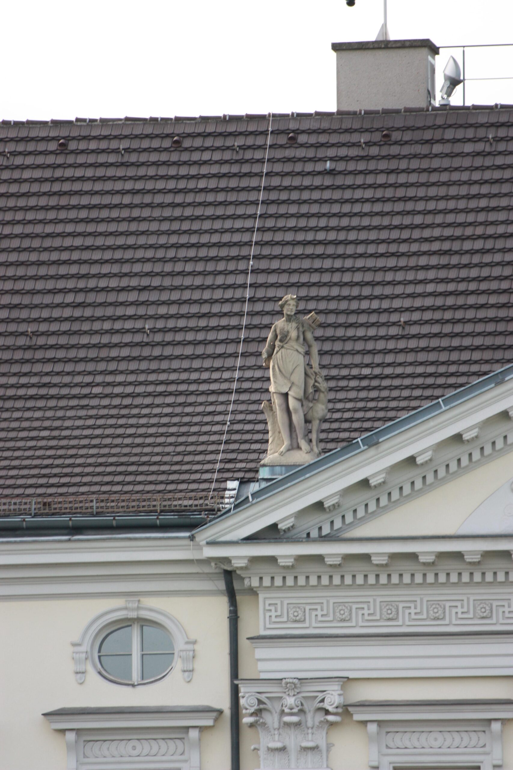 Die Sandsteinfiguren wurden um 1790, im Zuge der Erweiterung des Schlosses, von Christian Eckstein und Johann Gottlieb Heymüller geschaffen. Sie verweisen als Personifikationen der Jagd, des Ackerbaus und des Fischfangs auf die einst ländliche Umgebung des Schlosses (vgl. Denkmaldatenbank Berlin: https://denkmaldatenbank.berlin.de/daobj.php?obj_dok_nr=09050346).