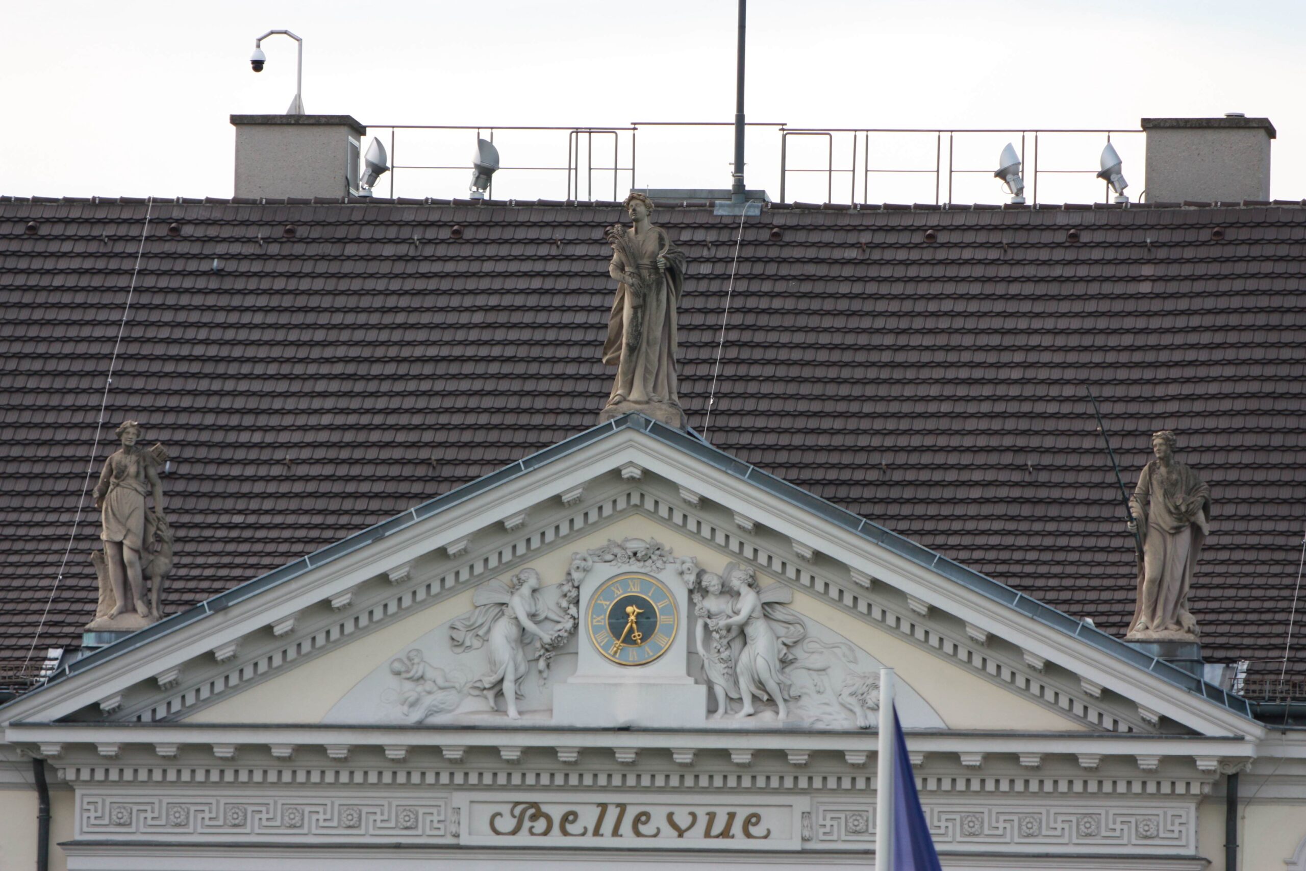 Das Giebeldreieck des Schloss Bellevue ist bekrönt von drei Standfiguren aus Sandstein. Die Personifikationen der Jagd, des Ackerbaus und der Fischzucht (v.l.n.r.) stehen auf flachen Plinthen und blicken in östliche Richtung. Die linke Figur stellt Diana (röm.), die Göttin der Jagd, erkennbar an dem Sichelmond als Kopfschmuck dar. Zu ihren Füßen steht ein Hund, auf dem Rücken trägt sie einen Köcher mit Pfeilen. Die mittlere Figur auf der Spitze des Giebels ist Ceres (röm.), die Göttin des Ackerbaus und der Fruchtbarkeit. Diese hält zu einem Bündel zusammengeschnürte Getreideähren im Arm, eine Sichel in der anderen Hand. Auf ihrem Haar befindet sich ein Ährenkranz. Die rechte Figur zeigt die Personifikation des Fischfangs mit Angel in der linken und Fisch in der rechten Hand (Layla Fetzer).