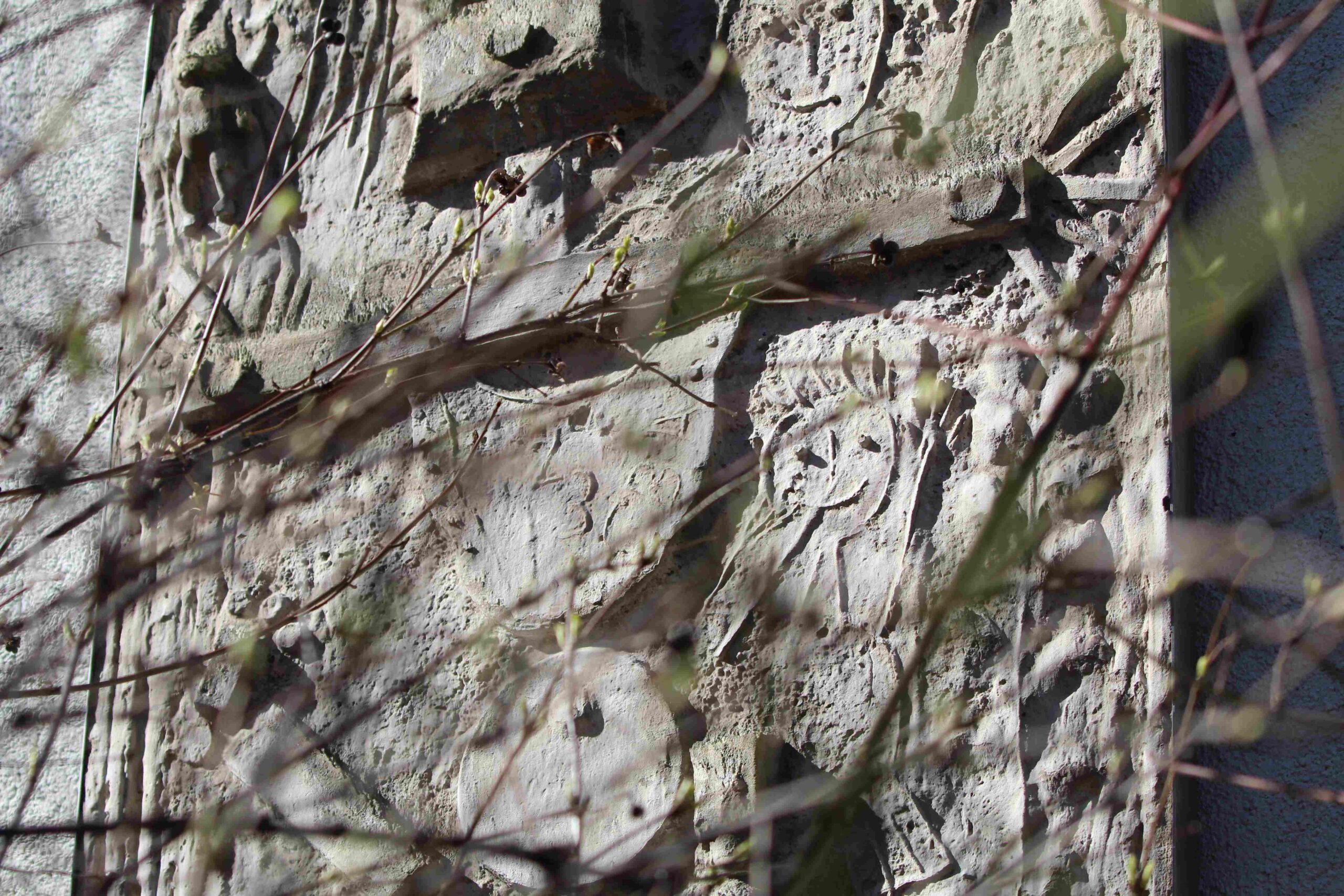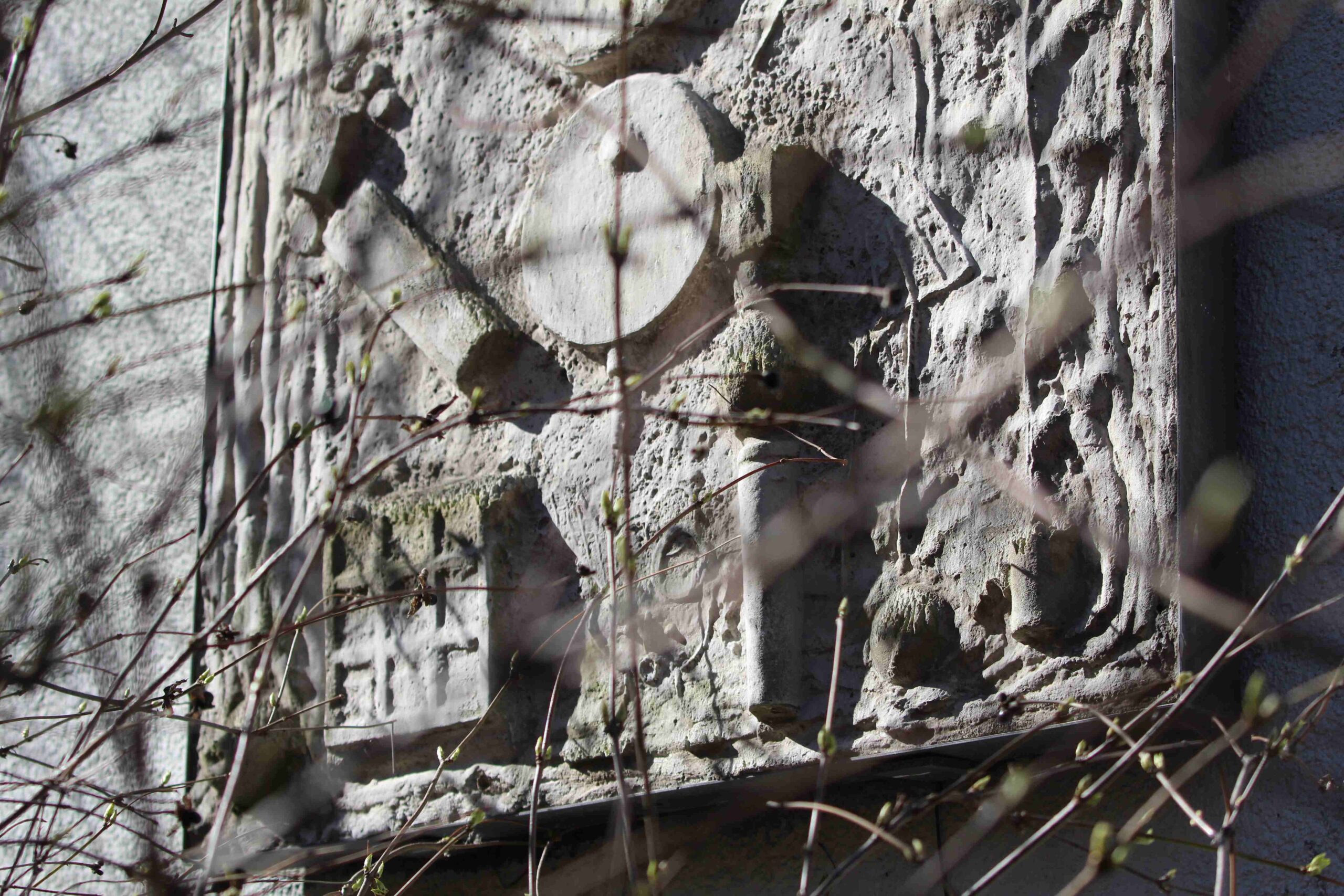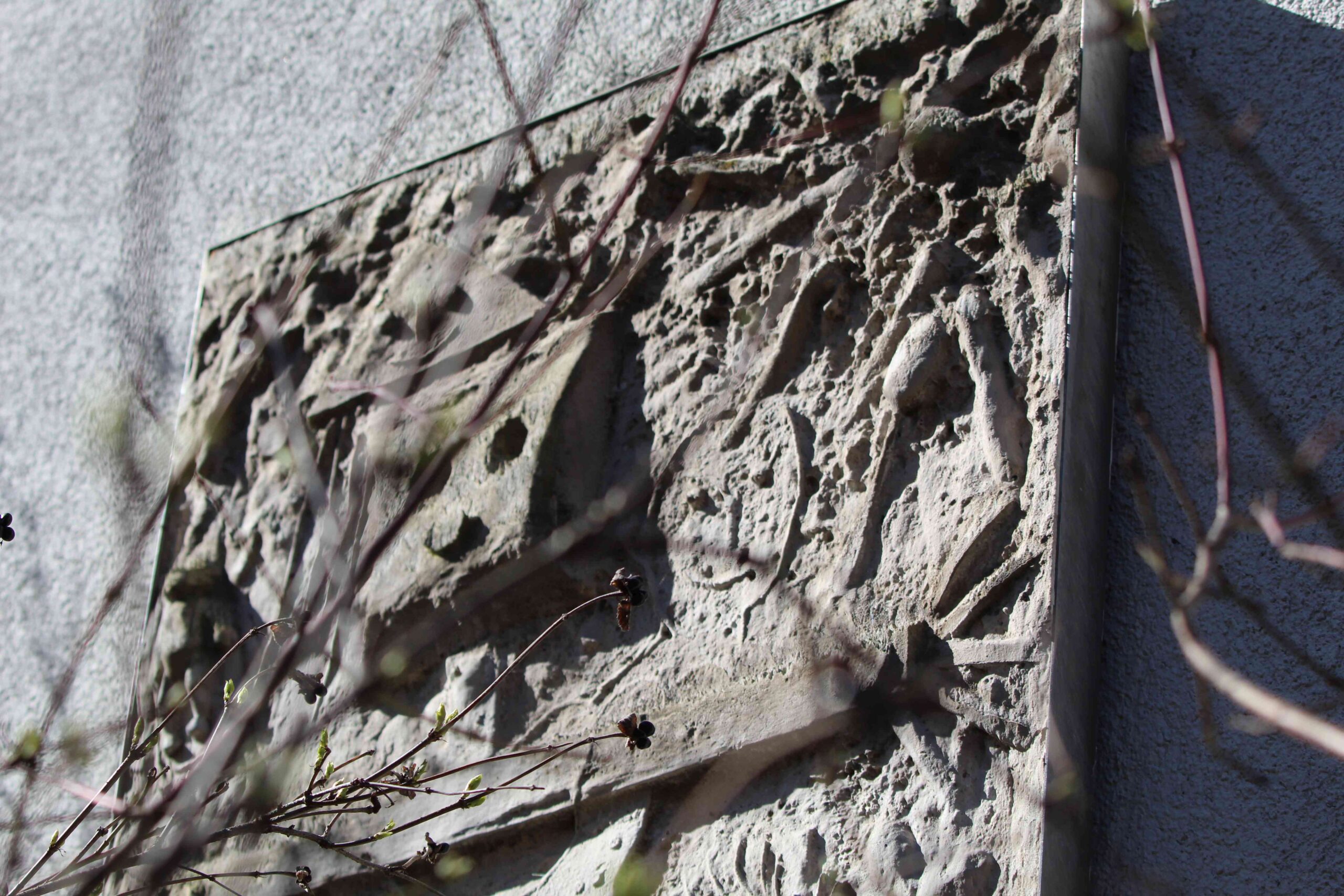 Der Gips des Reliefs ist grau und weist eine deutliche Oberflächenstruktur auf. Die Figur setzt sich aus abstrakten Formen zusammen, die unterschiedliche Materialien und Gegenstände darstellen. Damit erinnert das Relief an das Prinzip der Materialcollage.