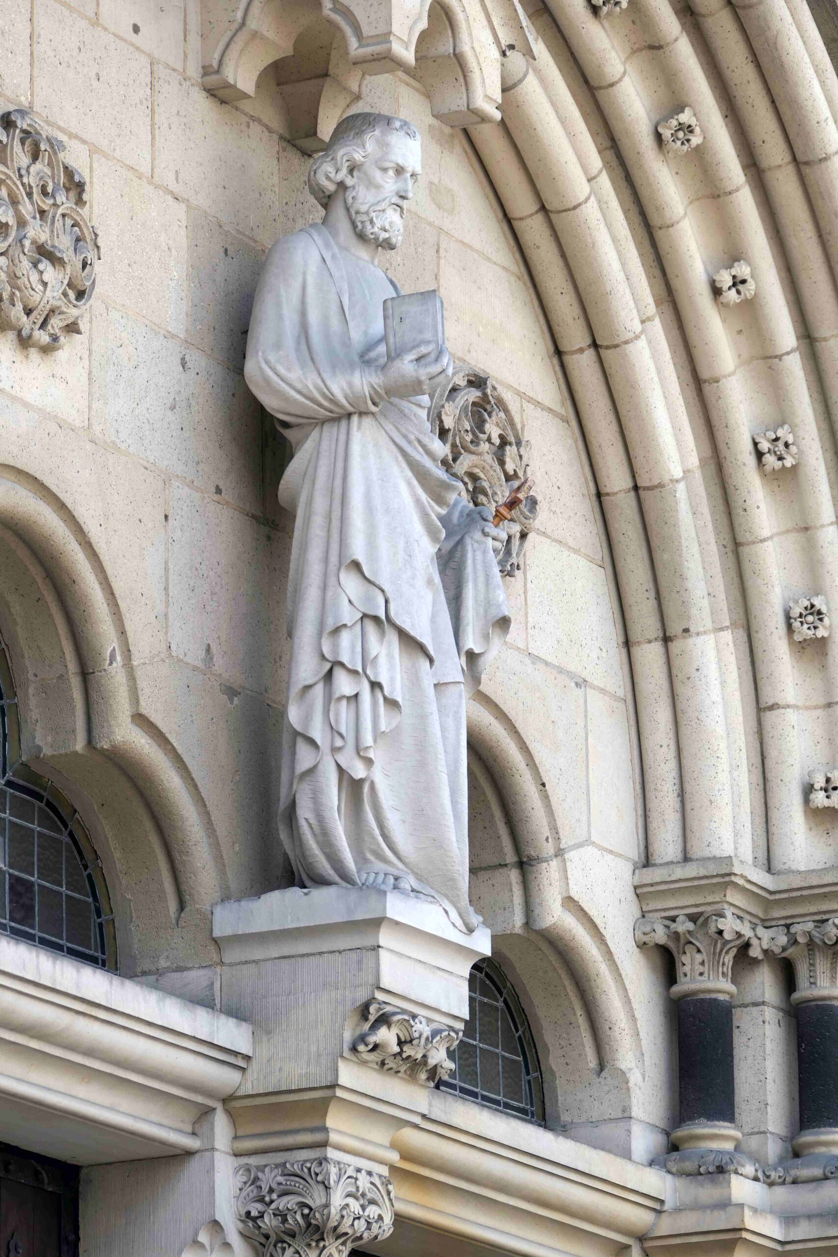 Für die Gestaltung der „figürlichen“ Arbeiten an der Kirche ist nur der Kölner Bildhauer Alexander Iven überliefert, der deshalb auch als Schöpfer dieser Portalfigur benannt werden kann.