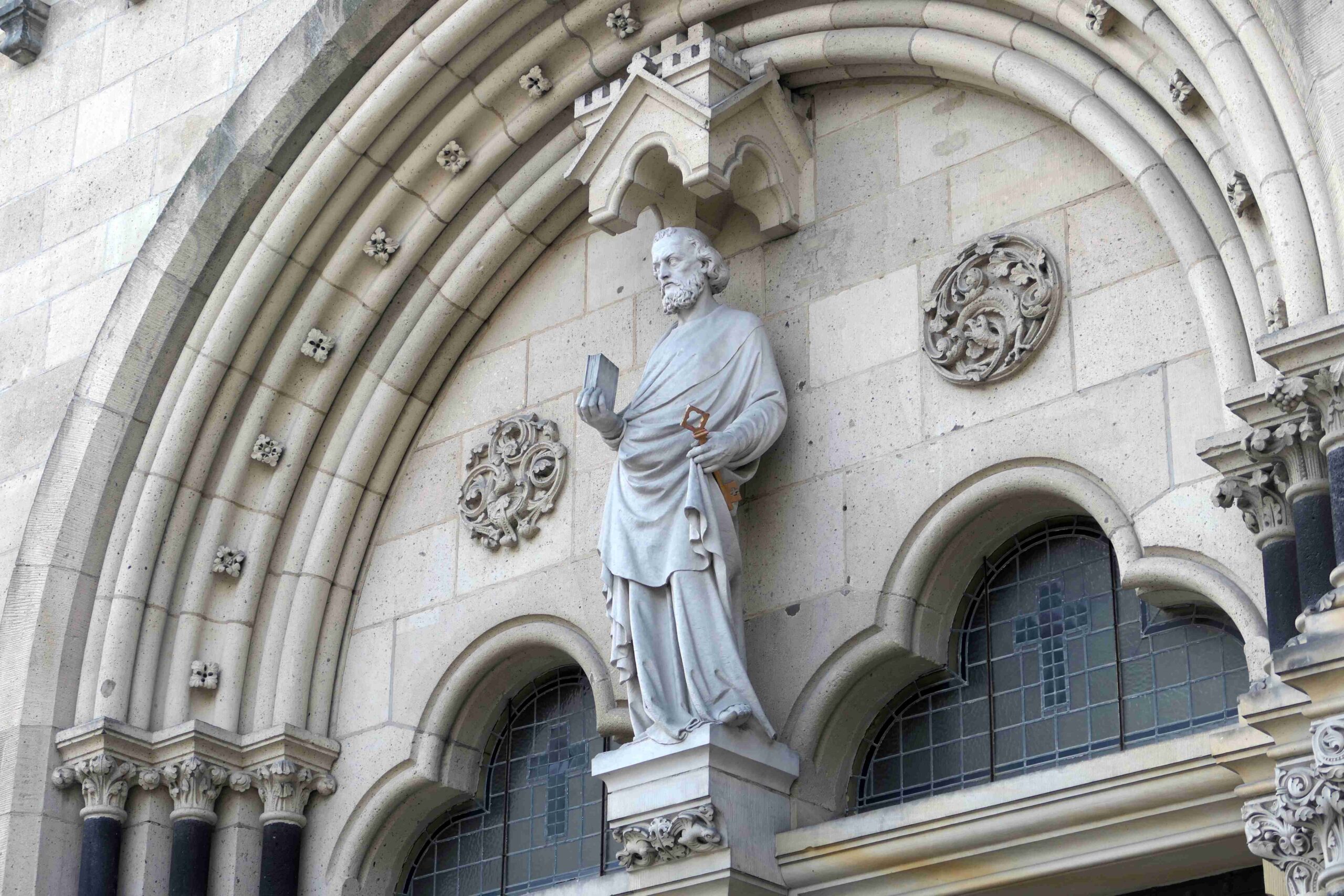 Am Nordportal der Johannes-Basilika steht oberhalb des Querhausportals die ca. lebensgroße Statue des Apostel Petrus. Er ist dargestellt als bärtiger Mann im mittleren Alter, der in der linken Hand einen vergoldeten Schlüssel und in der erhobenen Rechten ein Buch hält, das auf das Evangelium verweist (Nicola Vösgen).