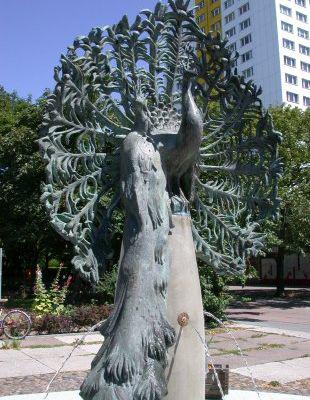 Der Pfauenbrunnen zeigt drei überlebensgroße, aber recht naturnah formulierte Pfauen aus Bronze, die in dekorativer Aufstellung eine gebauchte Natursteinsäule bekrönen. Diese steht in der Mitte eines flachen Beckens. Die Tiere sind in der guten Tradition der an Tierplastikern reichen Berliner Bildhauerschule des 19. und 20. Jahrhunderts gestaltet. Die Details sind durch summarisches Zusammenfassen geglättet, die natürlichen Gegebenheiten, wie die extrem dekorativen Schwanzfedern des mittleren, Rad schlagenden Pfauenhahns, ins Ornamentale stilisiert. Auf halber Höhe zeigt der Brunnenstock runde metallene Rosetten, die die Wasseraustrittrohre umrahmen (Jörg Kuhn).