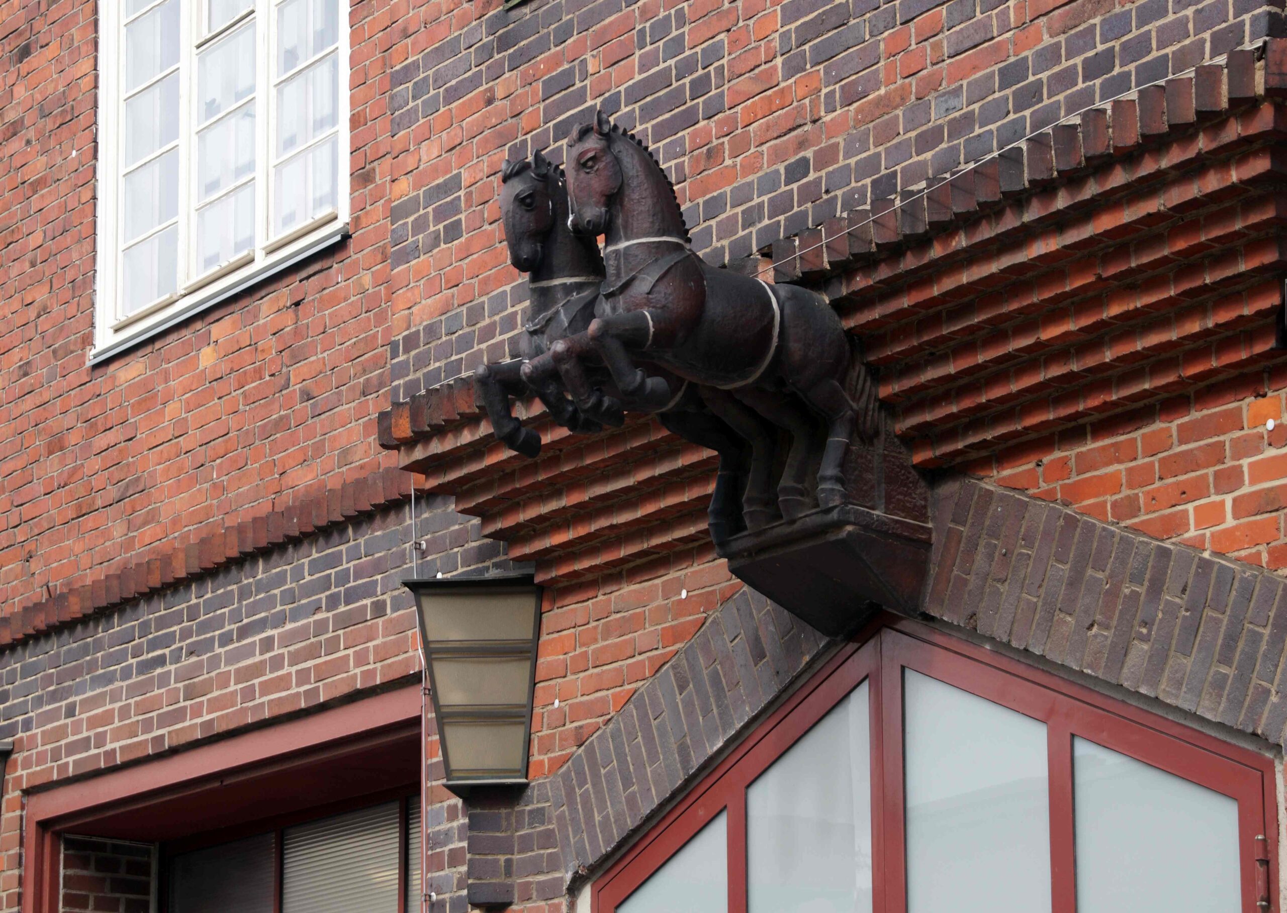 Das mittlere Wagentor der Feuerwache Spandau-Nord an der Triftstraße ist mit zwei aus der Fassade hervorspringenden, abstrakt gestalteten Pferden verziert (Nicola Vösgen).