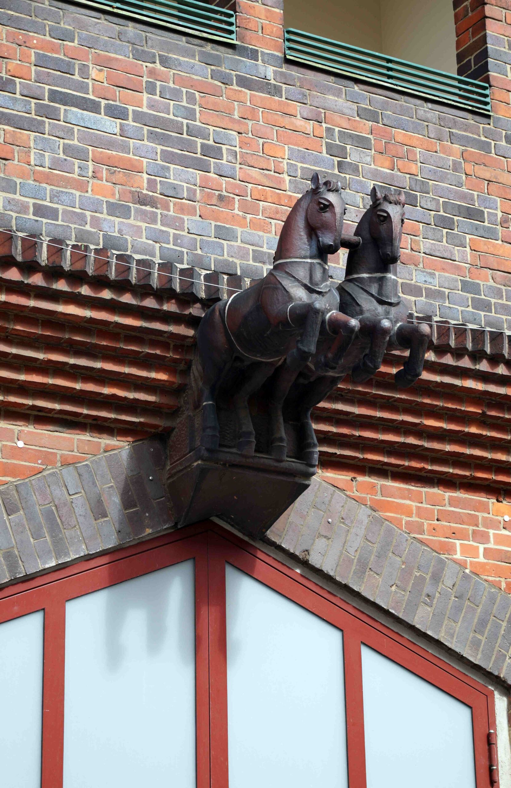 Das mittlere Wagentor der Feuerwache Spandau-Nord an der Triftstraße ist mit zwei aus der Fassade hervorspringenden, abstrakt gestalteten Pferden verziert (Nicola Vösgen).