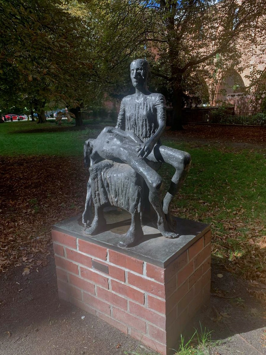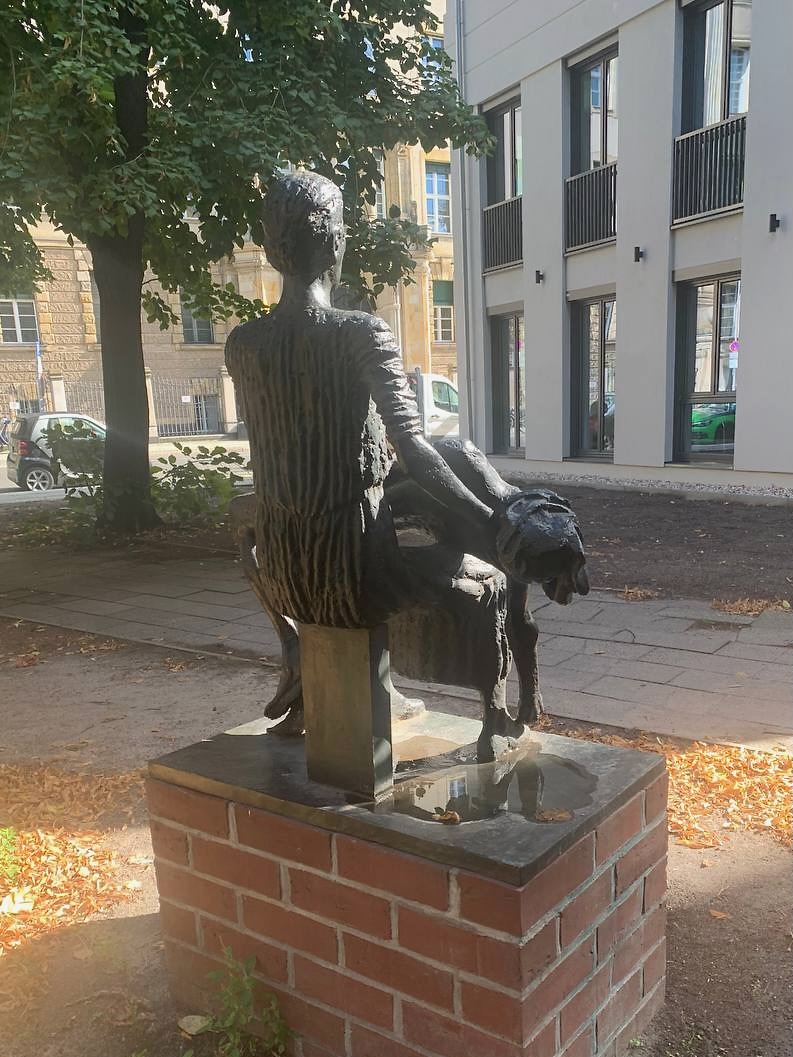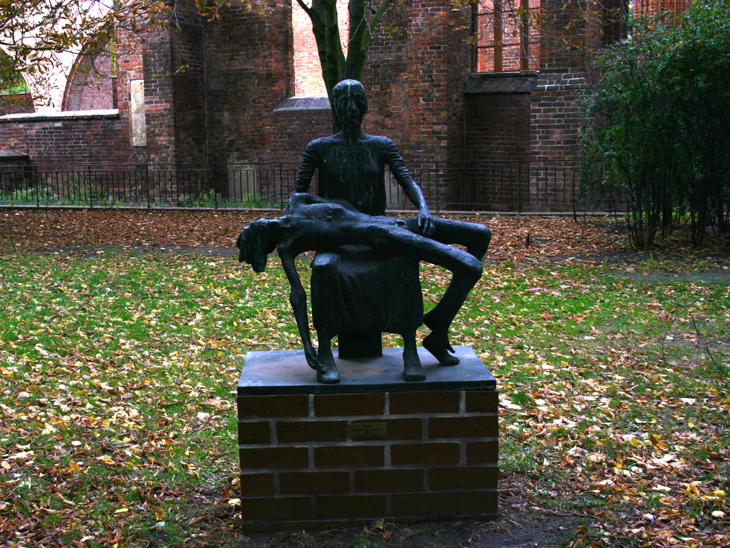 Auf einem rechteckigen roten Klinkersockel aufgestellte Figurengruppe in Gestalt einer frontal ausgerichteten Pietà aus dunkel patinierter Bronze über rechteckiger Plinthe. Auf einer schmalen glatten Stele sitzt eine überschlanke ältere Frau. Ihr trauriges Gesicht ist stark versehrt. Die rechte Gesichtshälfte zeigt eine Verwundung, wie sie von den Kriegsversehrtenporträts Ferdinand Sauerbruchs her bekannt sind. Sie trägt eine streng frisierte Haartracht und ein einfach gegürtetes, antikisierend formuliertes Kleid, jedoch abstrahiertes, modernes Schuhwerk. Auf ihren Knien liegt ein schmaler, unbekleideter, toter Jüngling, den Kopf mit einem Tuch verhüllt; die überschlanken Beine hängen unten gekreuzt rechts herab. Die Figurengruppe zeigt eine sparsam aufgeraute Oberfläche, die im Kontrast zur glatten Sitzstele und der Plinthe steht (Jörg Kuhn).