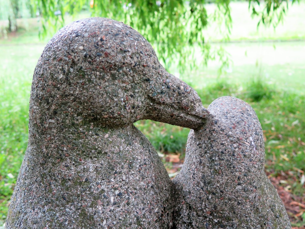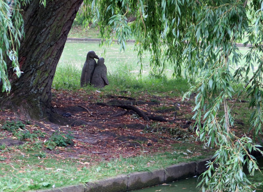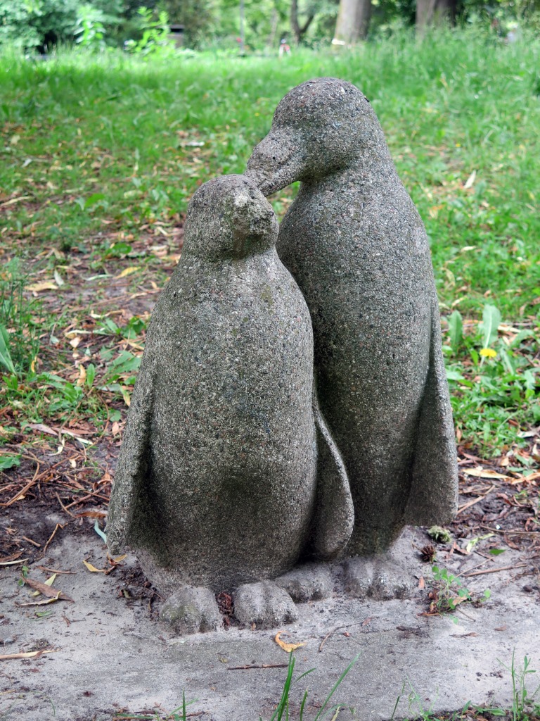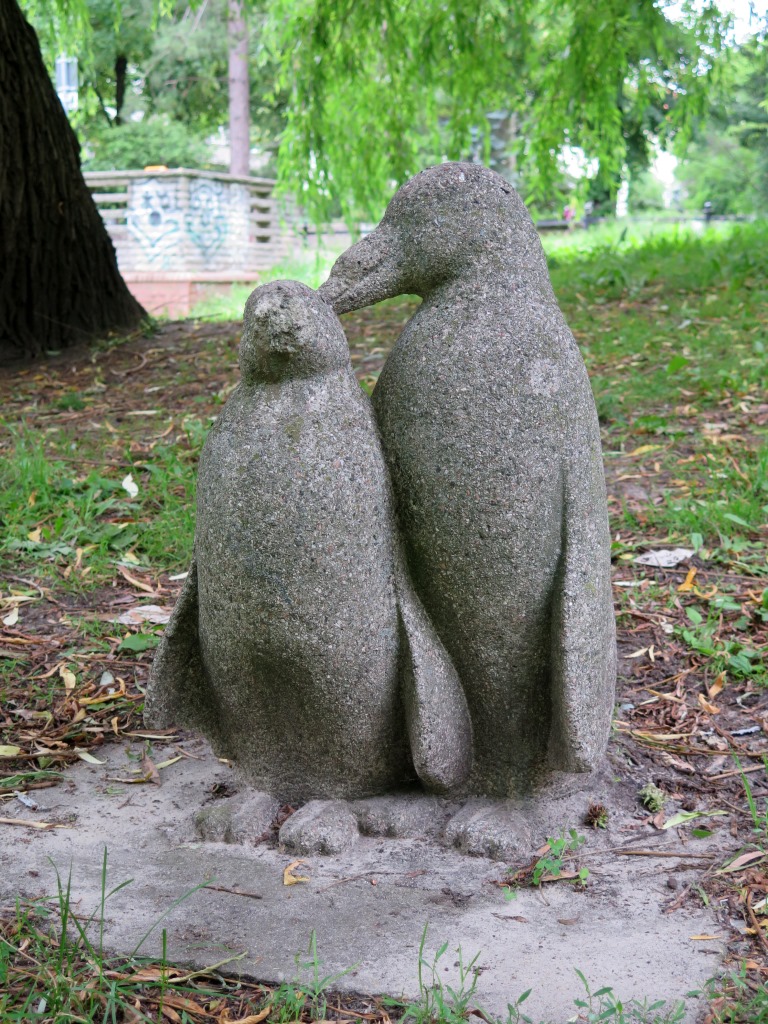 Ein Pinguinpärchen befindet sich am östlichen Ufer des Teiches im Stadtpark Lichtenberg, südlich der Aussichtsplattform unter einer Trauerweide. Die naturalistisch gestalteten, etwa lebensgroßen Tiere stehen eng aneinandergeschmiegt nebeneinander. Das rechts stehende, etwas größere Tier, scheint dem Kleineren das Gefieder an dessen Hinterkopf zu putzen (Nicola Vösgen).