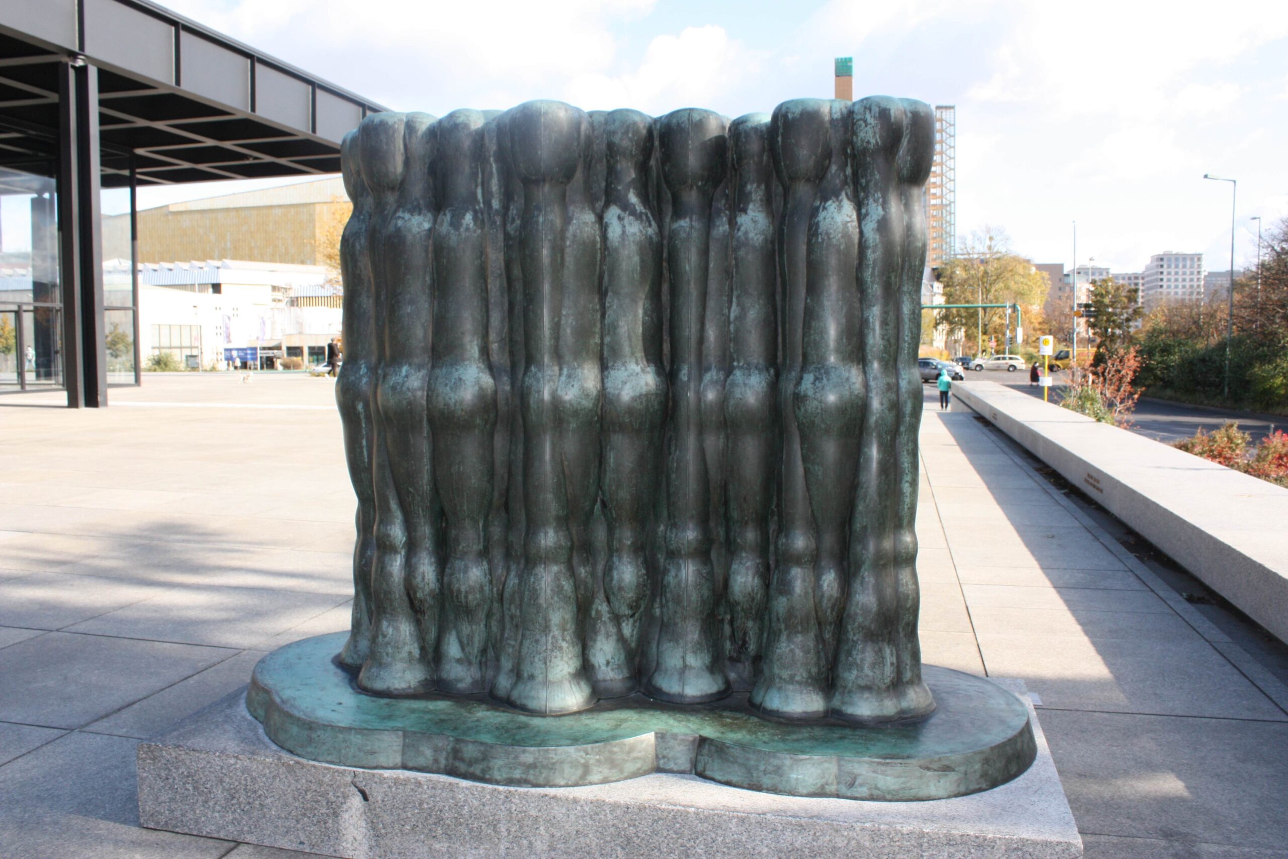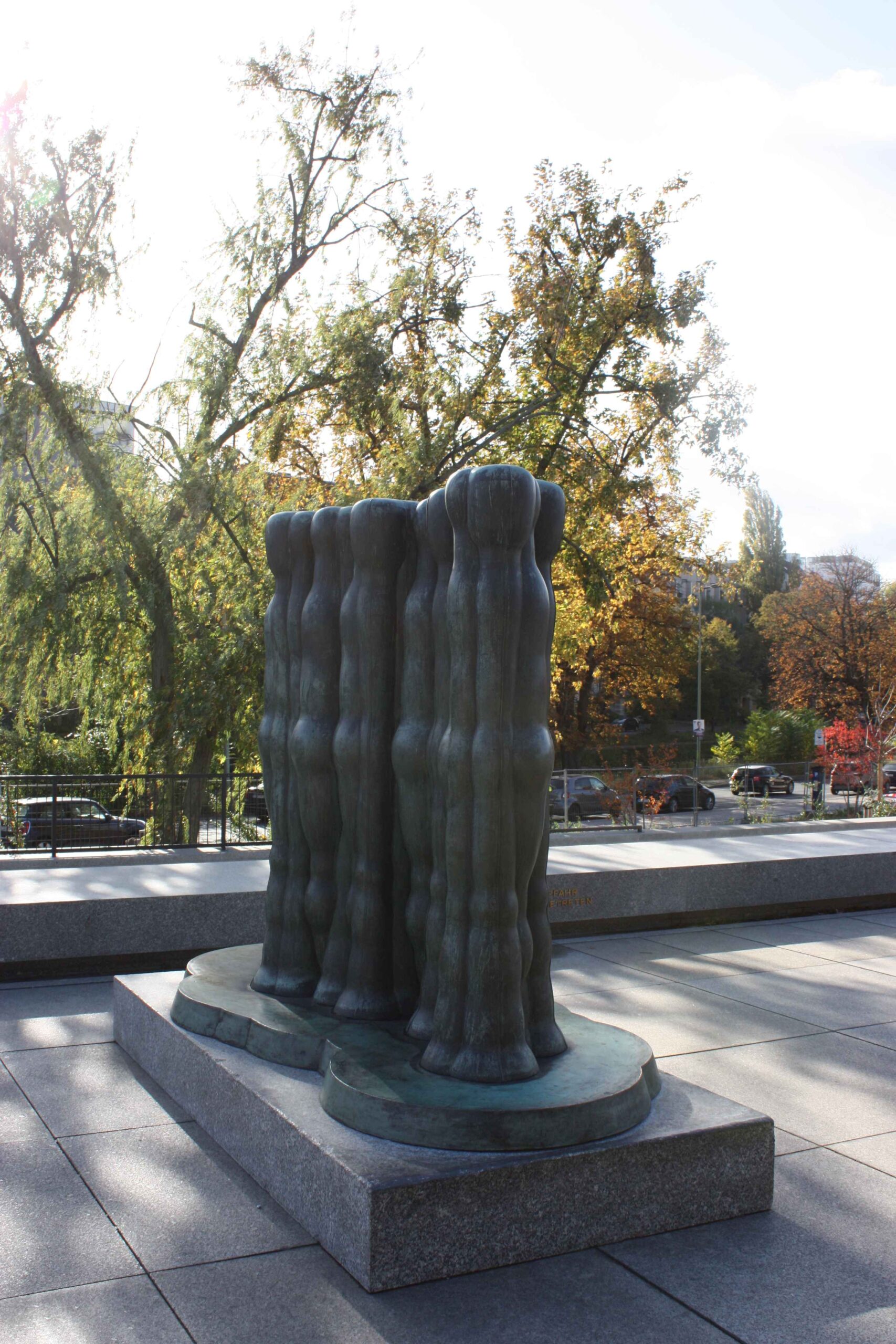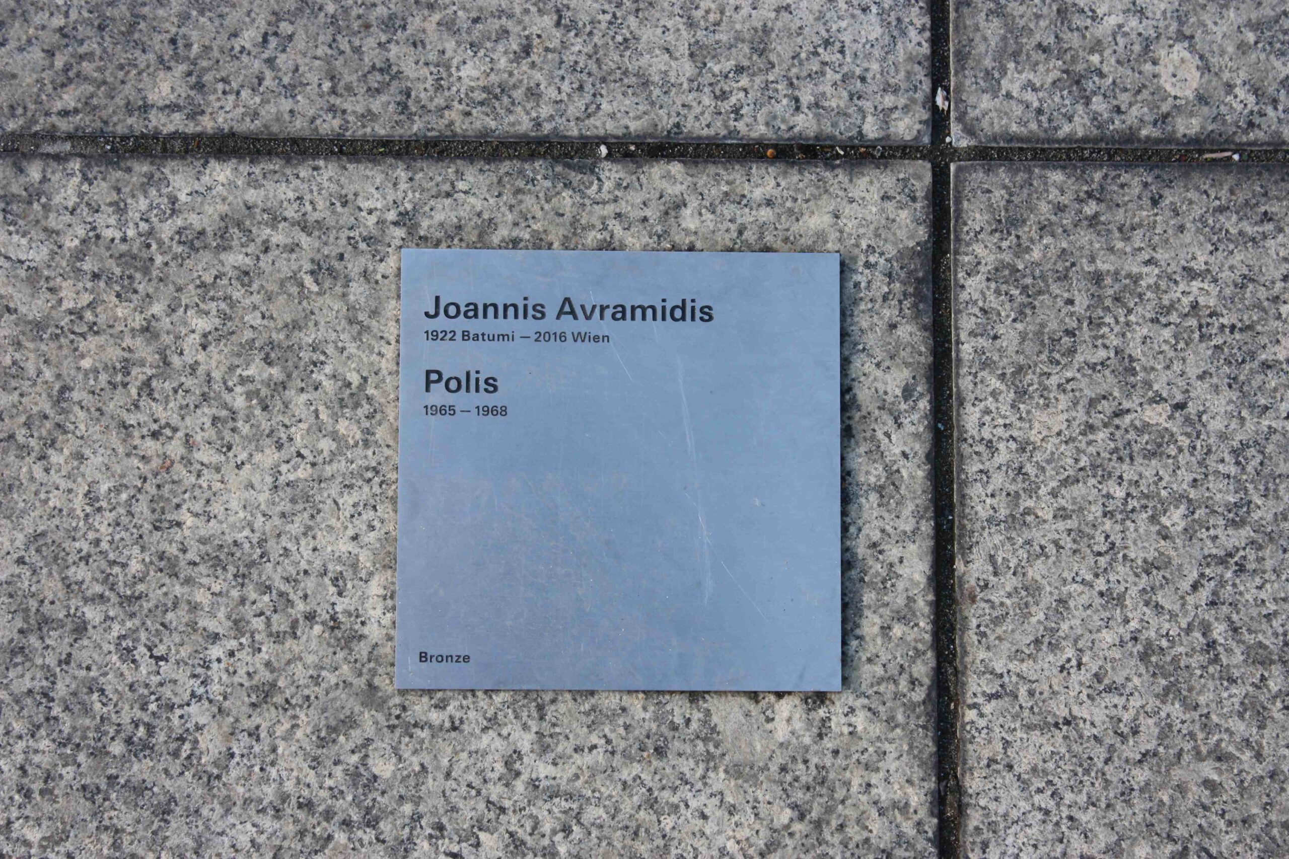 Aufstellung 1970. Der Begriff „Polis“ – Titel dieser Plastik - ist die griechische Bezeichnung für Stadtstaat. Er wird bei der Lesart des fast gänzlich abstrakten Kunstwerks als Ansammlung dicht aneinander gedrängter Menschen plausibel. Die 1970 aufgestellte Skulptur aus dem Jahre 1968 ist charakteristisch für das Oeuvre ihres Urhebers. Die schematische Gliederung des menschlichen Körpers erinnert sowohl an das Werk von Avramides’ Lehrer Fritz Wotruba, es lässt aber gleichfalls an die Arbeiten des Bauhauskünstlers Oskar Schlemmer denken (Susanne Kähler).