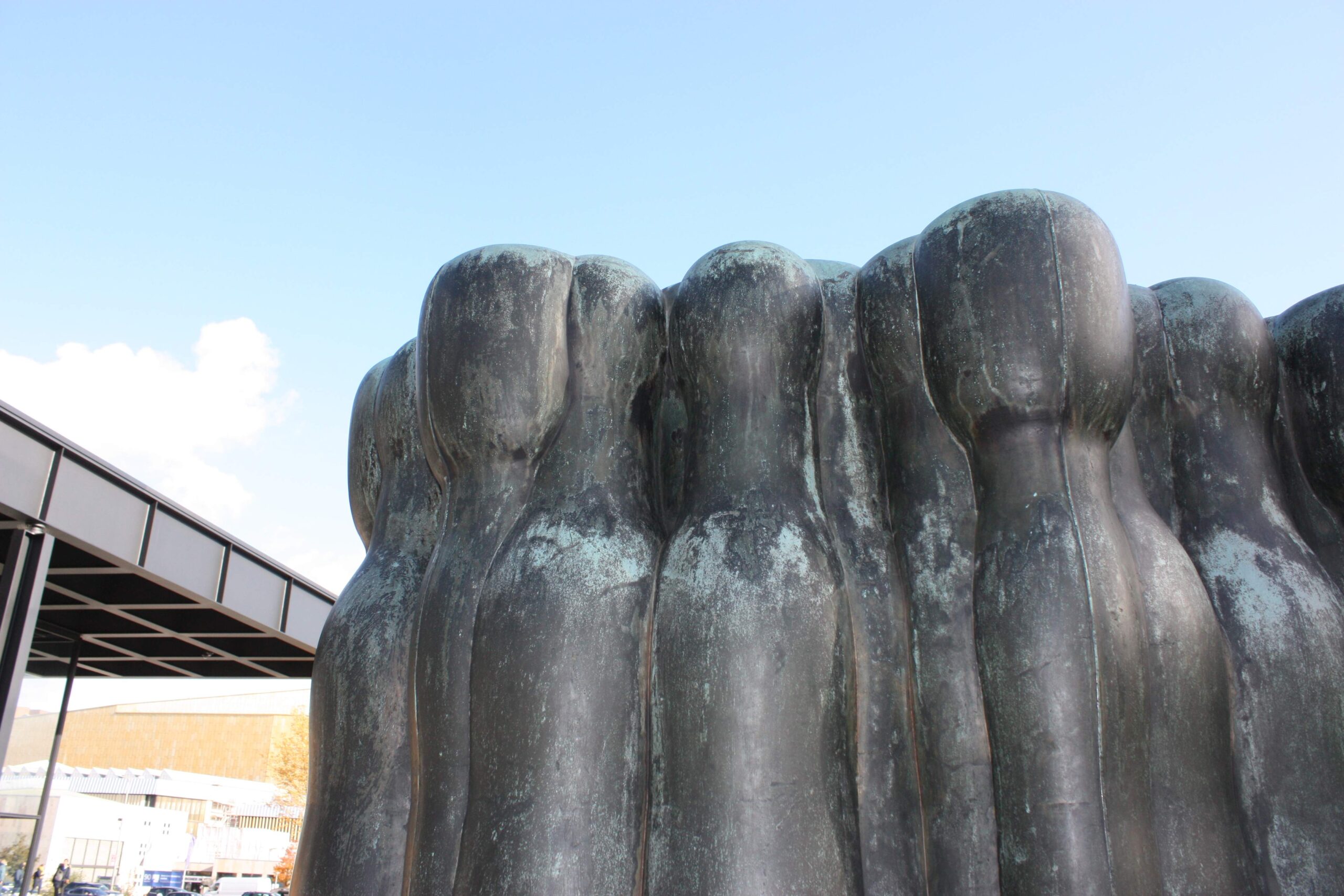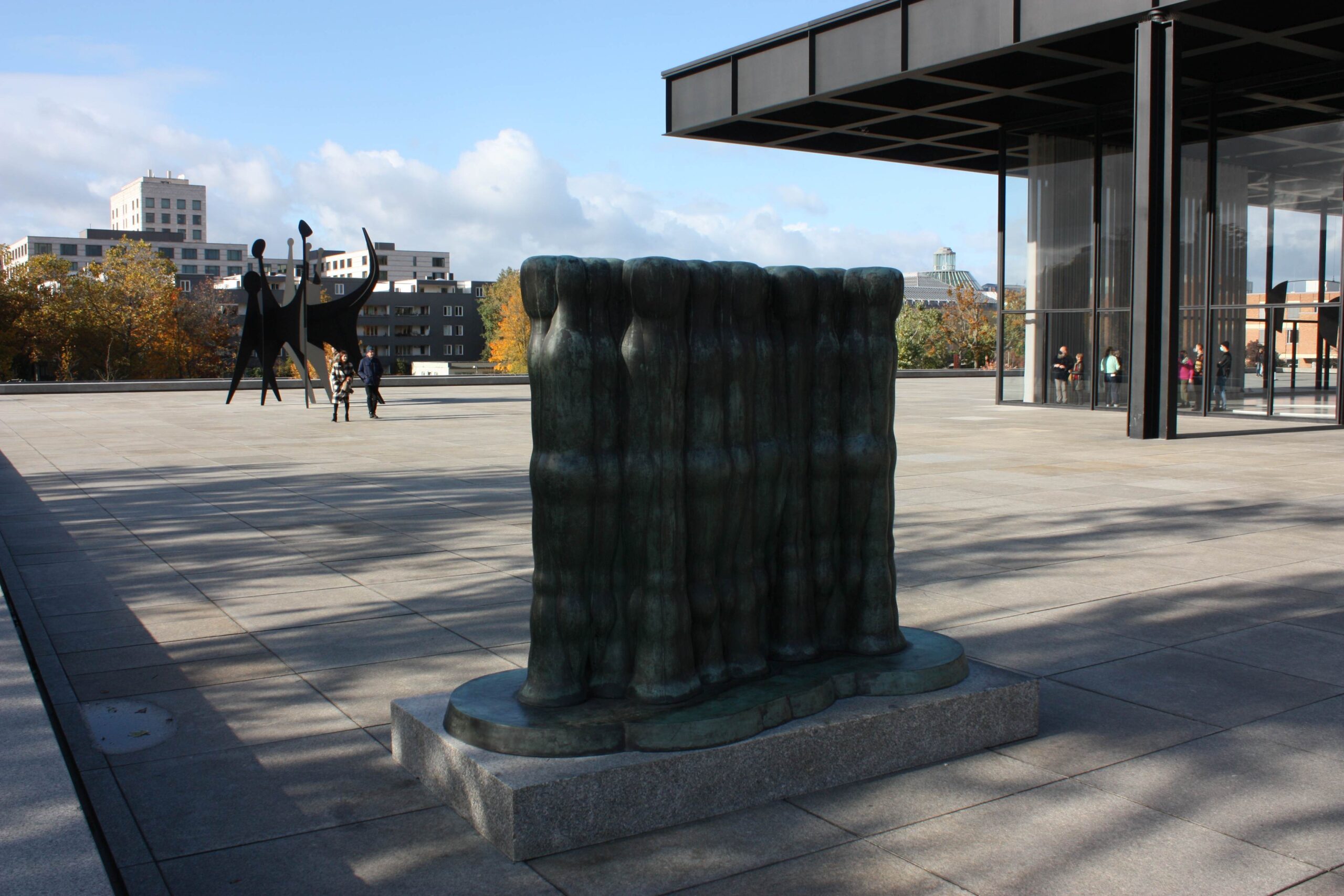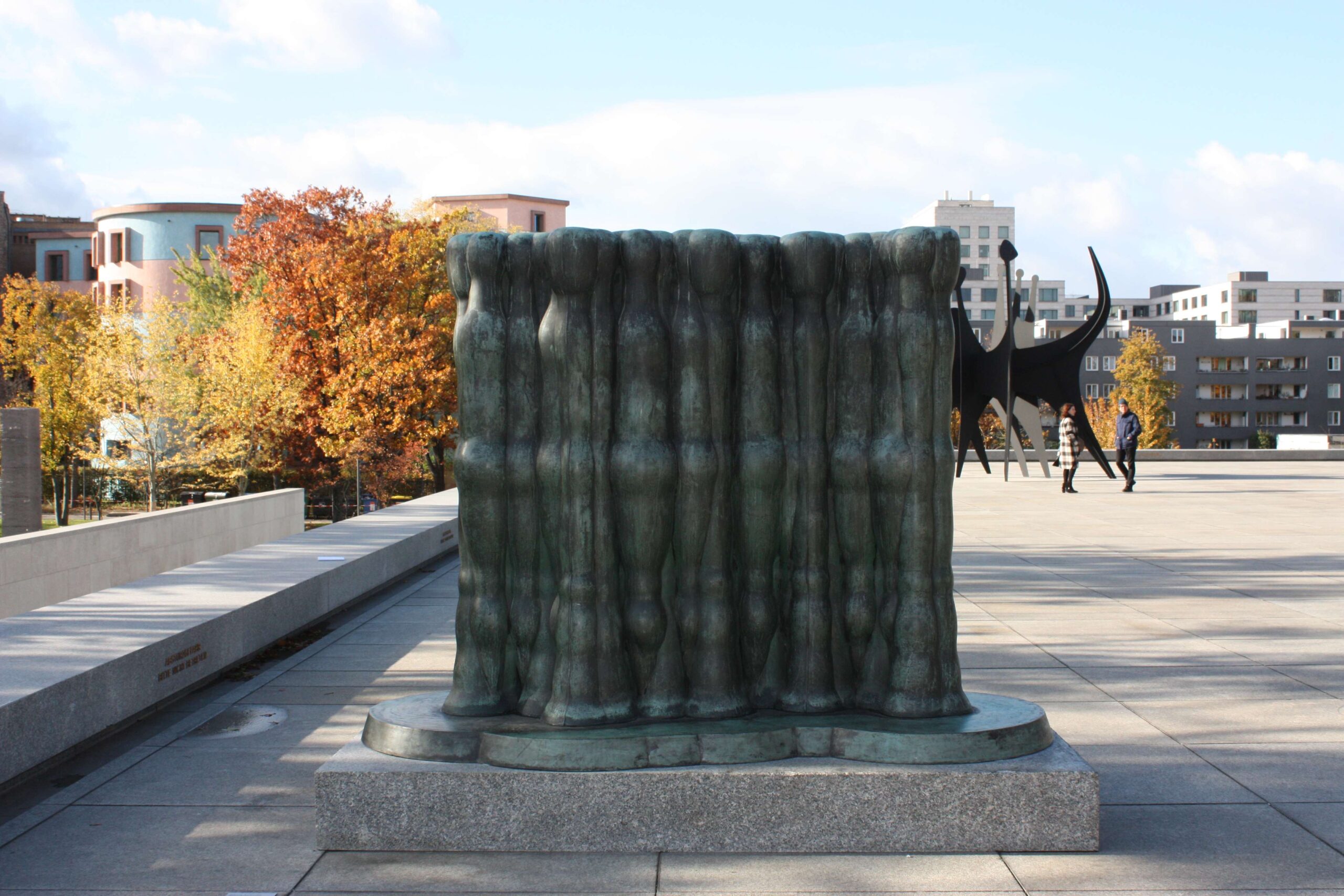 Aufstellung 1970. Der Begriff „Polis“ – Titel dieser Plastik - ist die griechische Bezeichnung für Stadtstaat. Er wird bei der Lesart des fast gänzlich abstrakten Kunstwerks als Ansammlung dicht aneinander gedrängter Menschen plausibel. Die 1970 aufgestellte Skulptur aus dem Jahre 1968 ist charakteristisch für das Oeuvre ihres Urhebers. Die schematische Gliederung des menschlichen Körpers erinnert sowohl an das Werk von Avramides’ Lehrer Fritz Wotruba, es lässt aber gleichfalls an die Arbeiten des Bauhauskünstlers Oskar Schlemmer denken (Susanne Kähler).