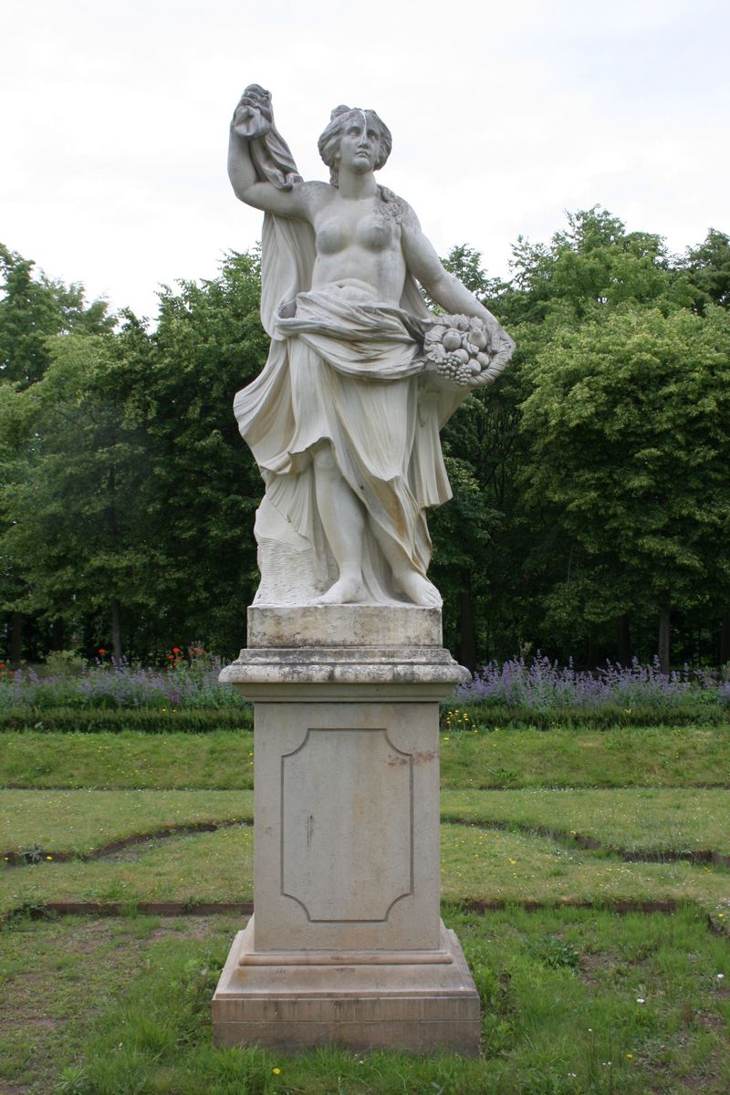 Standbild einer weiblichen Göttin mit Füllhorn voller Früchte des Gartens.