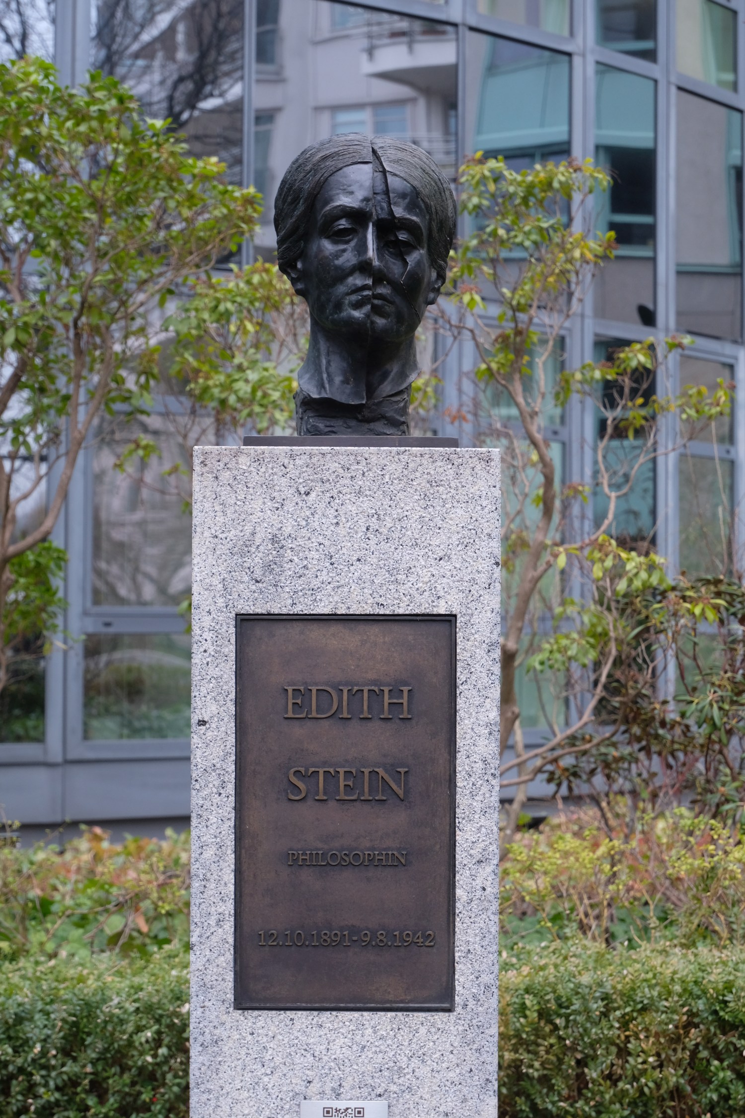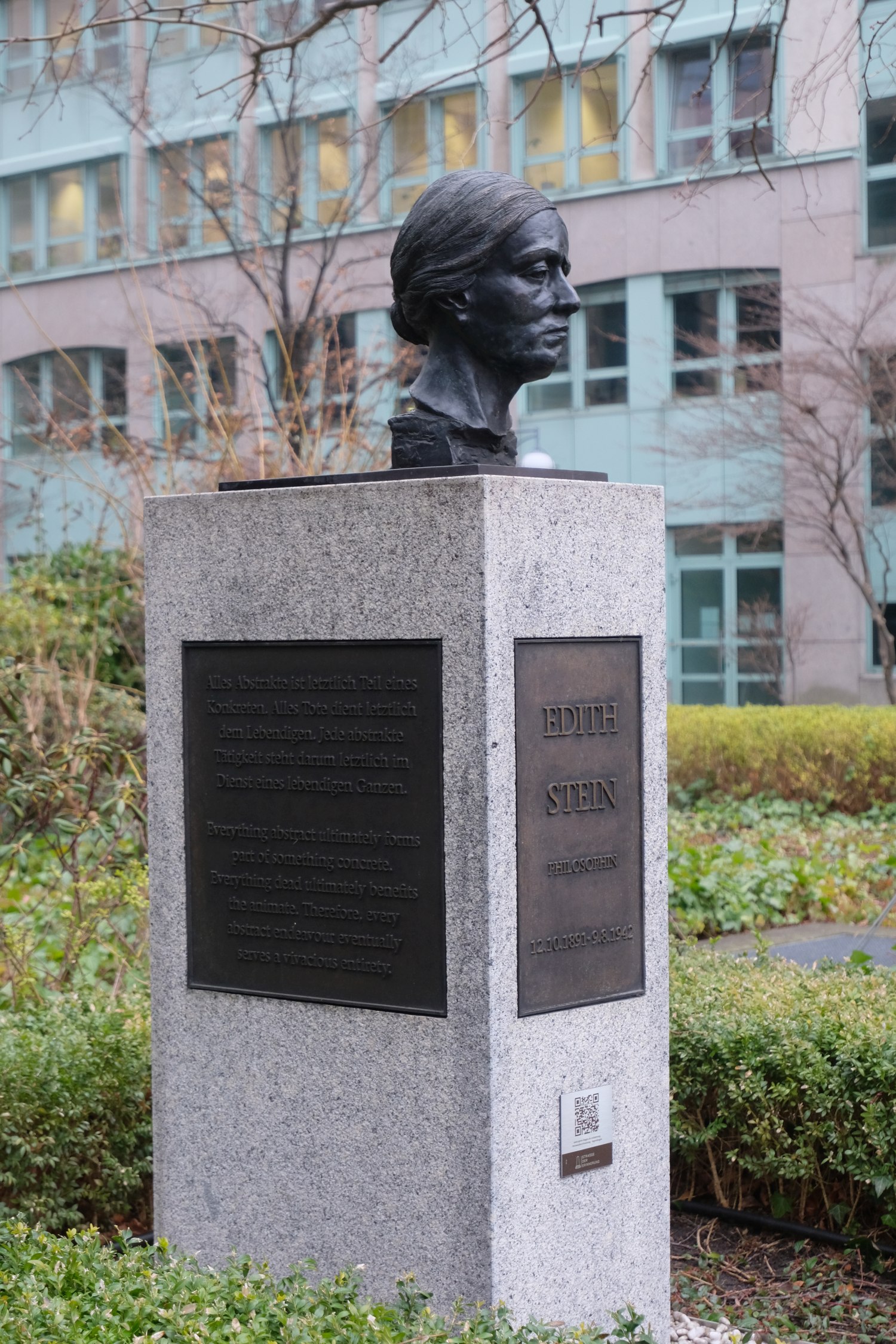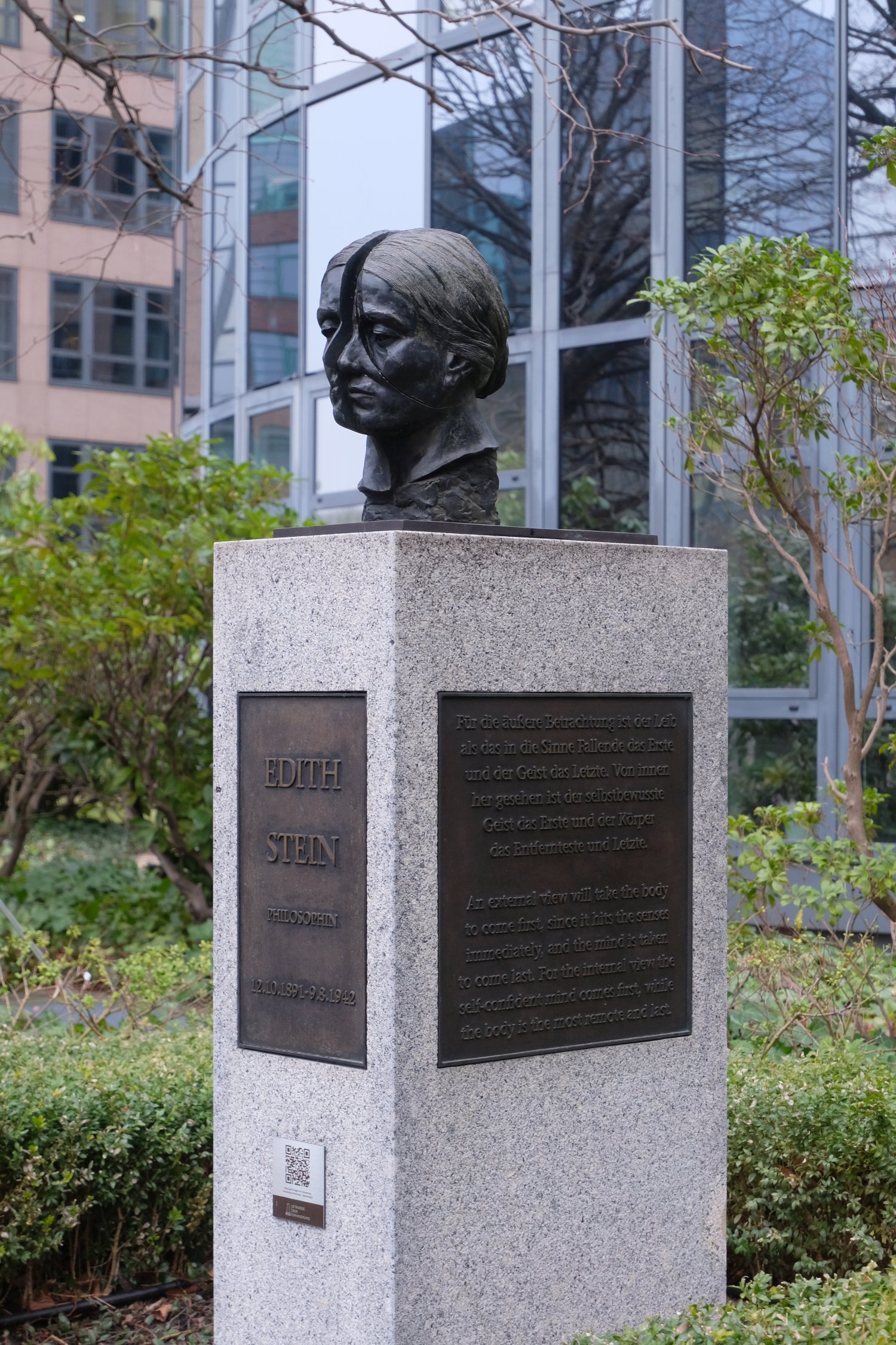 Edith Stein (geb. 12.08.1891; gest. 09.08.1942) war eine Frauenrechtlerin und Philosophin jüdischer Herkunft, welche 1922 zur katholischen Kirche konvertierte und in dieser ebenfalls lehrte. 1933 erhielt sie von den Nationalsozialisten ein Lehrverbot. Sie wurde am 02.08.1942 von der Gestapo verhaftet und später im KZ Auschwitz ermordet. In der Kirche wird sie als Mittlerin zwischen Christen und Juden, sowie als Märtyrerin geachtet und wurde aufgrund ihres Einsatzes 1987 erst selig und 1989 von Papst Johannes Paul II. heilig gesprochen (vgl. "Strasse der Erinnerung", in: Spree-Bogen, o. D., https://spree-bogen.de/strasse-der-erinnerung/). Die Porträtbüste ist Teil einer Denkmalanlage der Ernst-Freiberger-Stiftung am Spreebogen, die den Namen "Straße der Erinnerung" trägt und mit der "Persönlichkeiten [geehrt werden, die sich] durch herausragende wissenschaftliche Leistungen, besondere Beiträge zur künstlerischen Kultur Deutschlands oder durch mutiges und selbstloses Eintreten gegen staatliche Willkür [auszeichnen]." (Quelle: "Strasse der Erinnerung", in: Spree-Bogen, o. D., https://spree-bogen.de/strasse-der-erinnerung/).