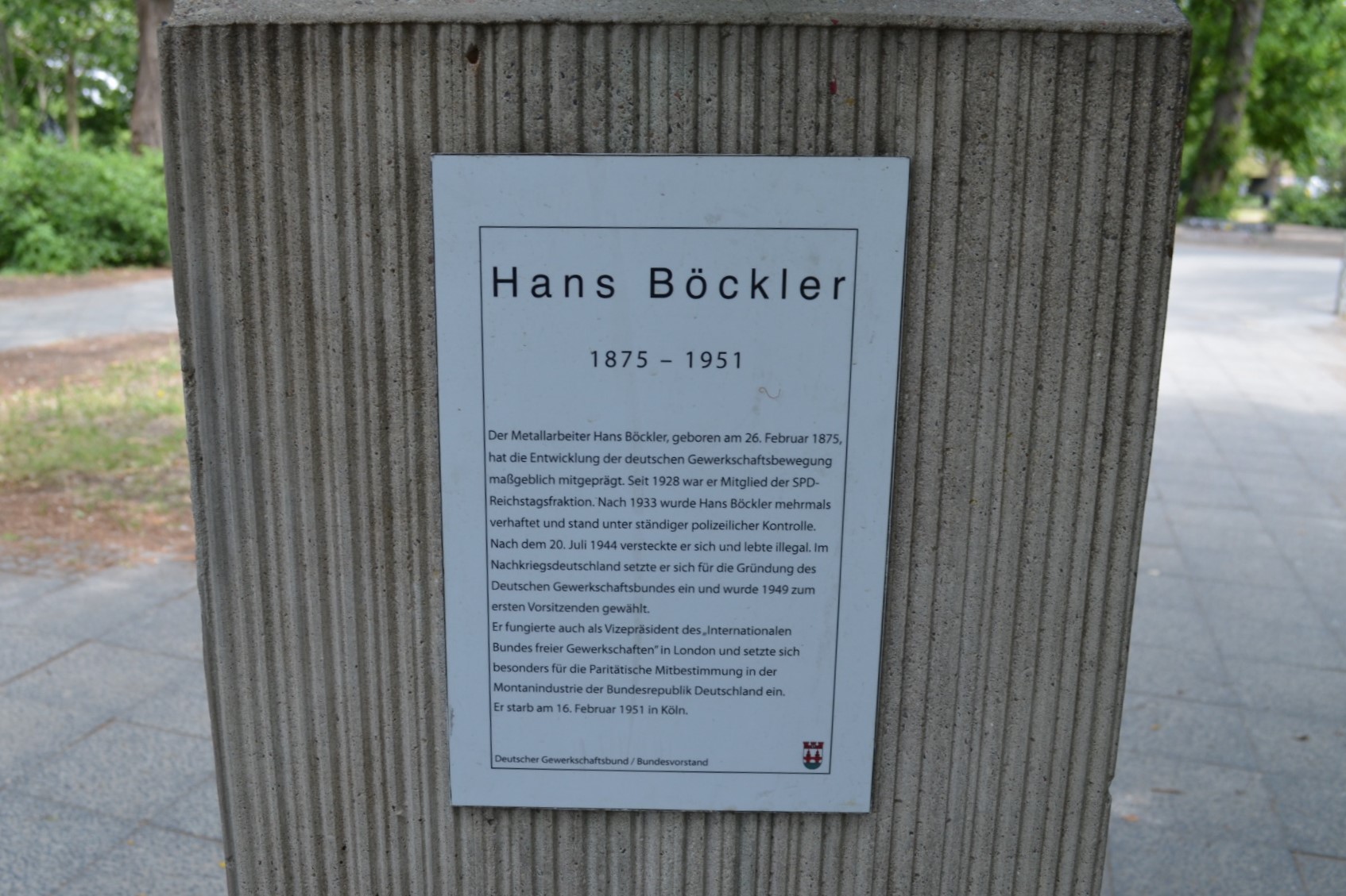 »Hans Böckler / 1875-1951 / Der Metallarbeiter Hans Böckler, geboren am 26. 2.1875 / hat die Entwicklung der deutschen Gewerkschaftsbewegung / maßgeblich mitgeprägt. / Seit 1928 war er Mitglied der SPD-Reichstagsfraktion. / Nach 1933 wurde Hans Böckler mehrmals verhaftet / und stand unter ständiger polizeilicher Kontrolle. / Nach dem 20. Juli 1944 versteckte er sich und lebte illegal. / Im Nachkriegsdeutschland setzte er sich für die / Gründung des Deutschen Gewerkschaftsbundes ein / und wurde 1949 zum ersten Vorsitzenden gewählt. / Er fungierte auch als Vizepräsident des / "Internationalen Bundes freier Gewerkschaften" in London und setzte sich besonders für die / paritätische Mitbestimmung in der Montanindustrie ein. / Er starb am 16. Februar 1951 in Köln / Deutscher Gewerkschaftsbund«